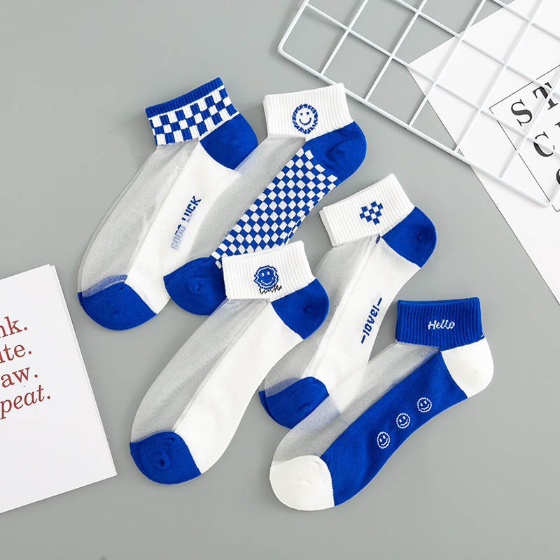 Ziyang 봄과 여름 새로운 짧은 튜브 여성 양말 클라인 블루 양말 일본 양말 얇은 크리스탈 스타킹 학생 보트 양말
