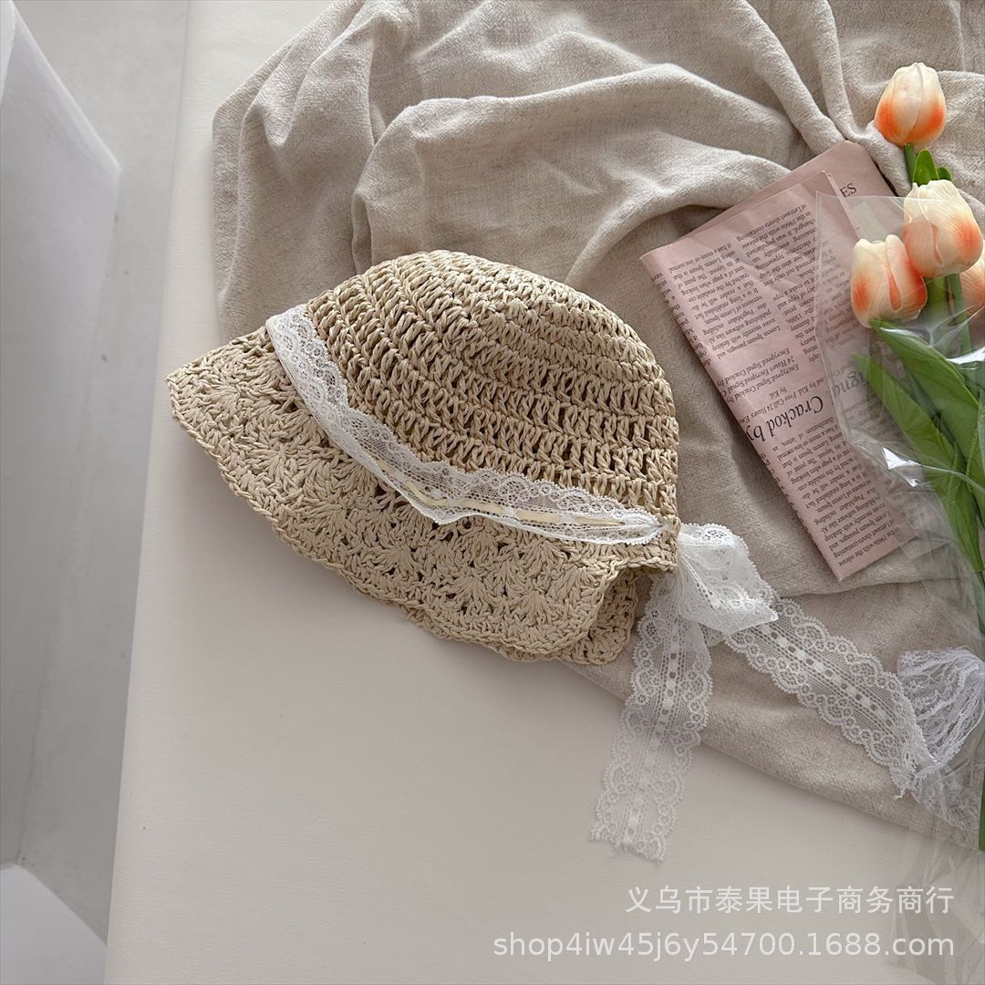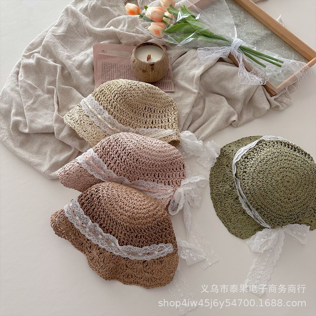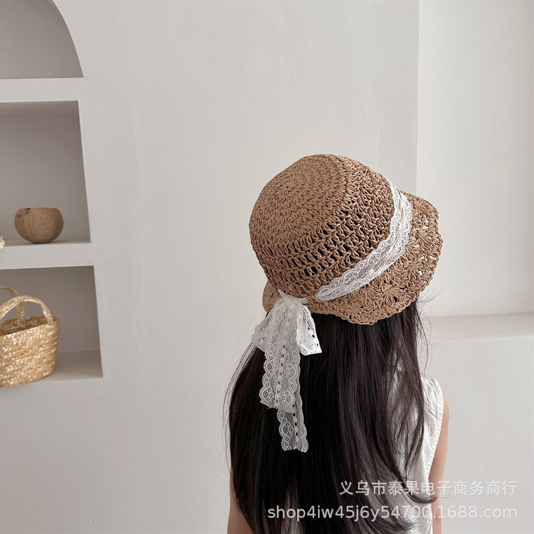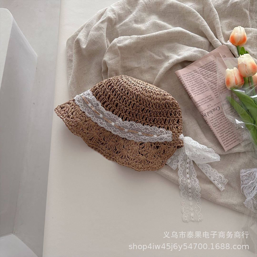 어린이 밀짚 모자 여름 통기성 레이스 보우 웨스턴 스타일 자외선 차단제 해변 차양 여아 아기 여아 큰 모자스토어 가기
