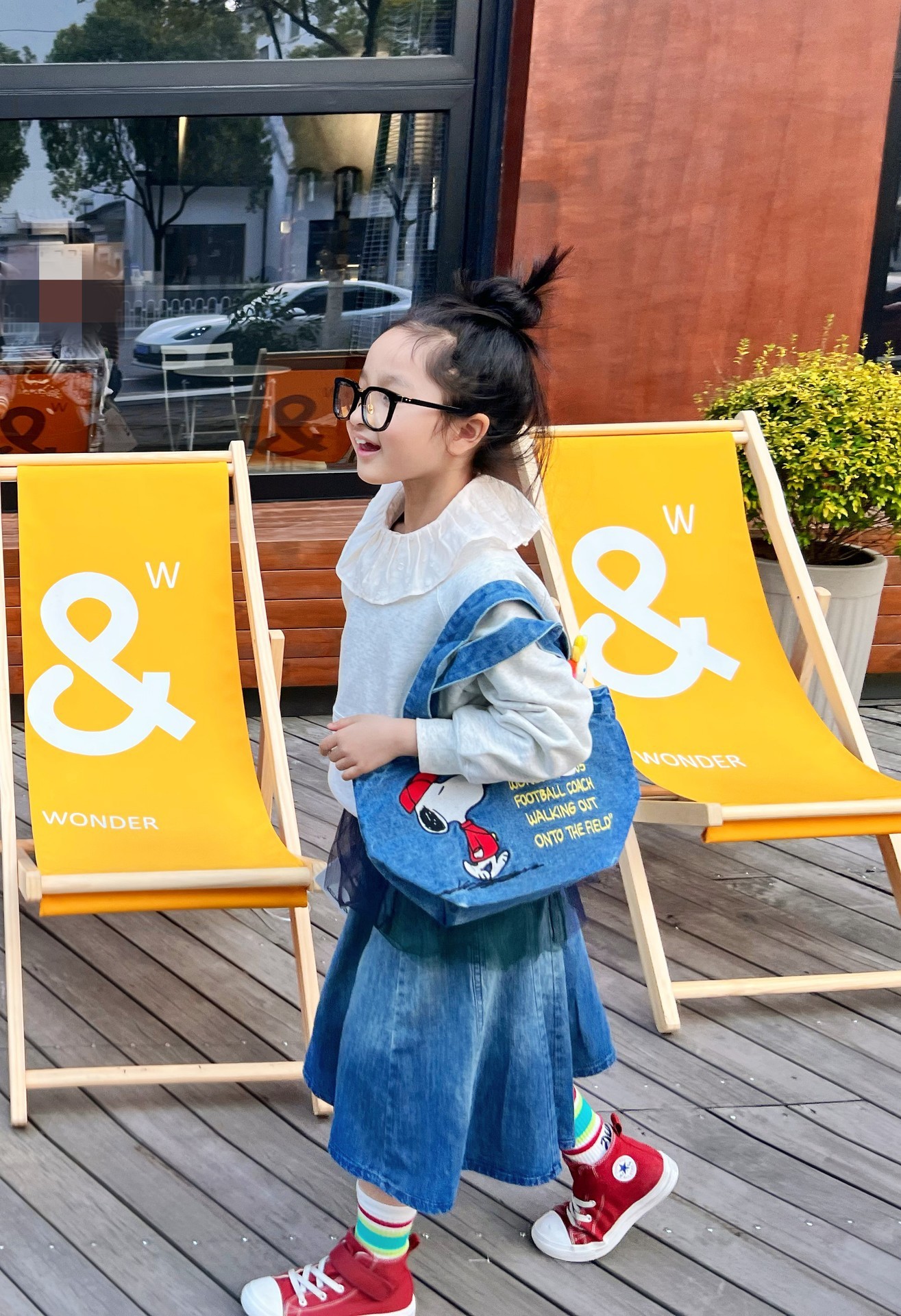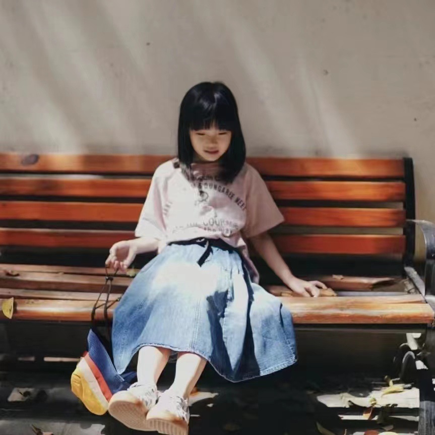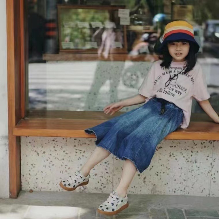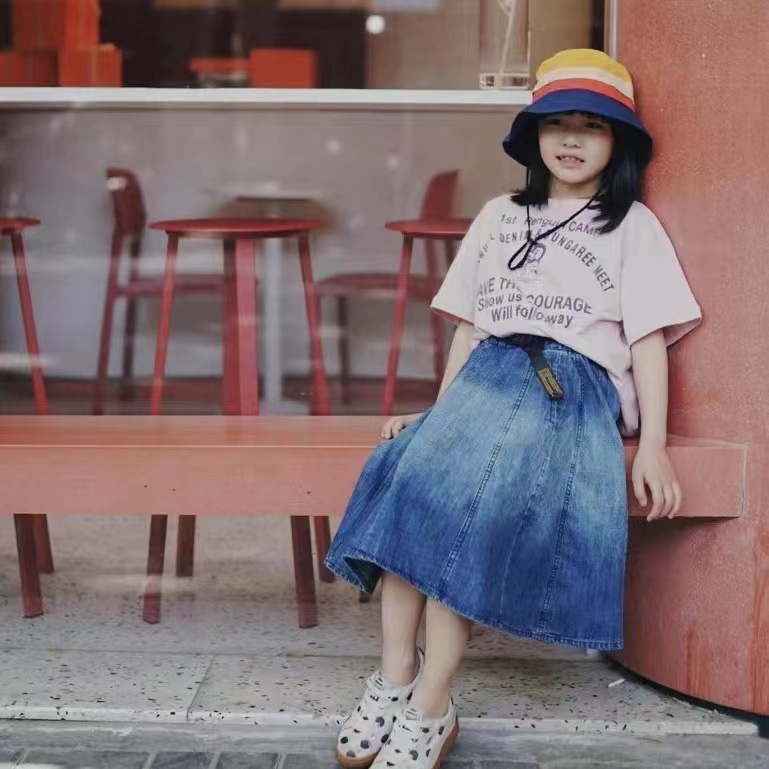 23SS 신작 여아 일본식 스플리싱 데님 스커트 여아 신축성 있는 허리 중간 길이 스커트 부모-자식 스타일 재고 있음스토어 가기