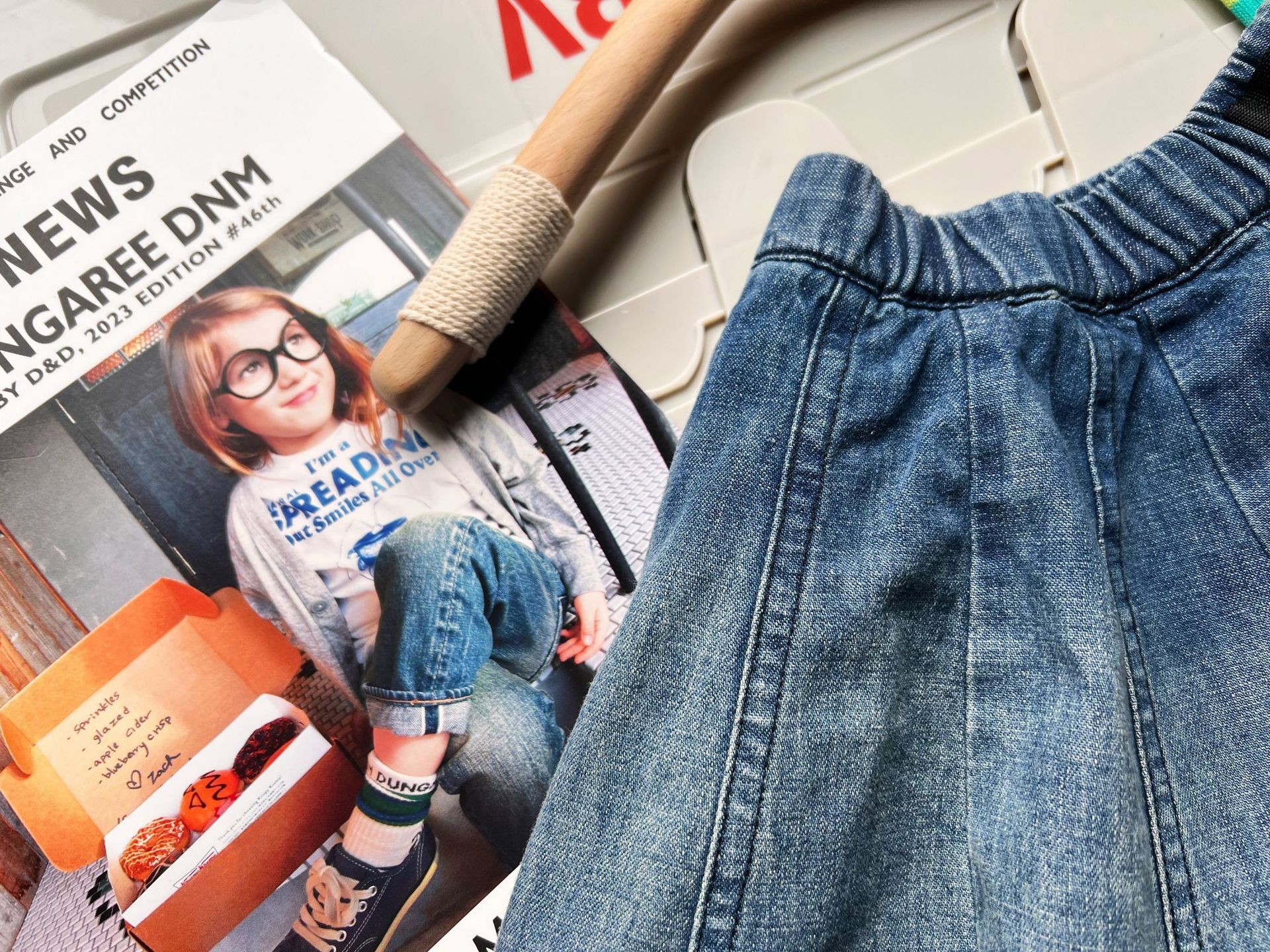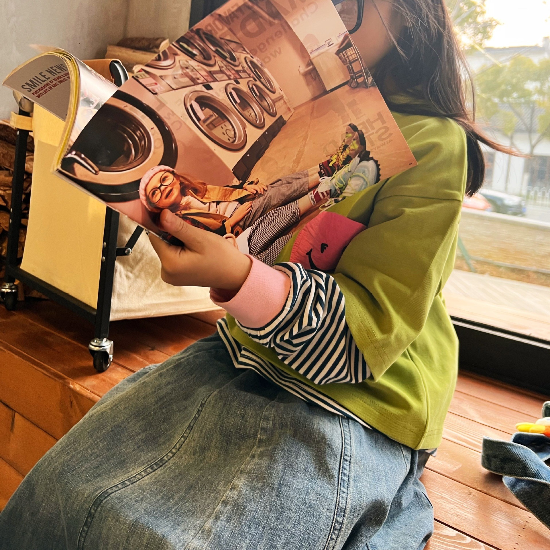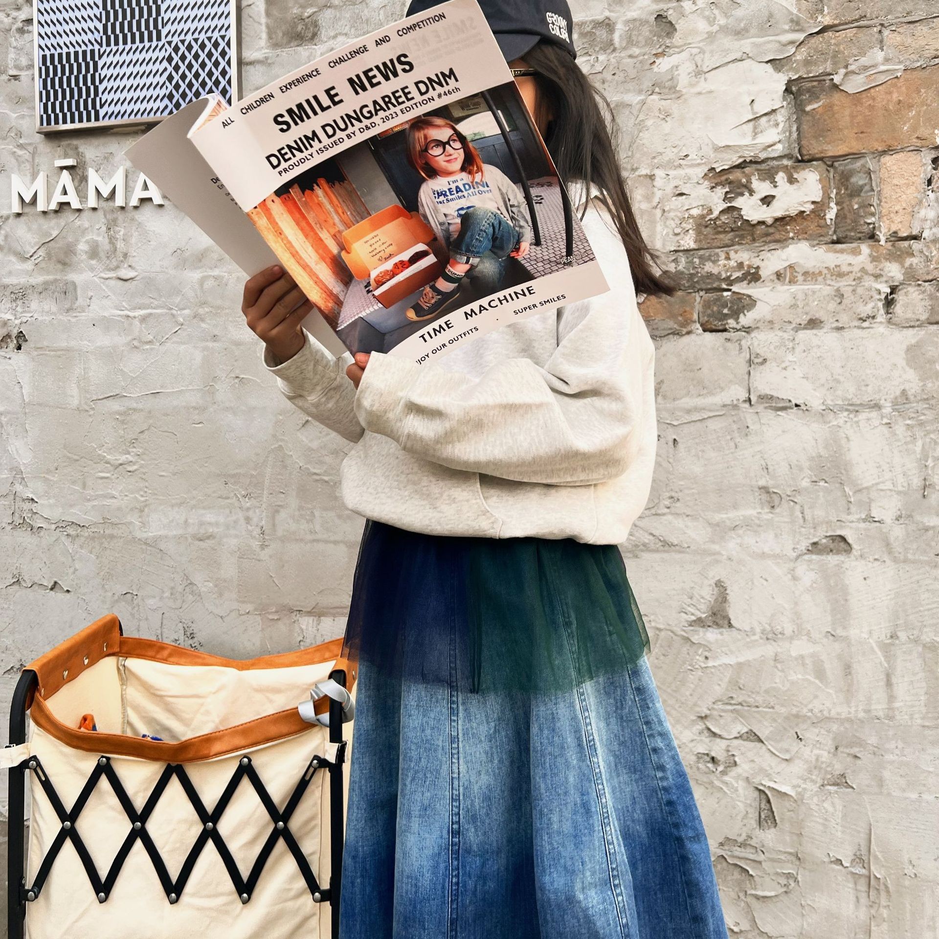23SS 신작 여아 일본식 스플리싱 데님 스커트 여아 신축성 있는 허리 중간 길이 스커트 부모-자식 스타일 재고 있음스토어 가기