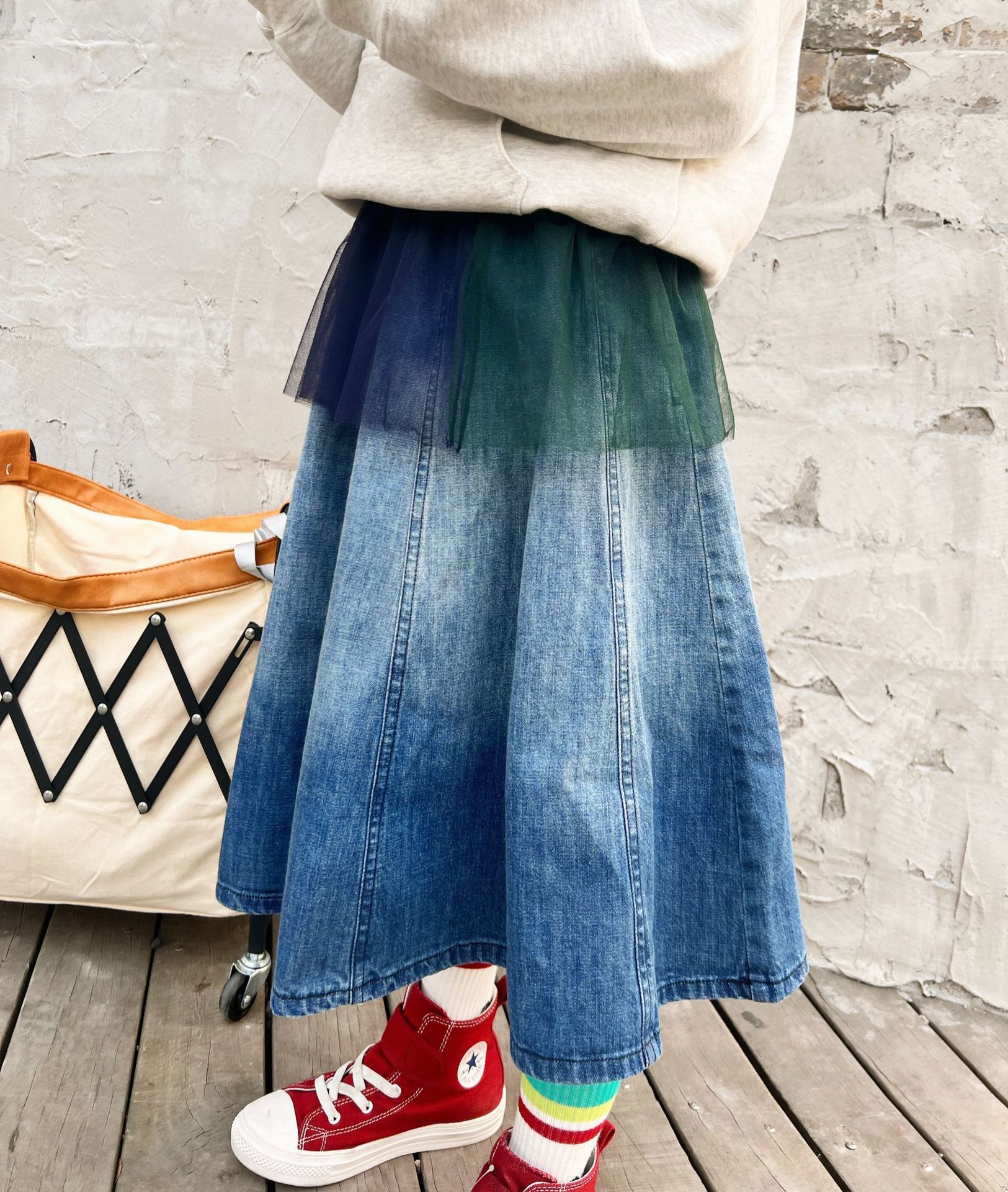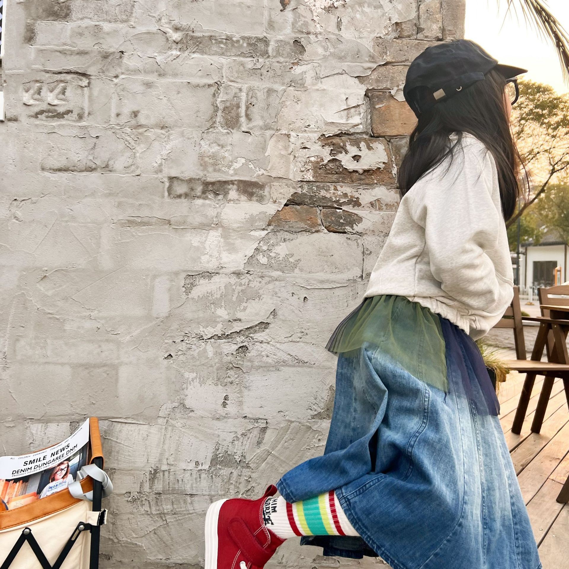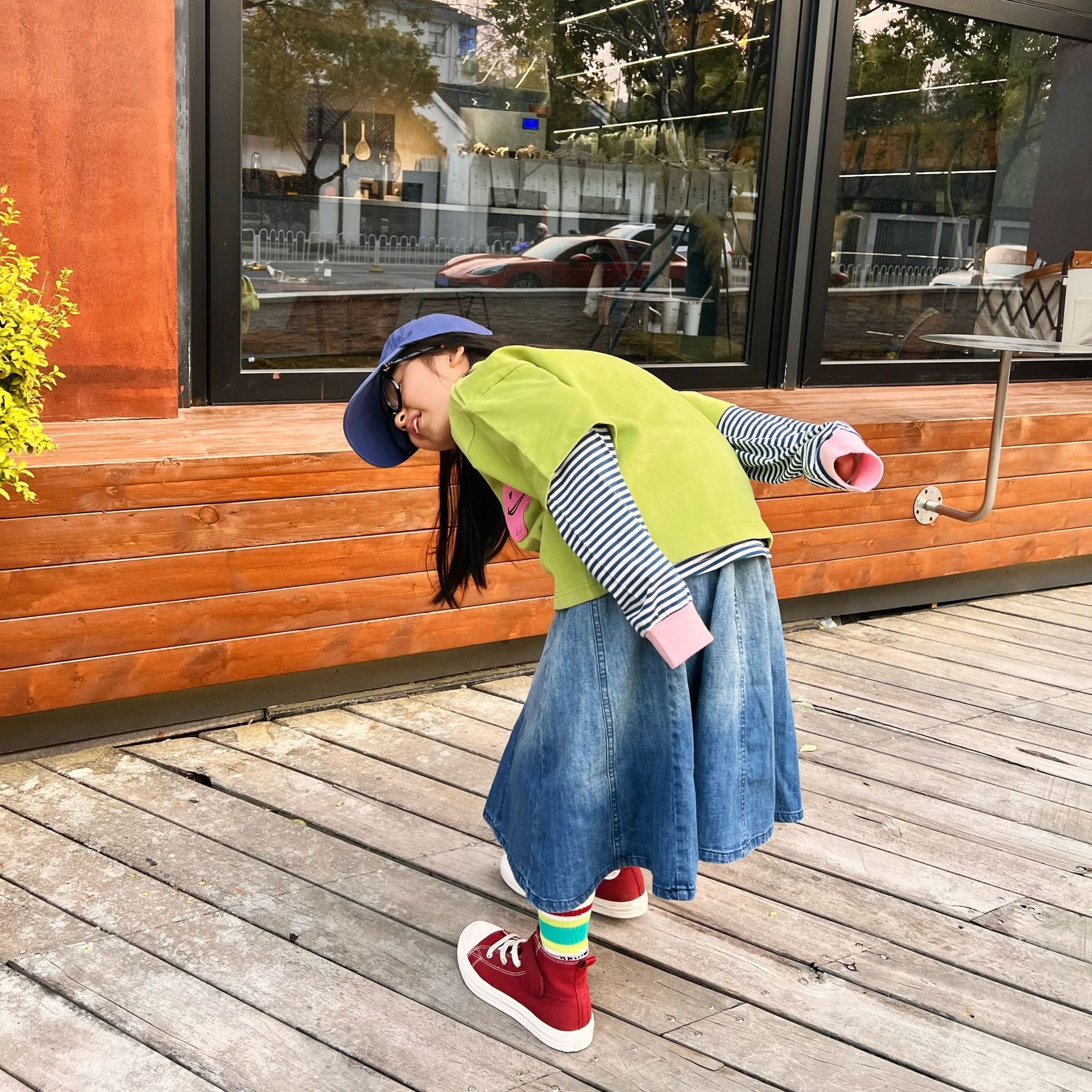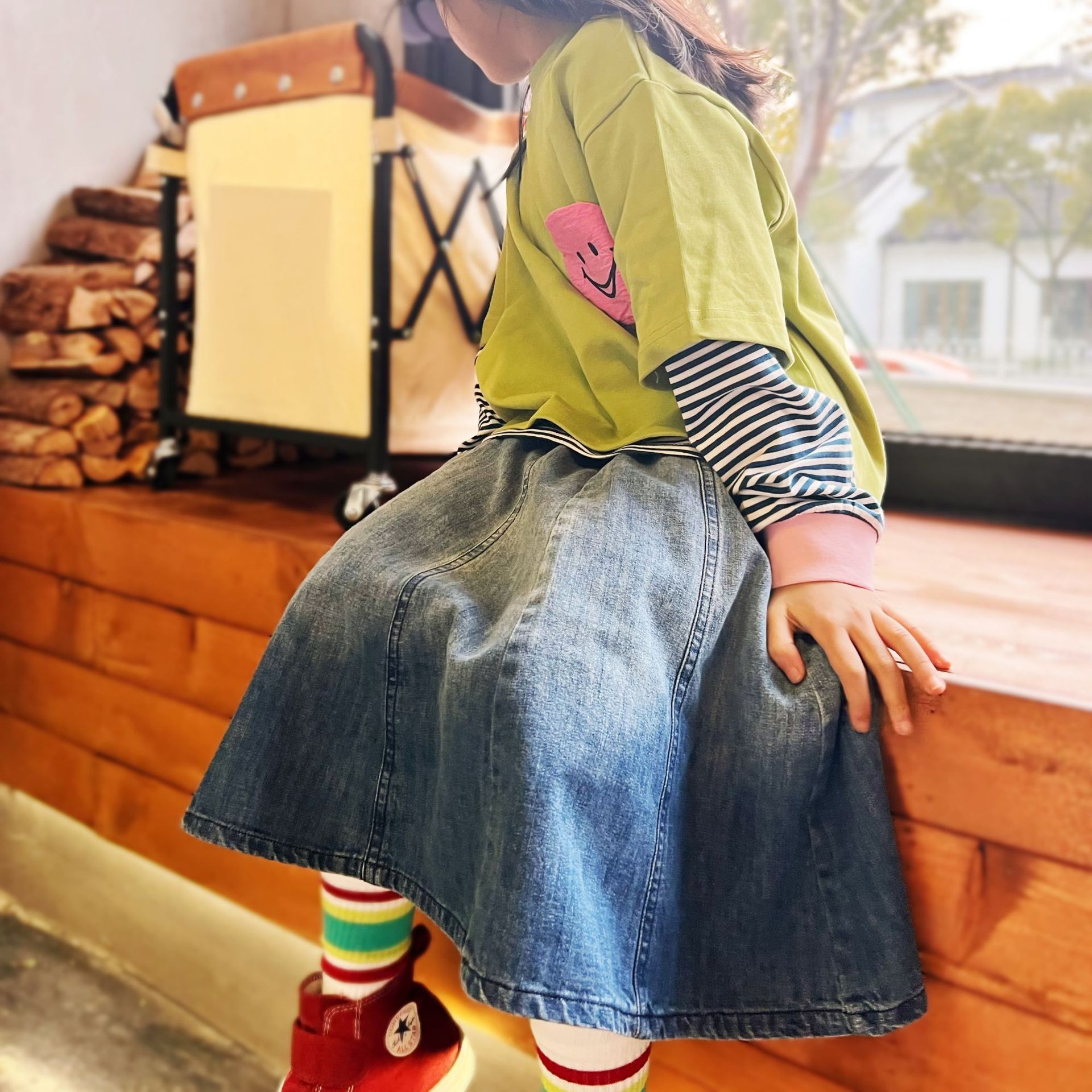 23SS 신작 여아 일본식 스플리싱 데님 스커트 여아 신축성 있는 허리 중간 길이 스커트 부모-자식 스타일 재고 있음