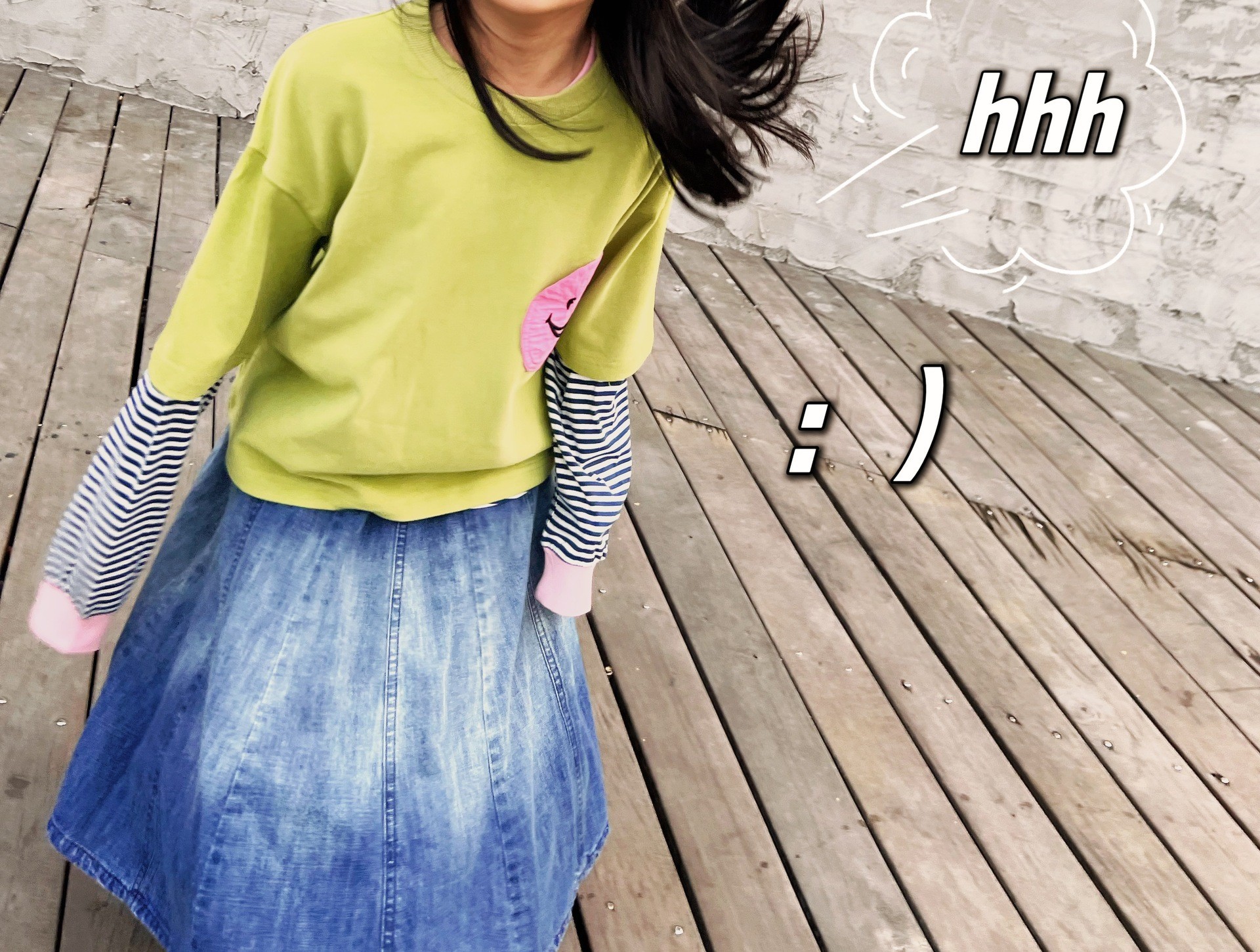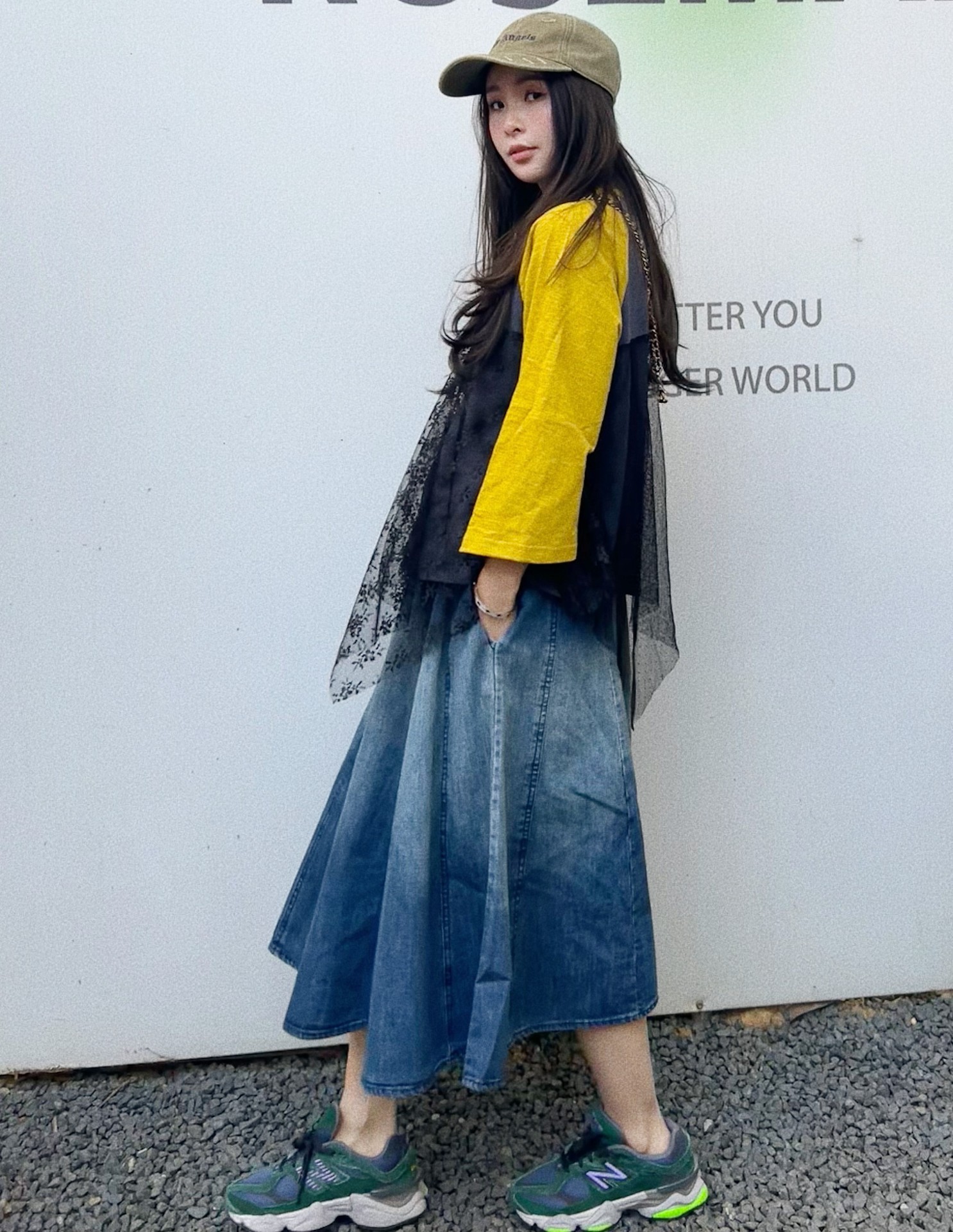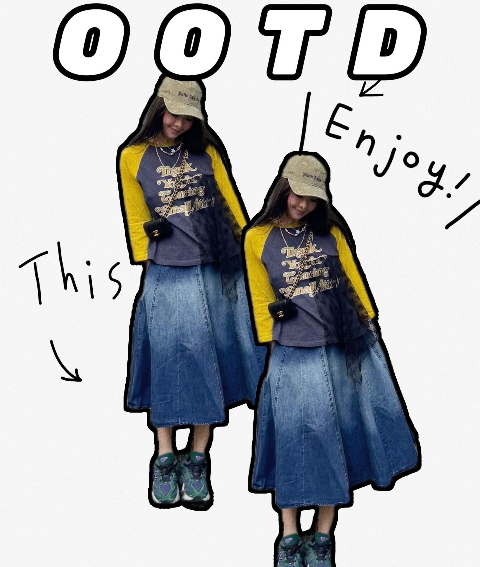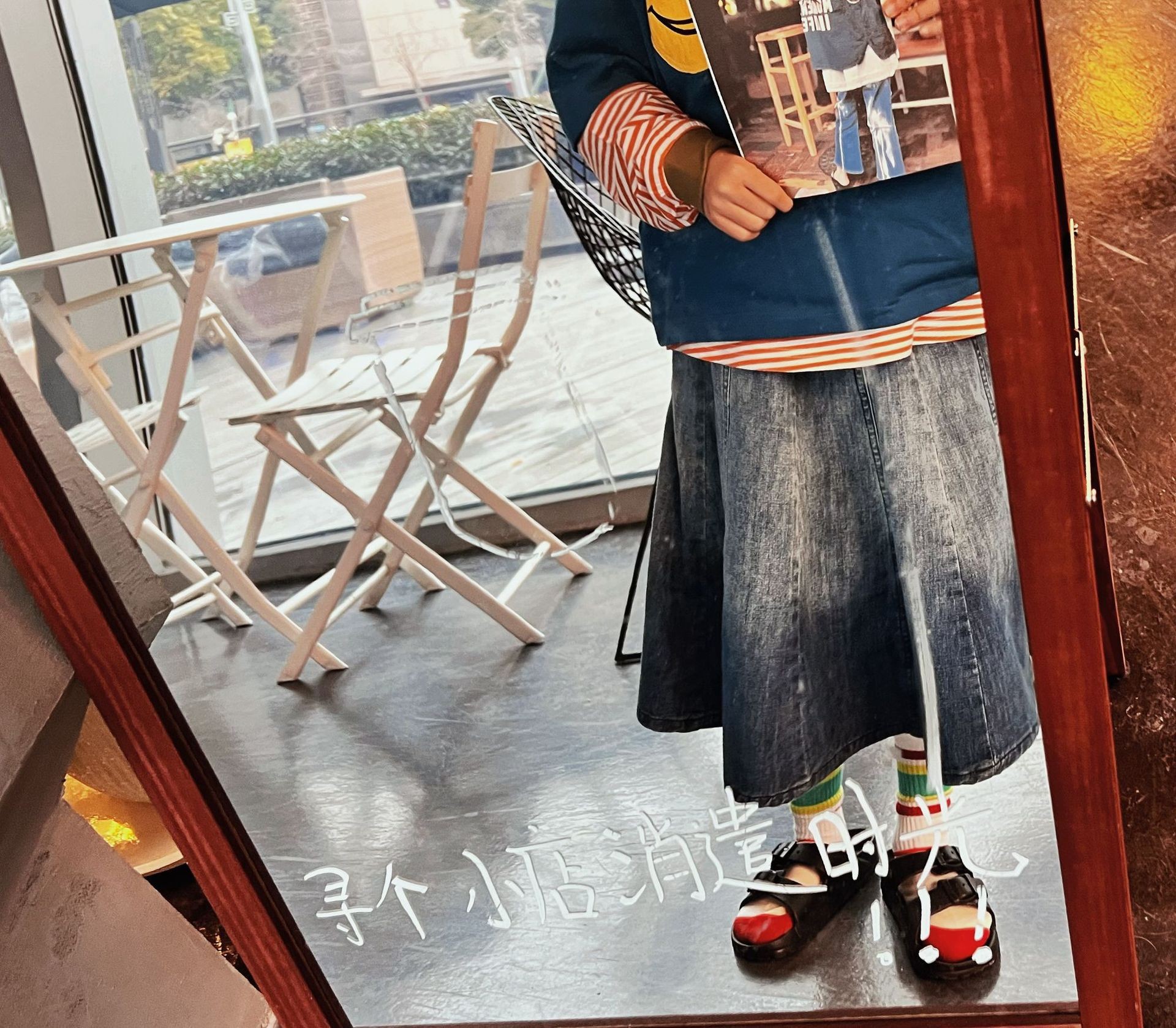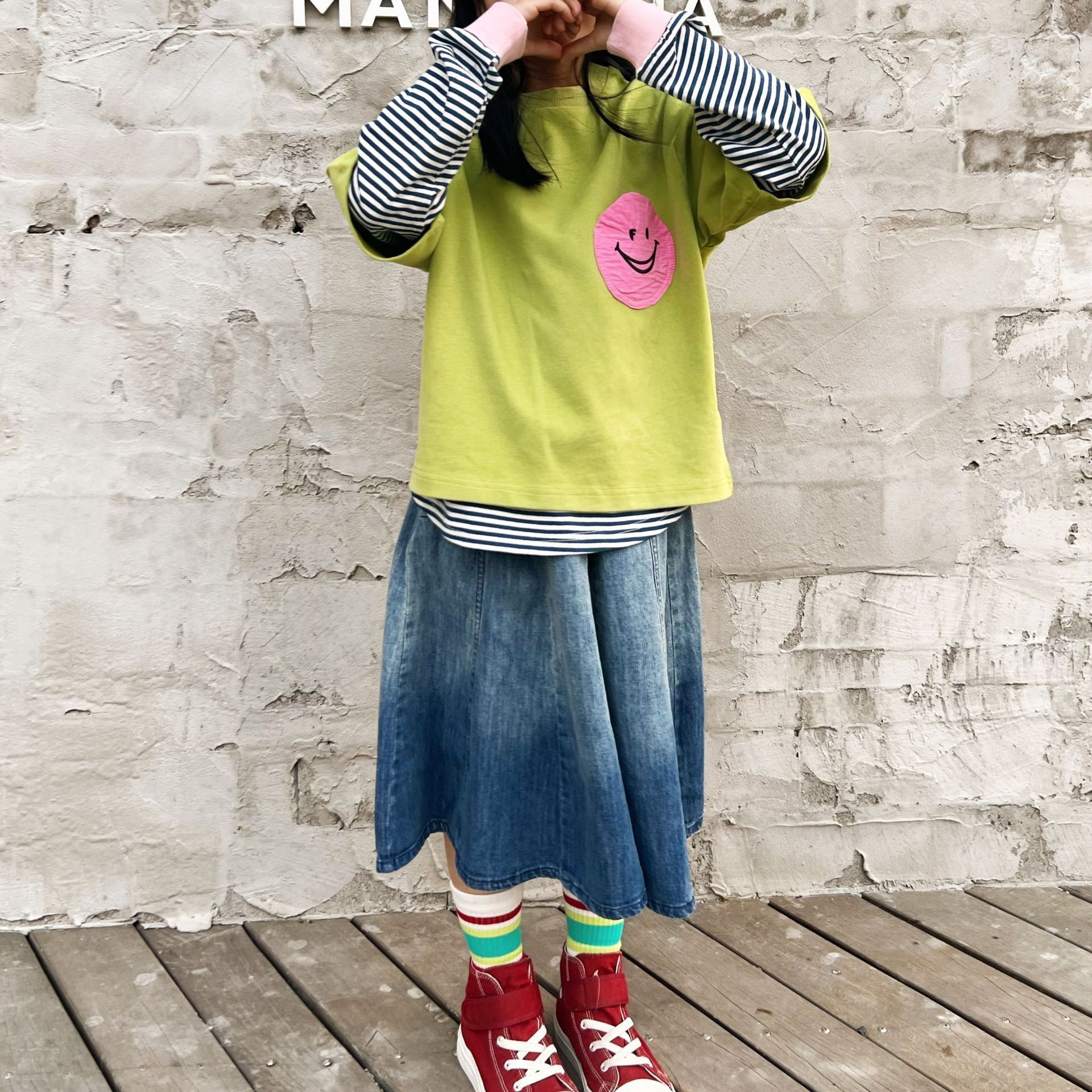 23SS 신작 여아 일본식 스플리싱 데님 스커트 여아 신축성 있는 허리 중간 길이 스커트 부모-자식 스타일 재고 있음