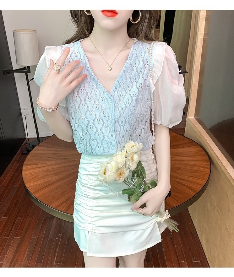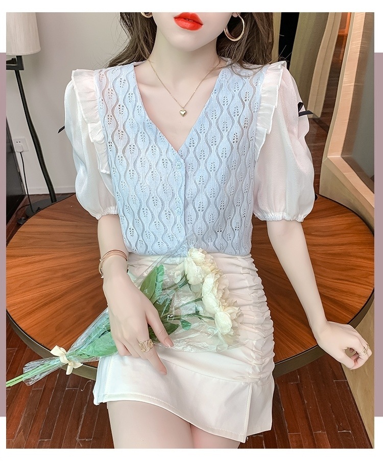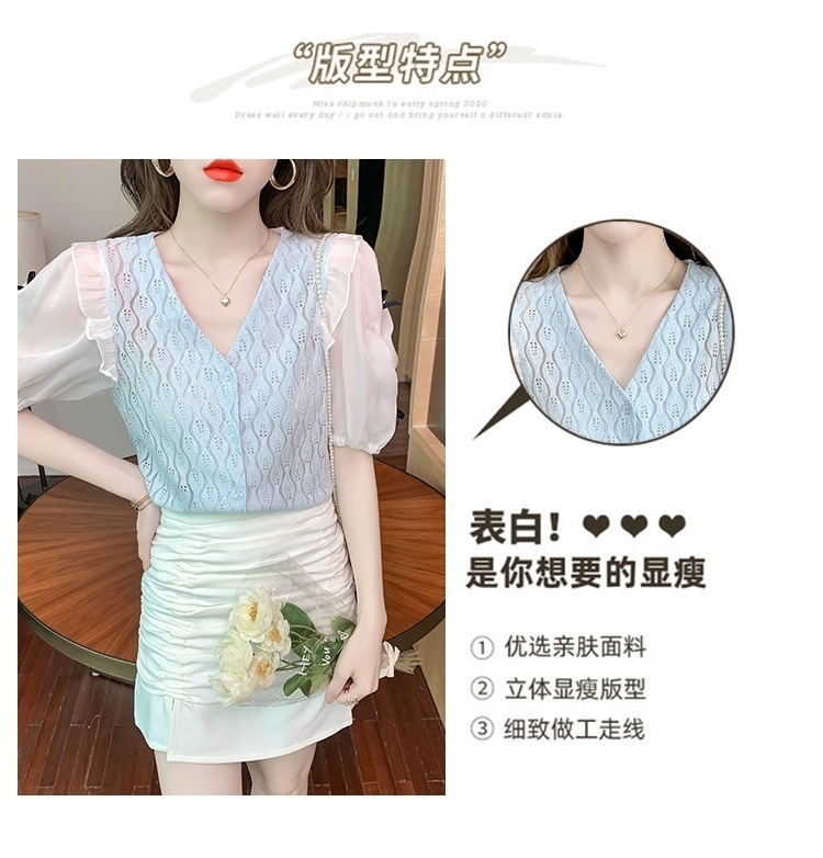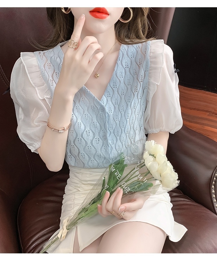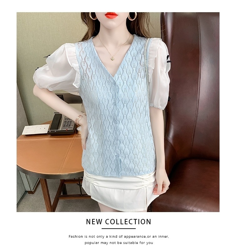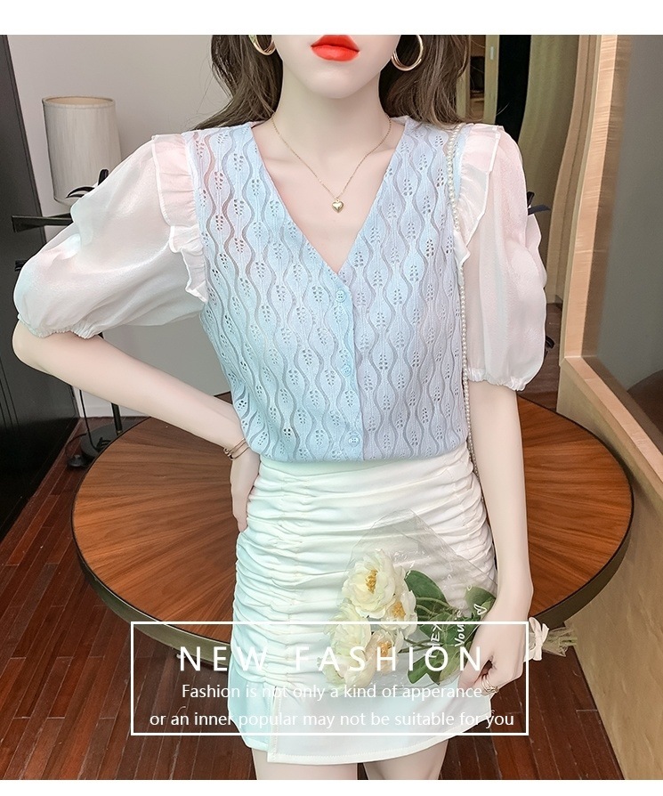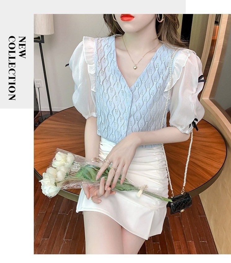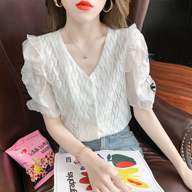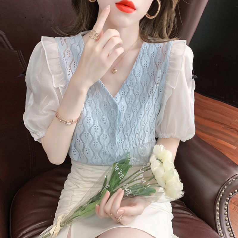 디자인 센스 틈새 레이스 셔츠 여성용 V-넥 반팔 쉬폰 셔츠 2023 여름 새로운 탑 슬림 셔츠