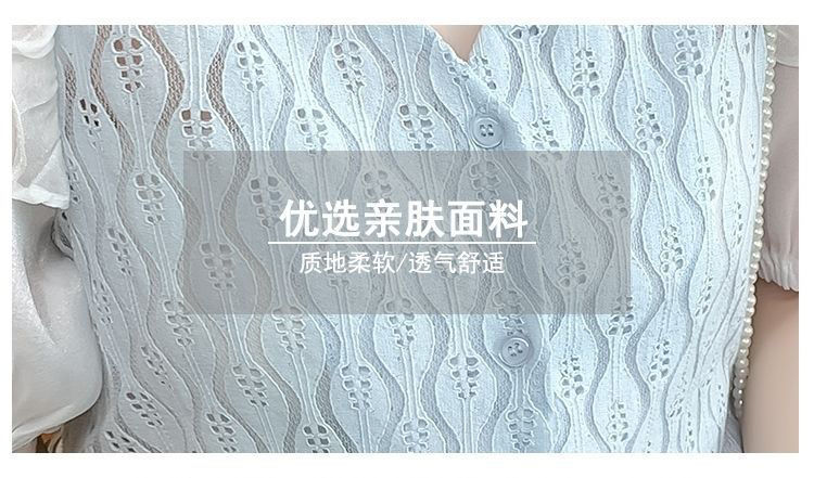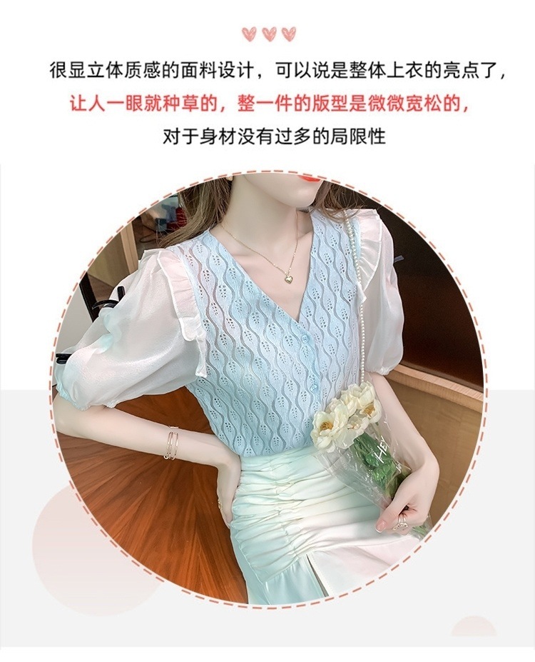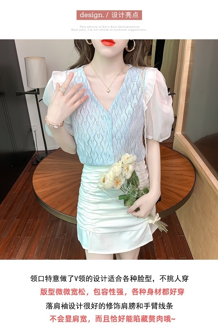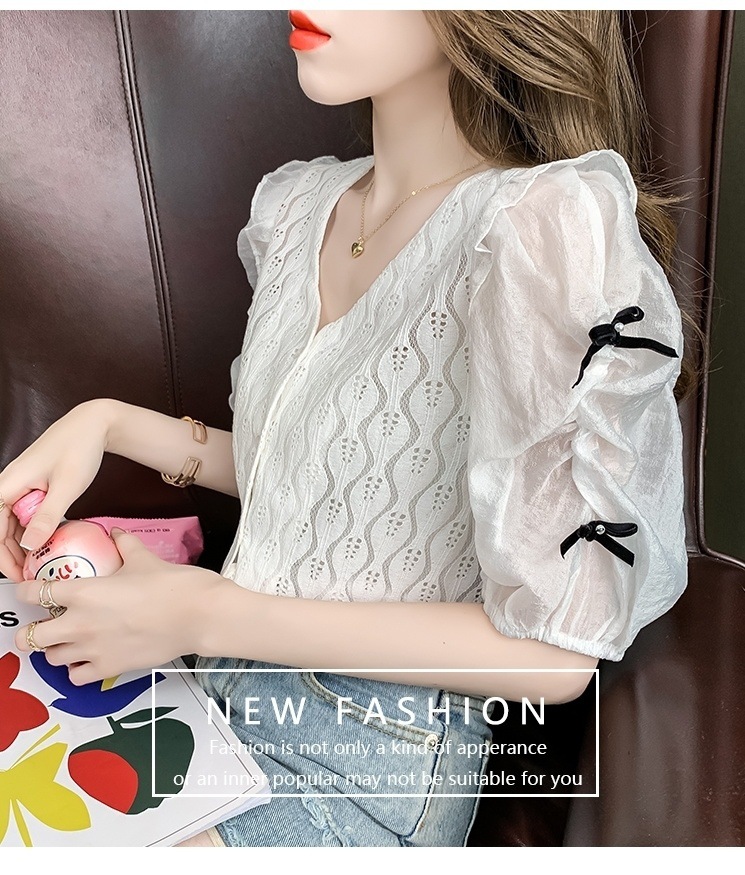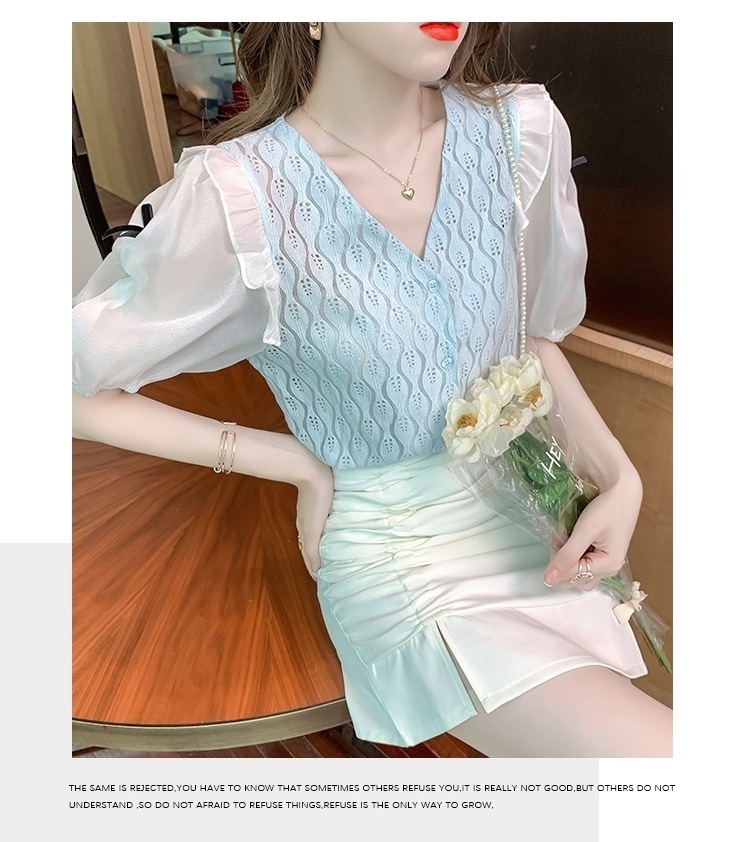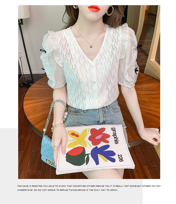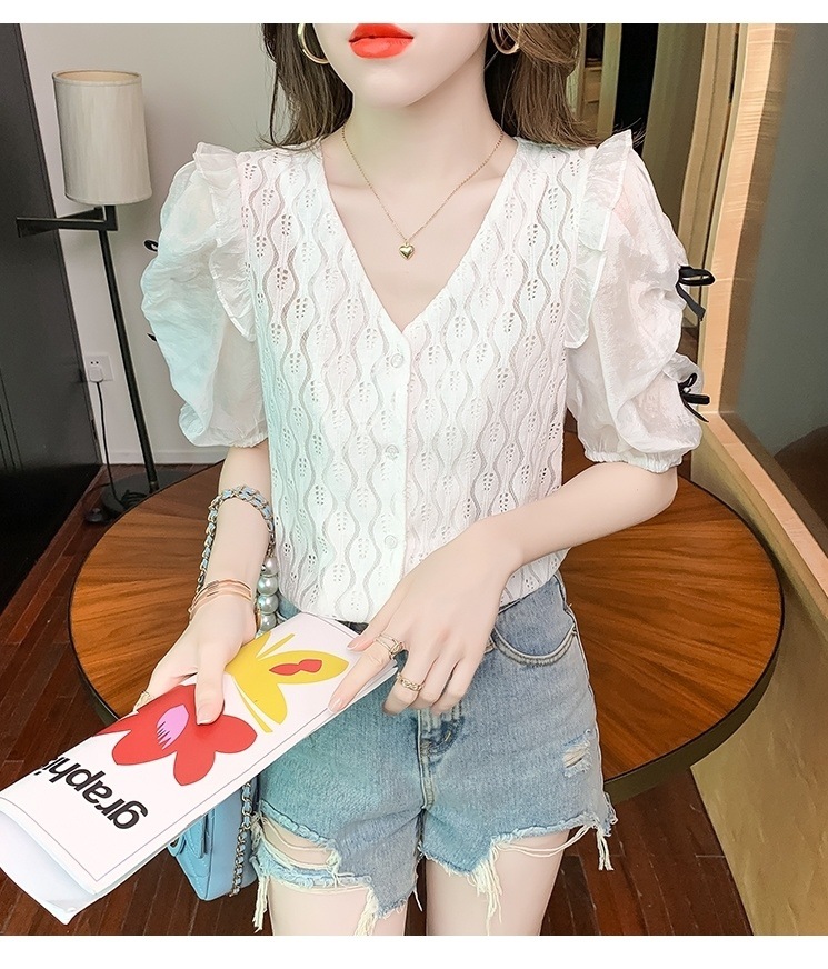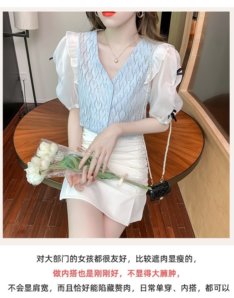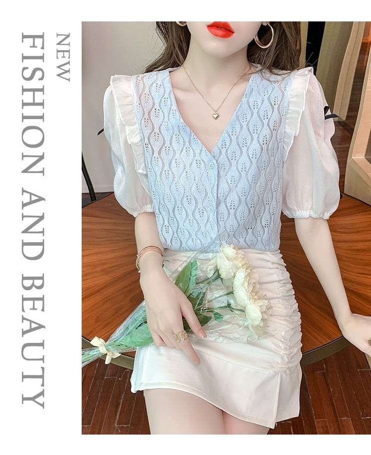 디자인 센스 틈새 레이스 셔츠 여성용 V-넥 반팔 쉬폰 셔츠 2023 여름 새로운 탑 슬림 셔츠
