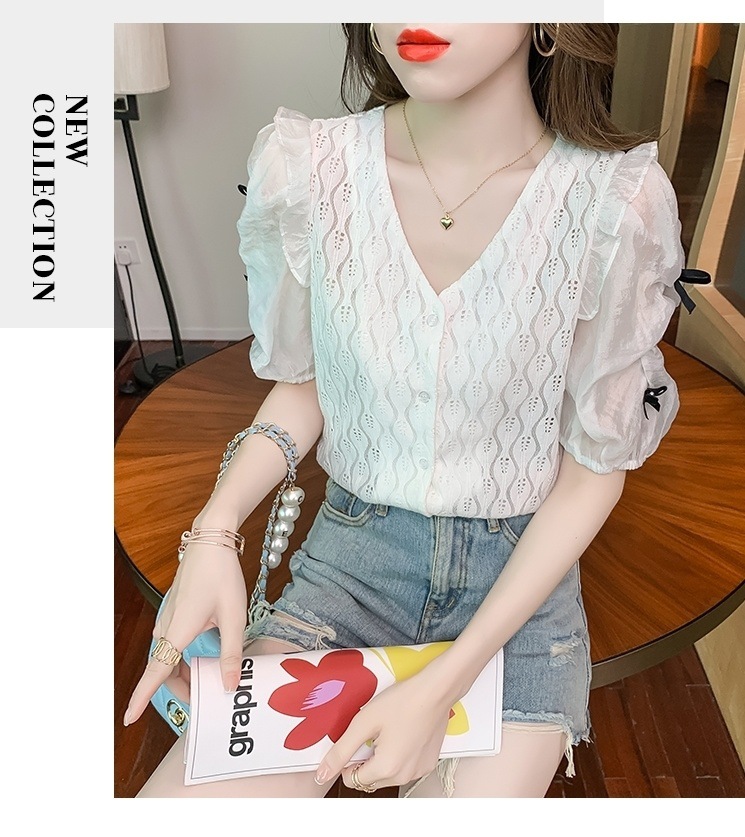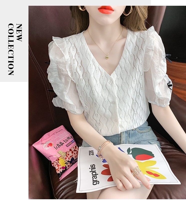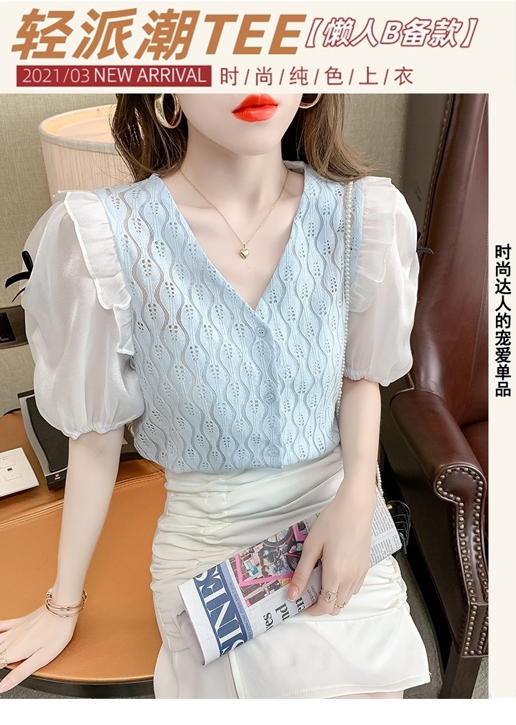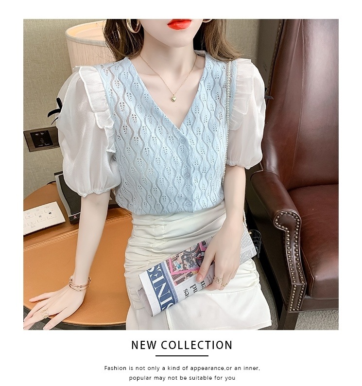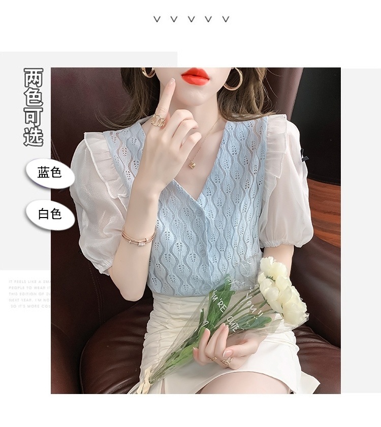 디자인 센스 틈새 레이스 셔츠 여성용 V-넥 반팔 쉬폰 셔츠 2023 여름 새로운 탑 슬림 셔츠스토어 가기