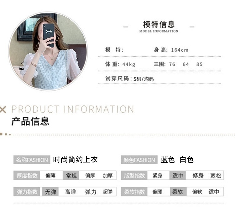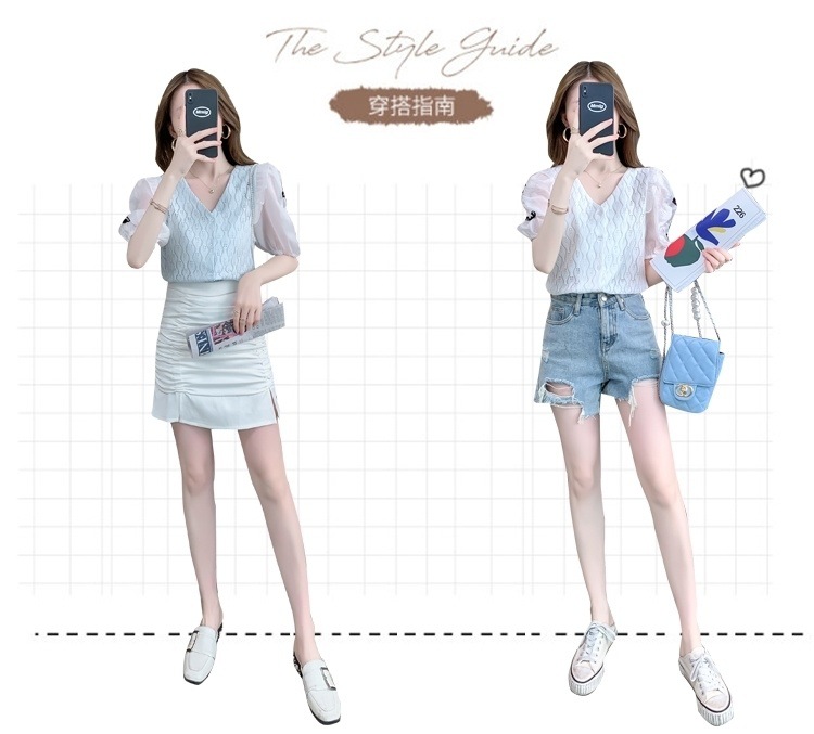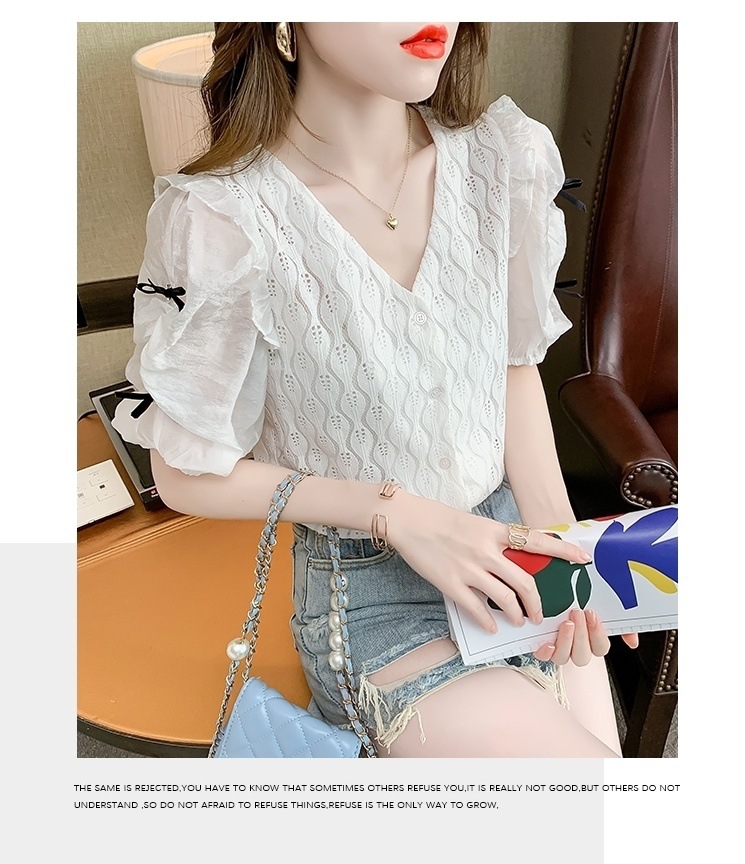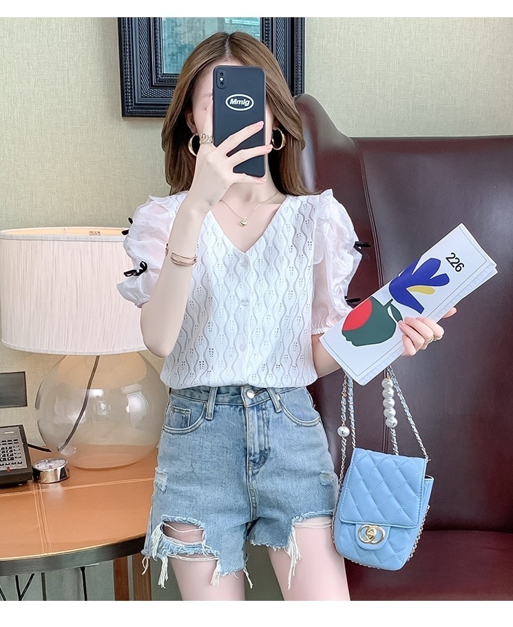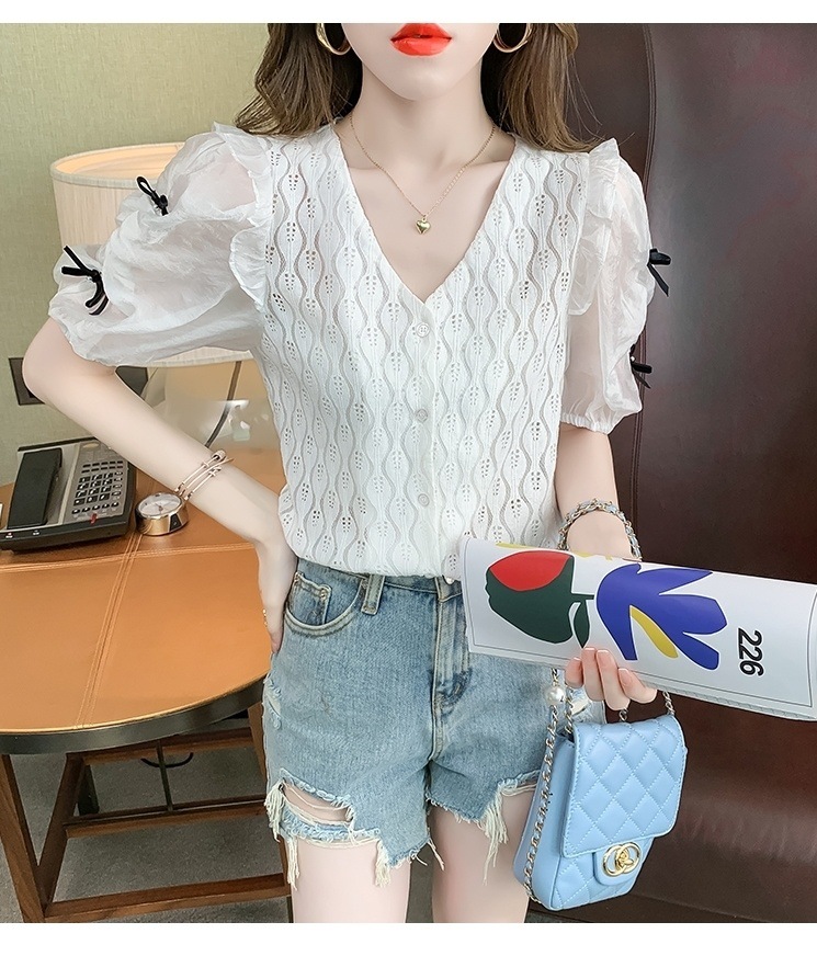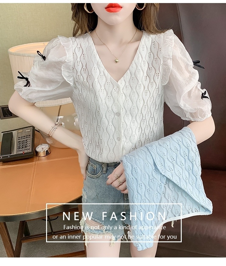 디자인 센스 틈새 레이스 셔츠 여성용 V-넥 반팔 쉬폰 셔츠 2023 여름 새로운 탑 슬림 셔츠스토어 가기