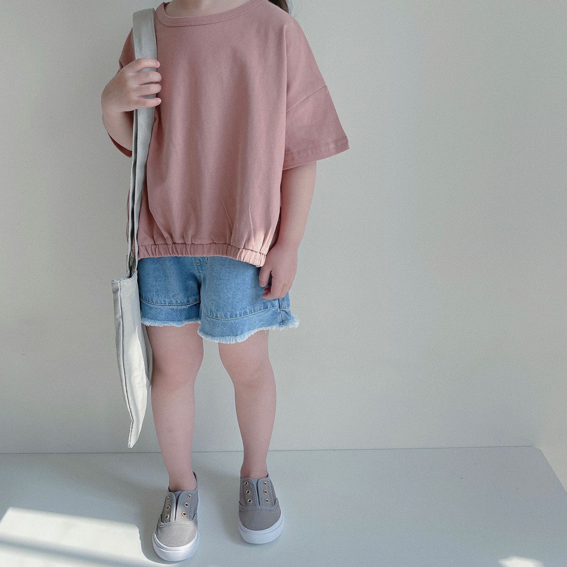 BOBOKIDS 봄/여름 2023 아동복 소년과 소녀를위한 일본식 올면 반팔 허리 와이드 티셔츠스토어 가기