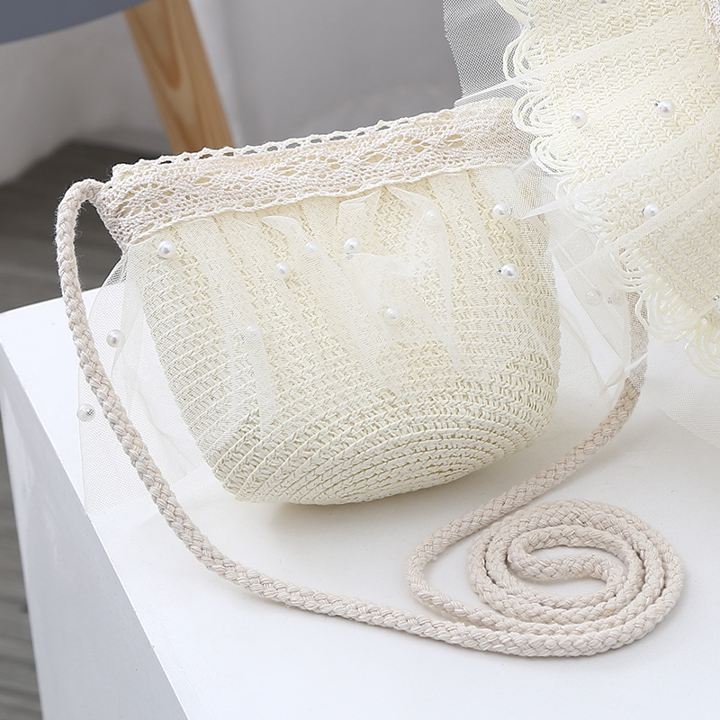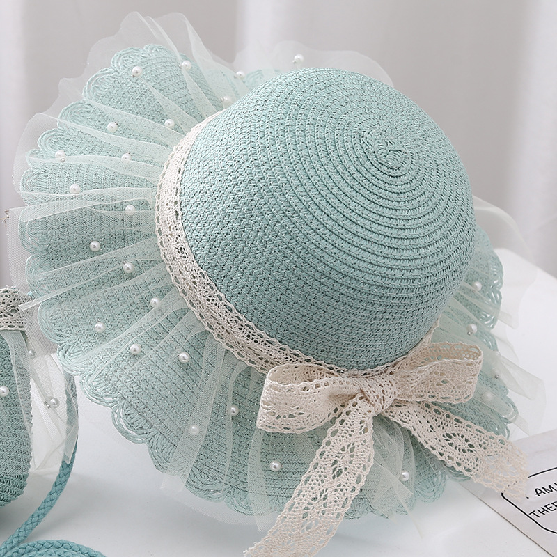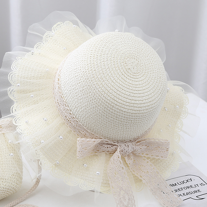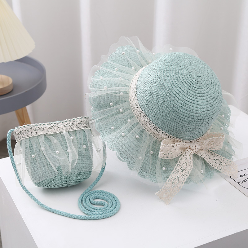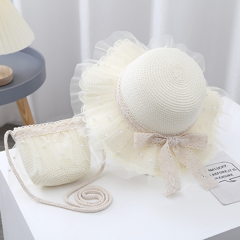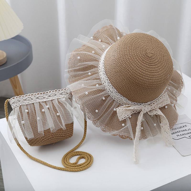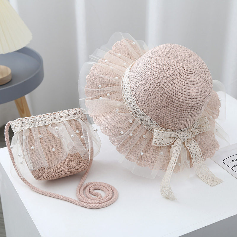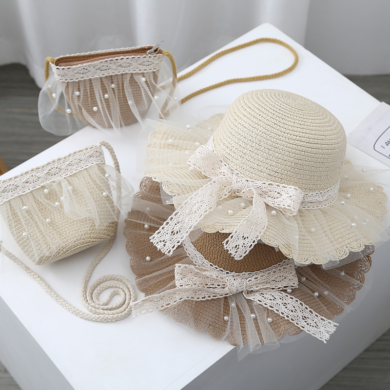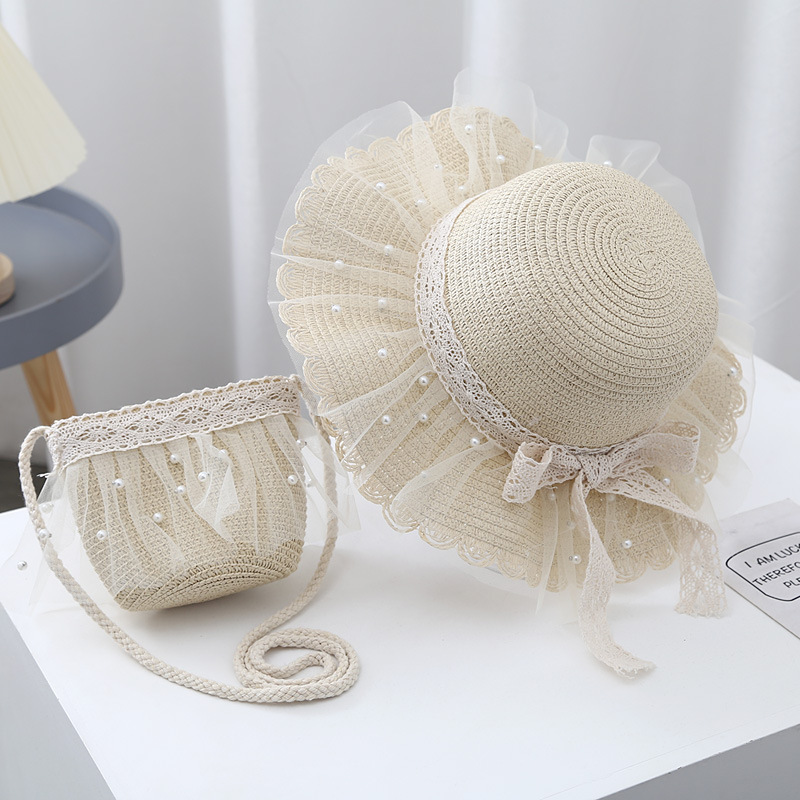 어린이 자외선 차단제 모자 여름 소녀의 차양 밀짚 모자 가방 세트 소녀 아기 소녀 얇은 명주 그물 공주 서양 스타일 비치 모자