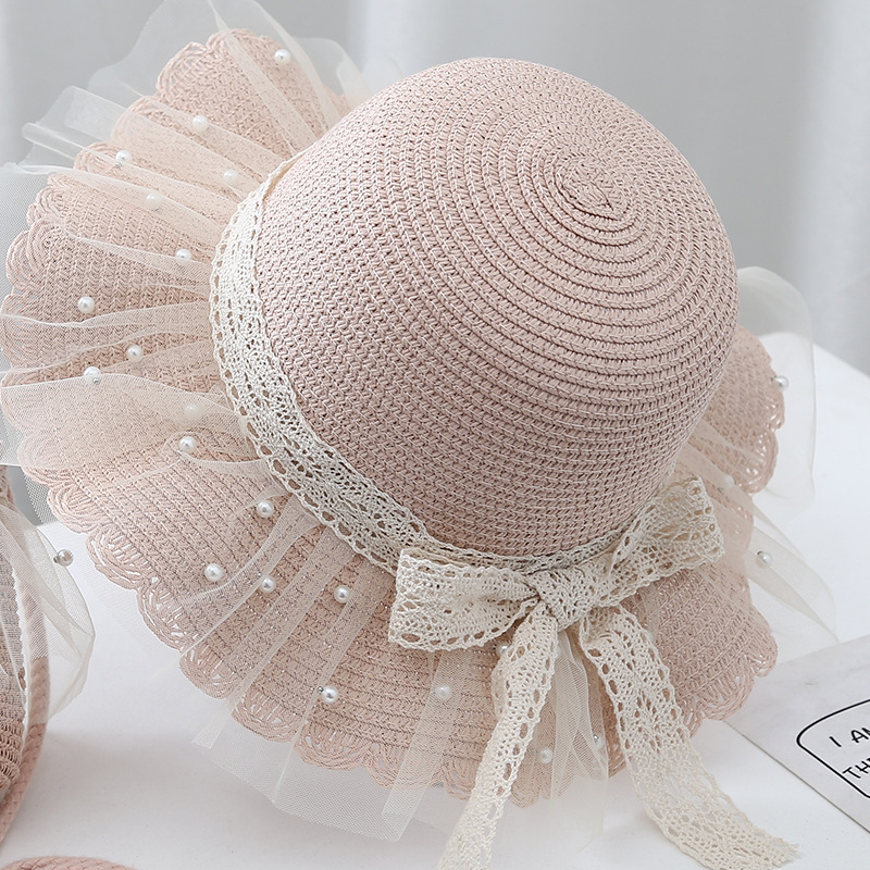 • 핑크 세트 (얇은 명주 그물 구슬 밀짚 모자)
