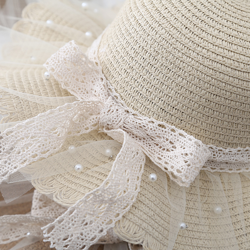 • 베이지 세트 (얇은 명주 그물 구슬 밀짚 모자)