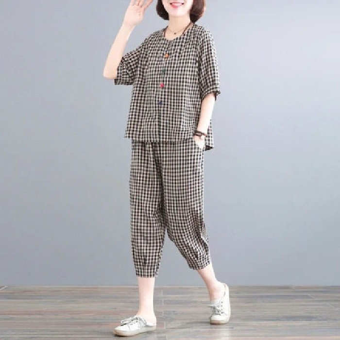 2023 패션 새로운 느슨한 플러스 사이즈 여성의 복고풍 투피스 우아한 여성의 캐주얼 격자 무늬 세트 여성의 여름스토어 가기