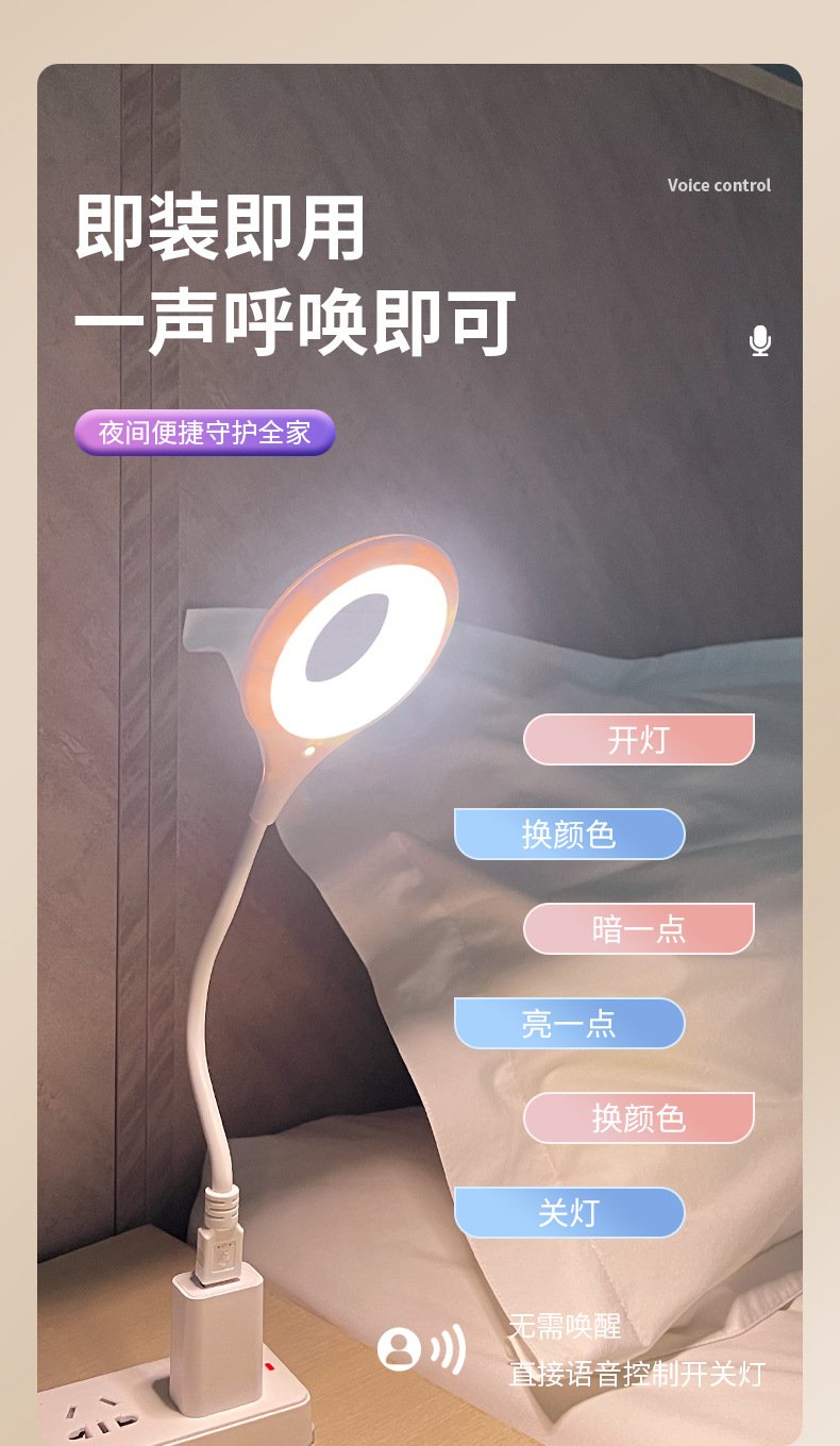 음성 제어 음성 야간 조명 LED 침대 옆 램프 창조적 인 유도 램프 작은 책상 램프 USB 소켓 인공 지능 제어 램프