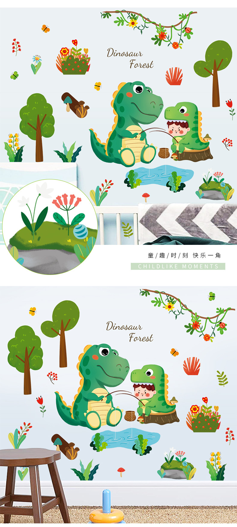 만화 공룡 3D 벽 스티커 아기 어린이 방 레이아웃 침실 침대 옆 벽지 벽 장식 스티커스토어 가기