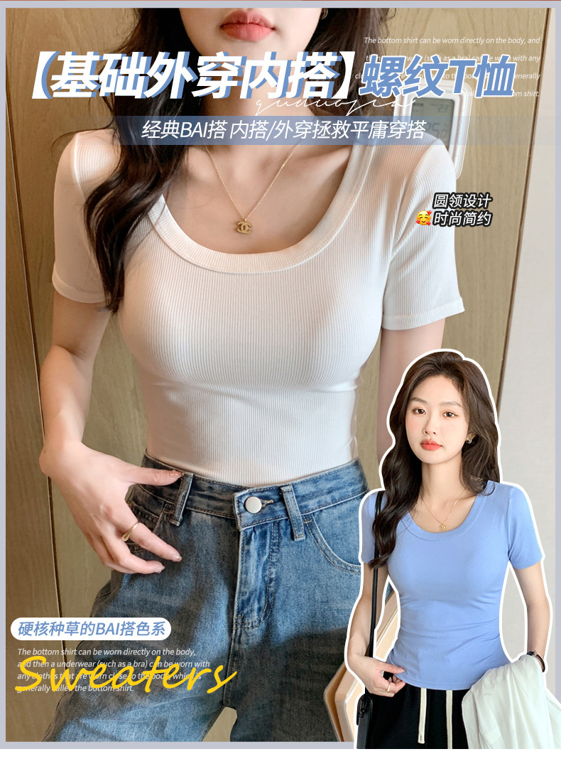 H521 생방송 인기 라운드 넥 반팔 티셔츠 여성 여름 아우터웨어 이너 레이어드 셔츠 솔리드 컬러 편안한 통기성 탑스토어 가기