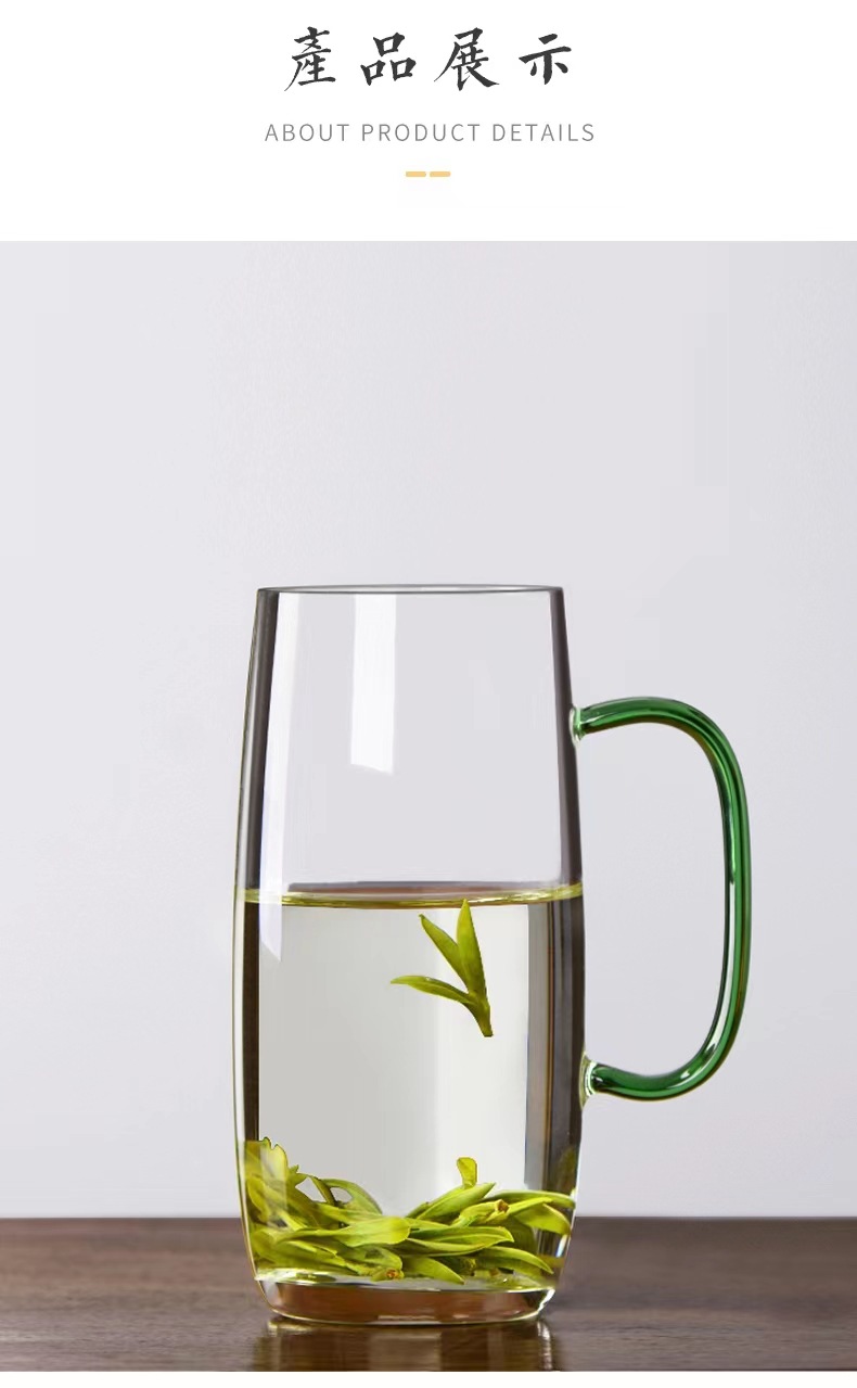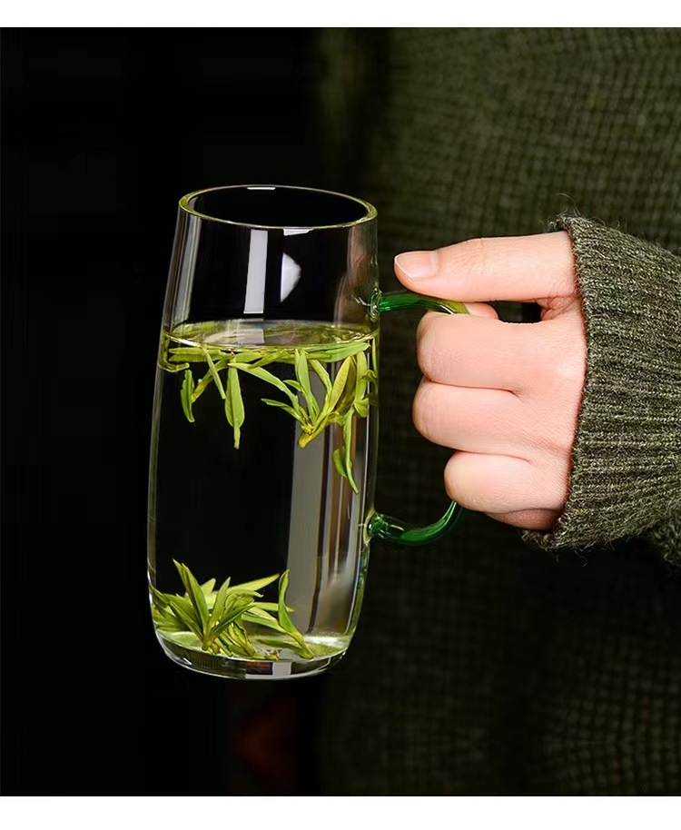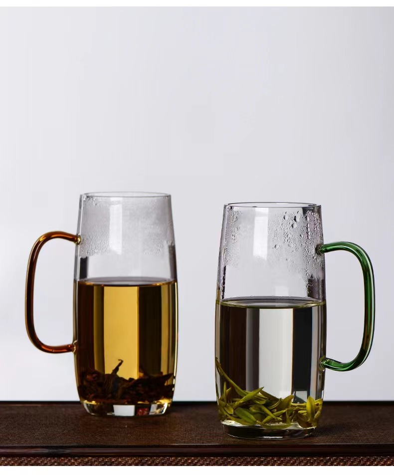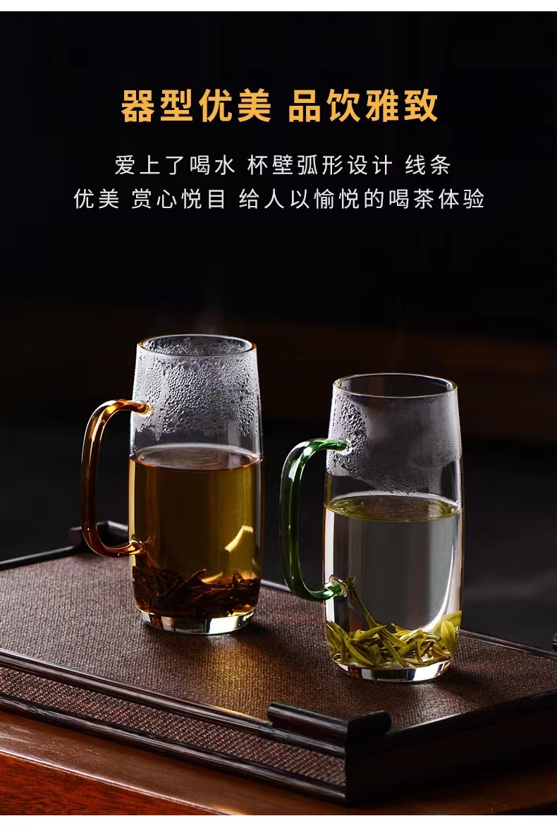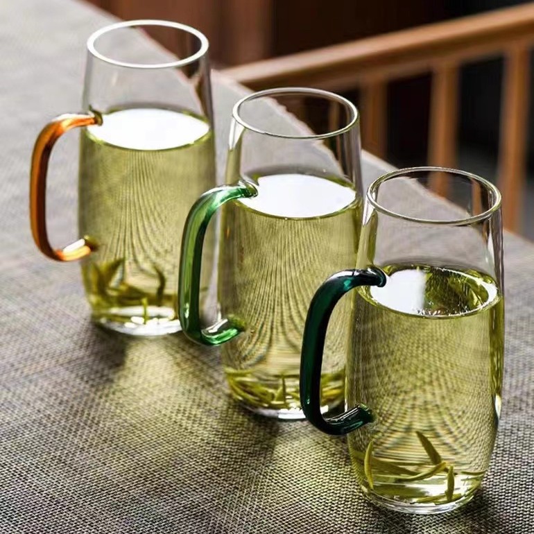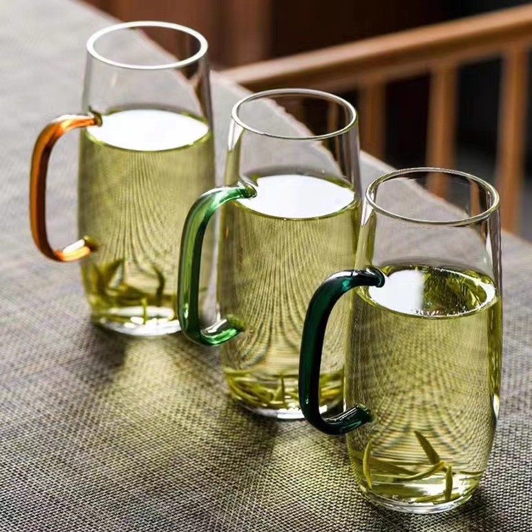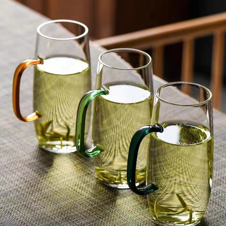 남성과 여성을위한 높은 붕규산 두꺼운 열대 손잡이 녹차 컵 사무실 유리 Longjing Houkui 차 컵