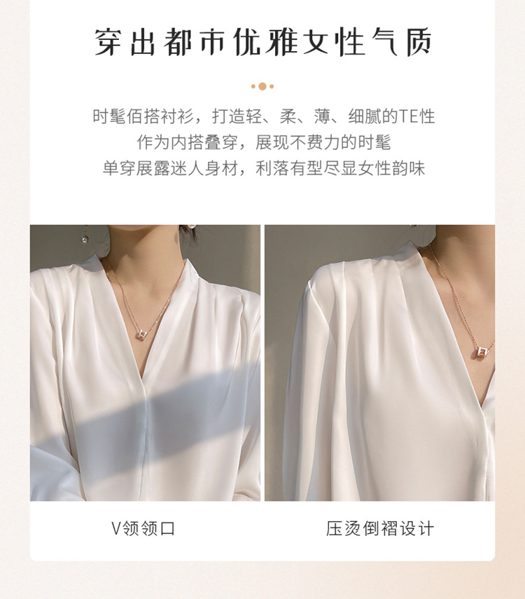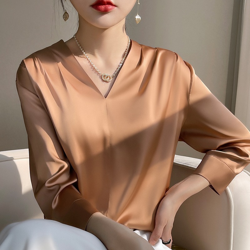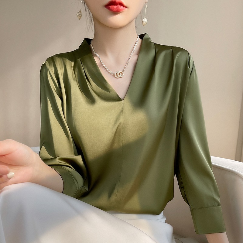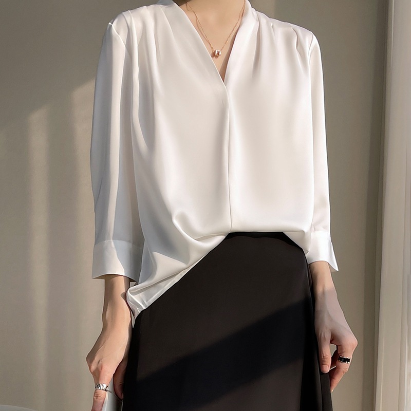 실크 새틴 멀베리 실크 탑 2023 여름 신상 브이넥 고급 아세테이트 7부 소매 티셔츠 여성용 루즈핏스토어 가기