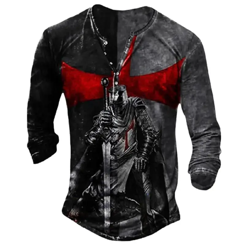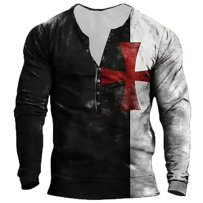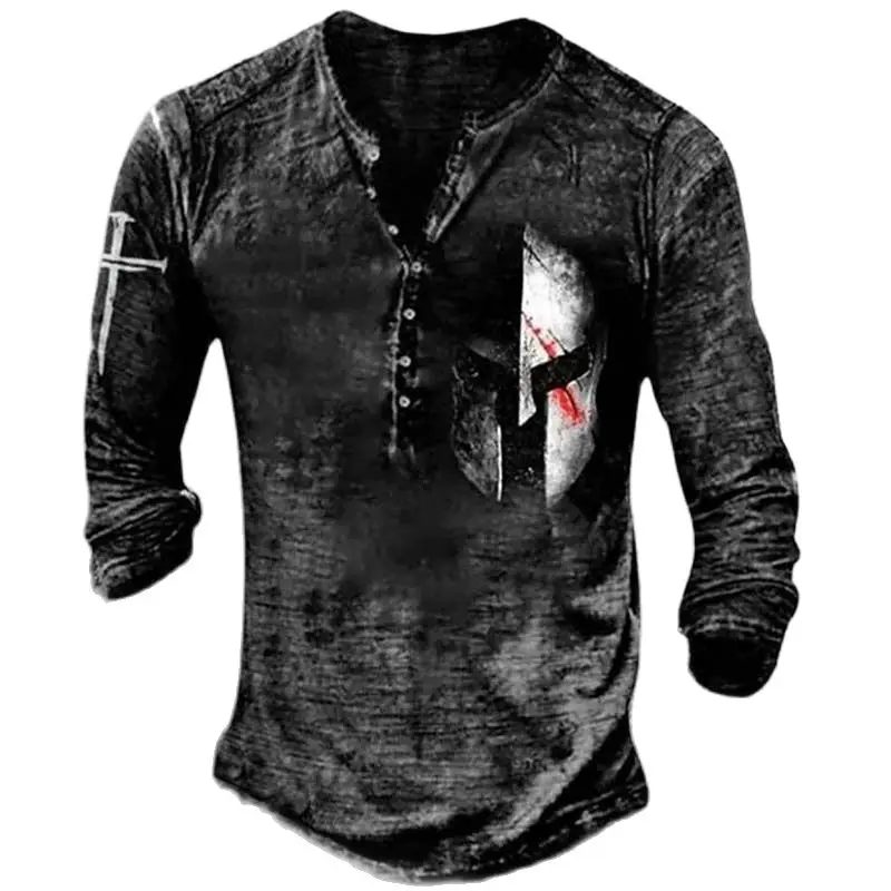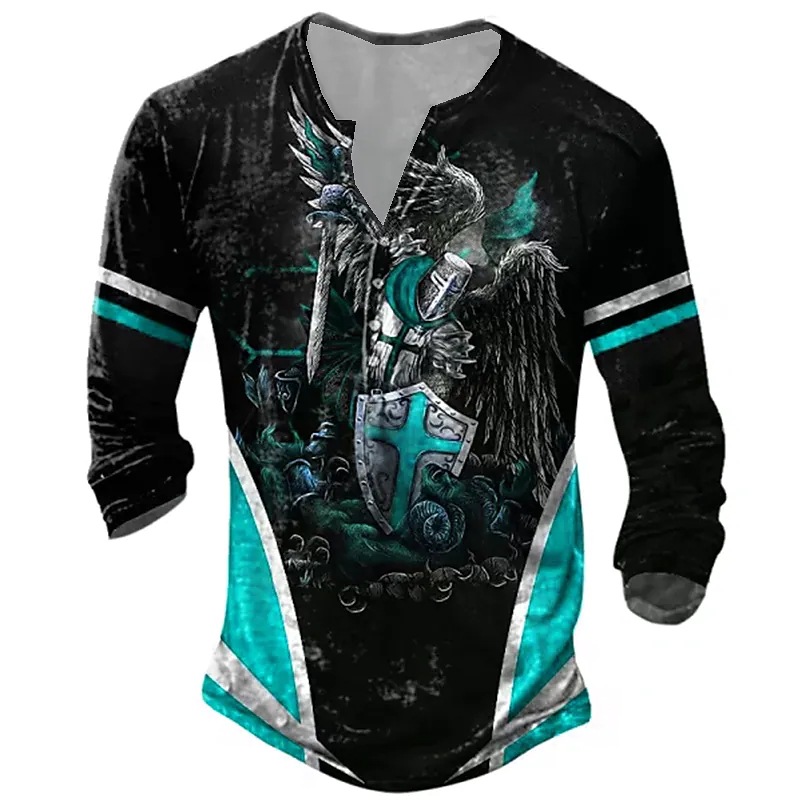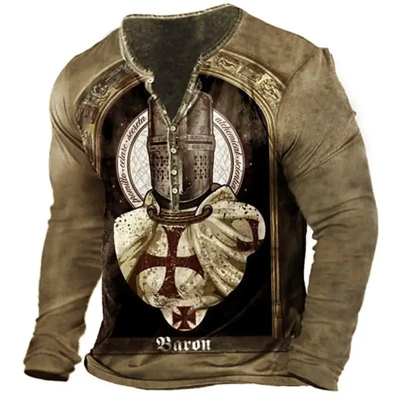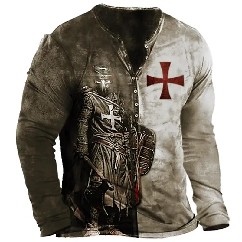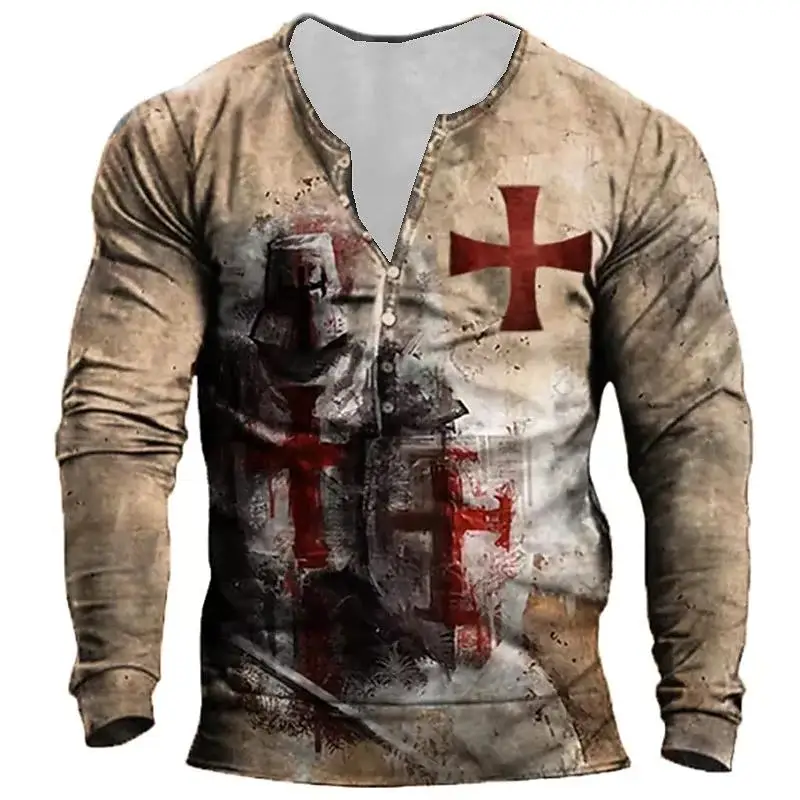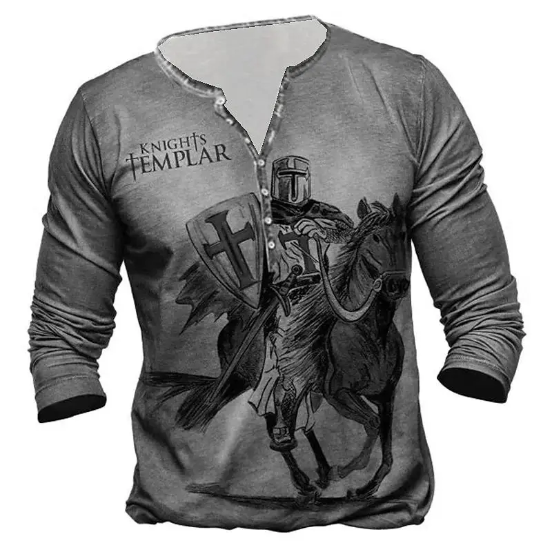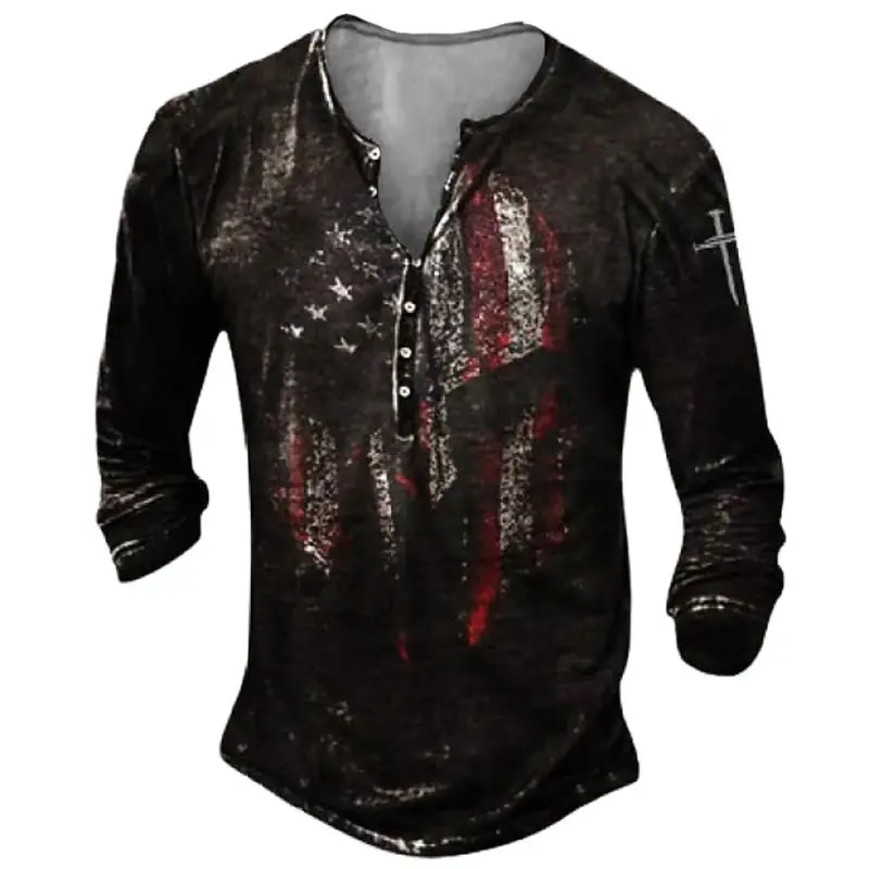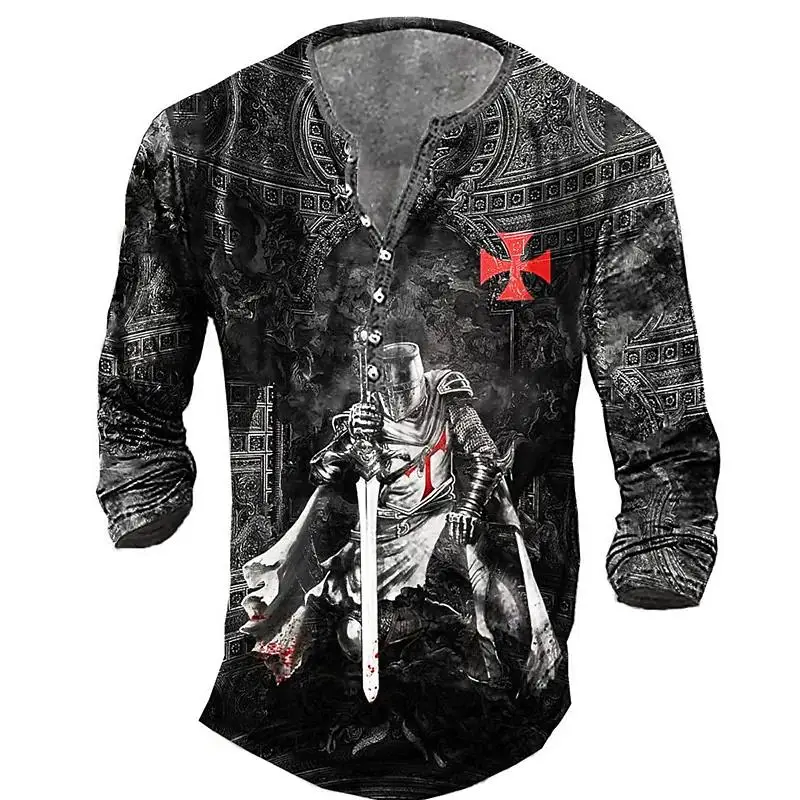 공장 다이렉트 AliExpress 핫 남성용 7 버튼 오픈 플래켓 버튼 티셔츠 디지털 인쇄 남성용 긴팔 티셔츠