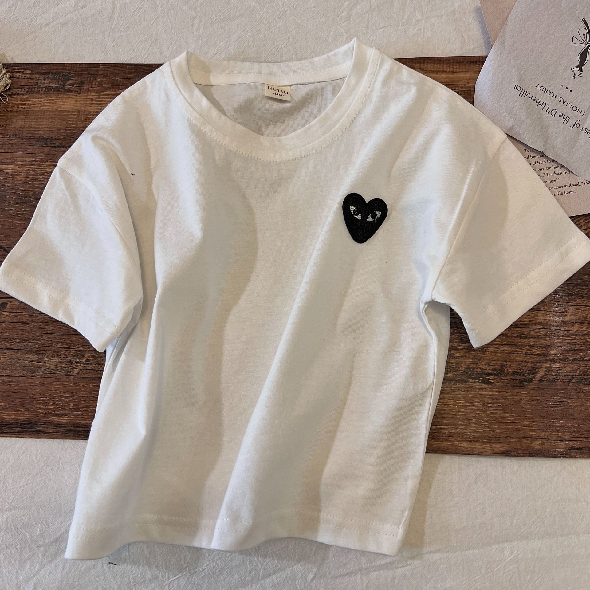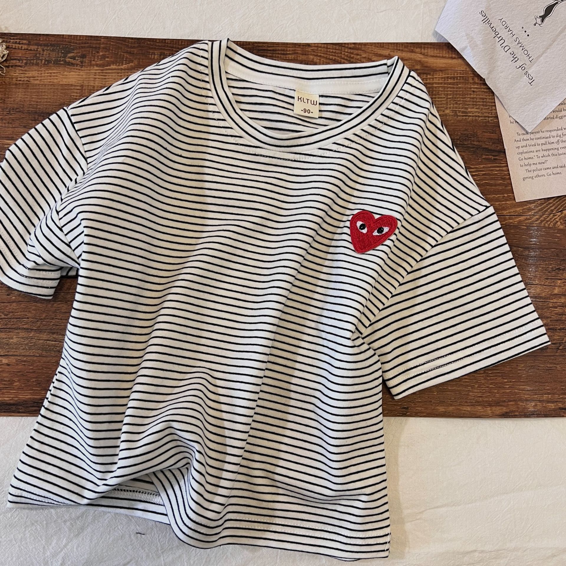 어린이 티셔츠 2024 여름 스타일 스트라이프 러브 반팔 베이비 솔리드 컬러 라운드 넥 바닥 셔츠 소년과 소녀를위한 유행스토어 가기