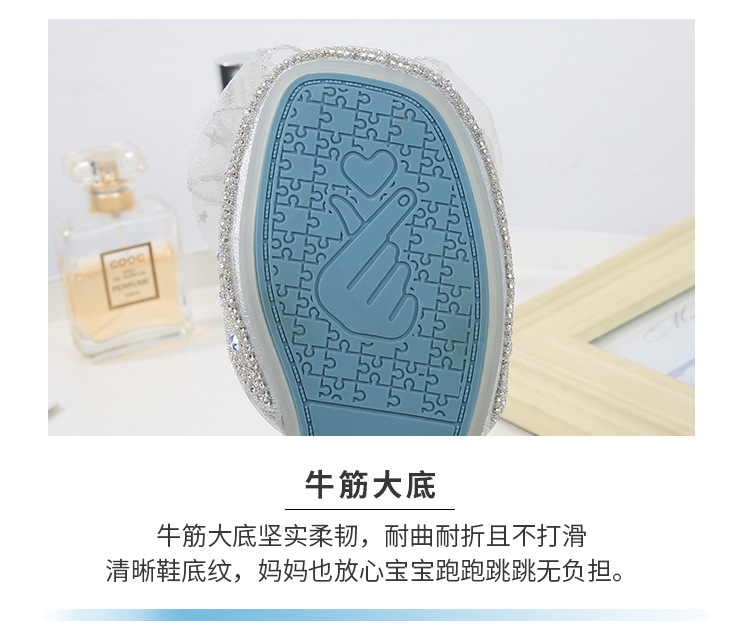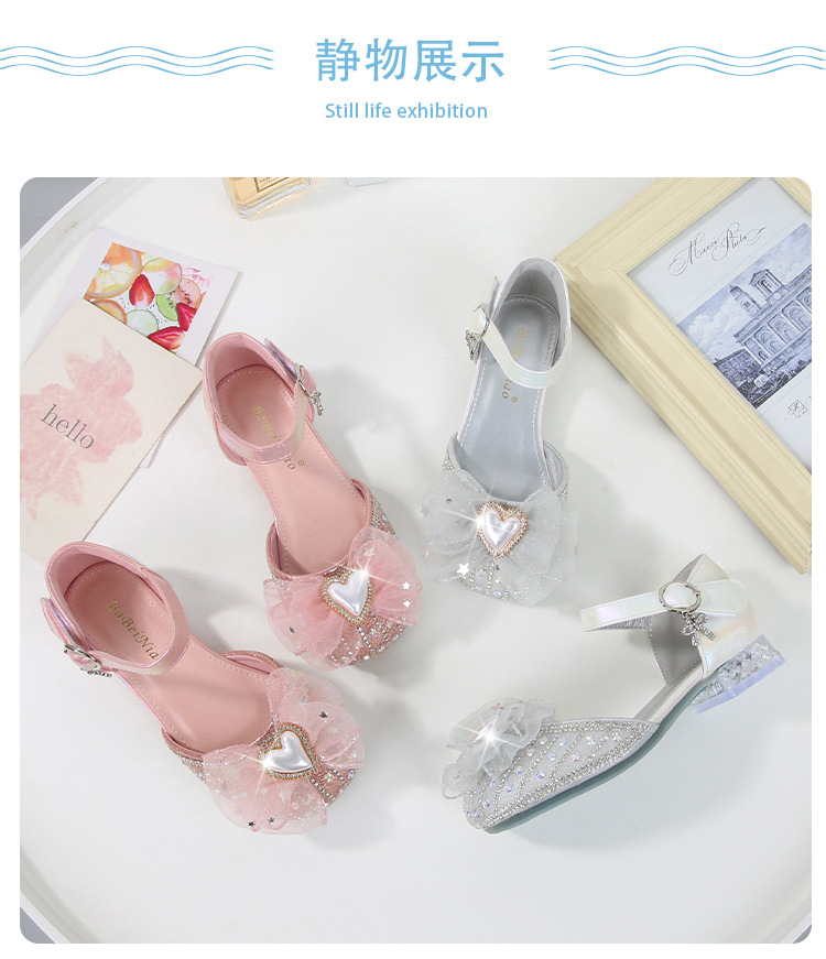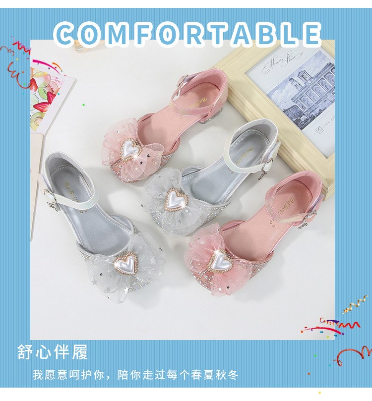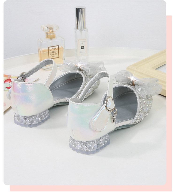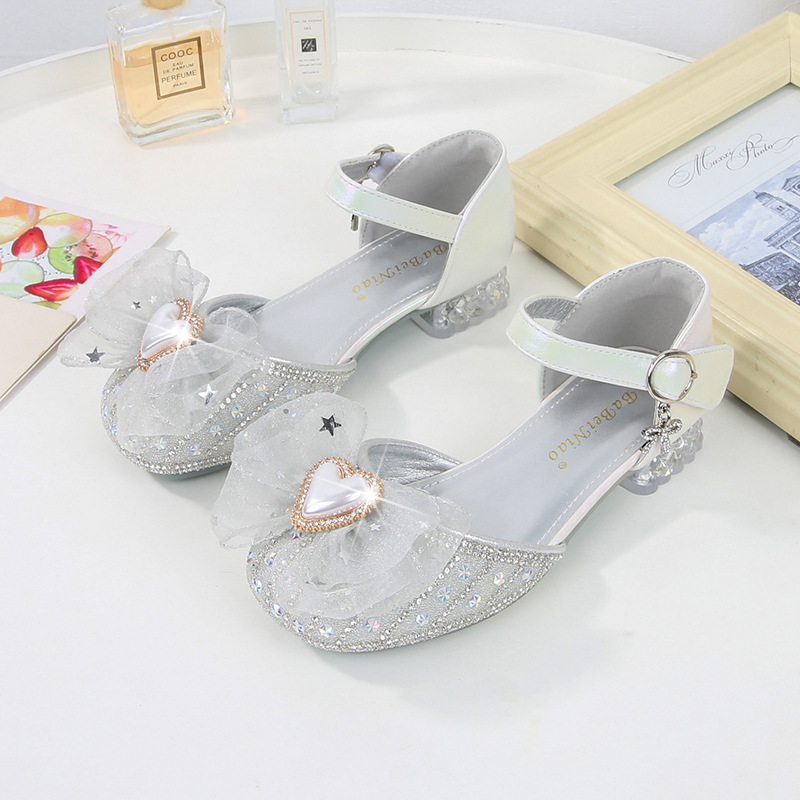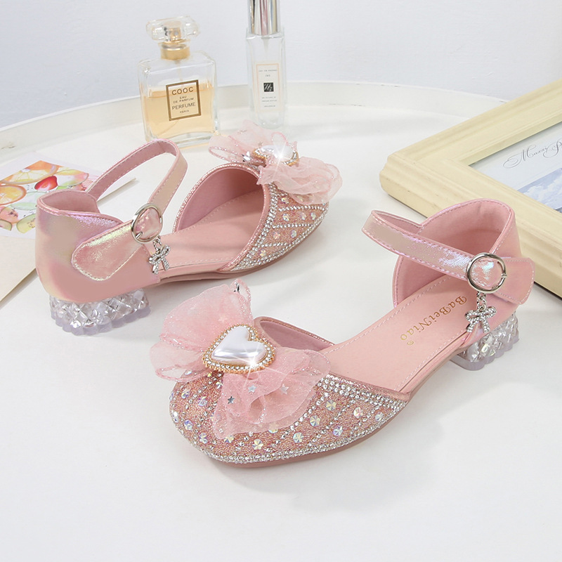 어린이 공주 신발 2023 새로운 봄과 가을 크리스탈 하이힐 샌들 한국 스타일 소녀의 공연 한 단어 중공 가죽 신발스토어 가기