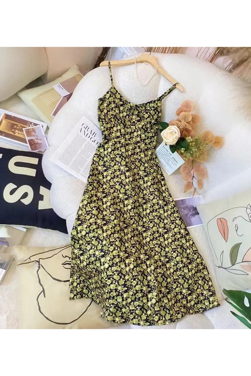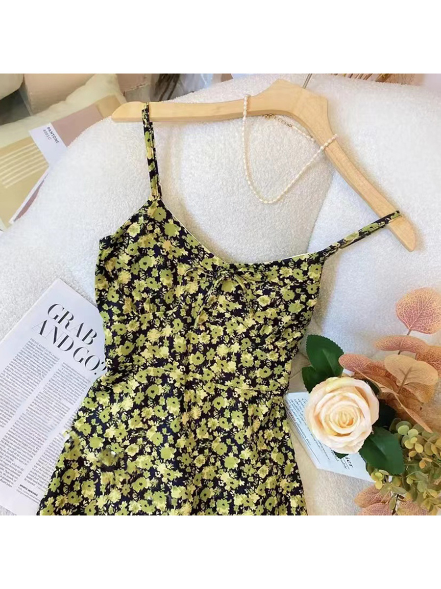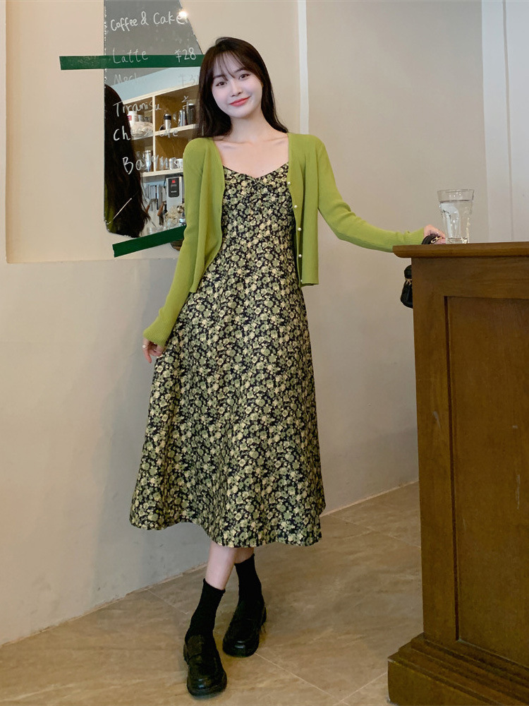 니트 카디건 봄 목가적 스타일 그린 플로럴 프린트 브이넥 슬링 원피스 여성용 플러스 사이즈 통통녀 슬림핏 스커트스토어 가기