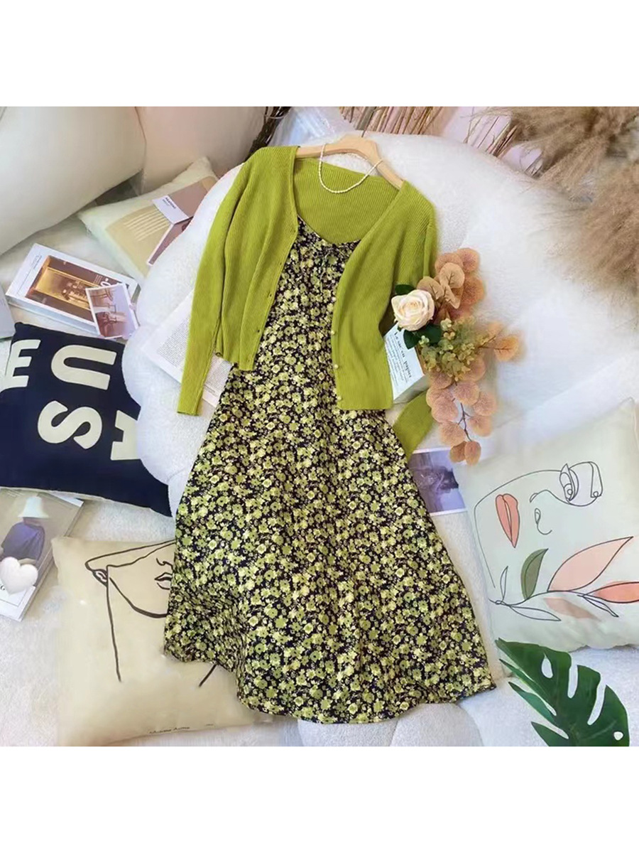 니트 카디건 봄 목가적 스타일 그린 플로럴 프린트 브이넥 슬링 원피스 여성용 플러스 사이즈 통통녀 슬림핏 스커트