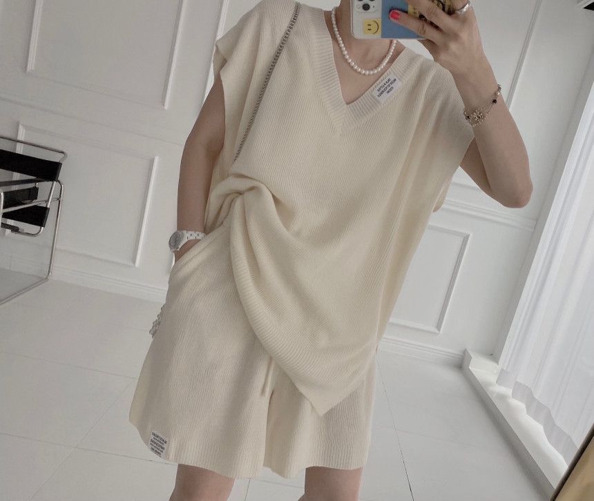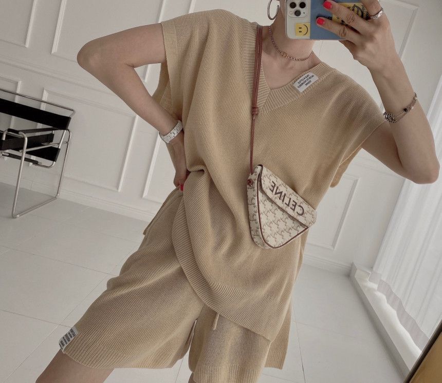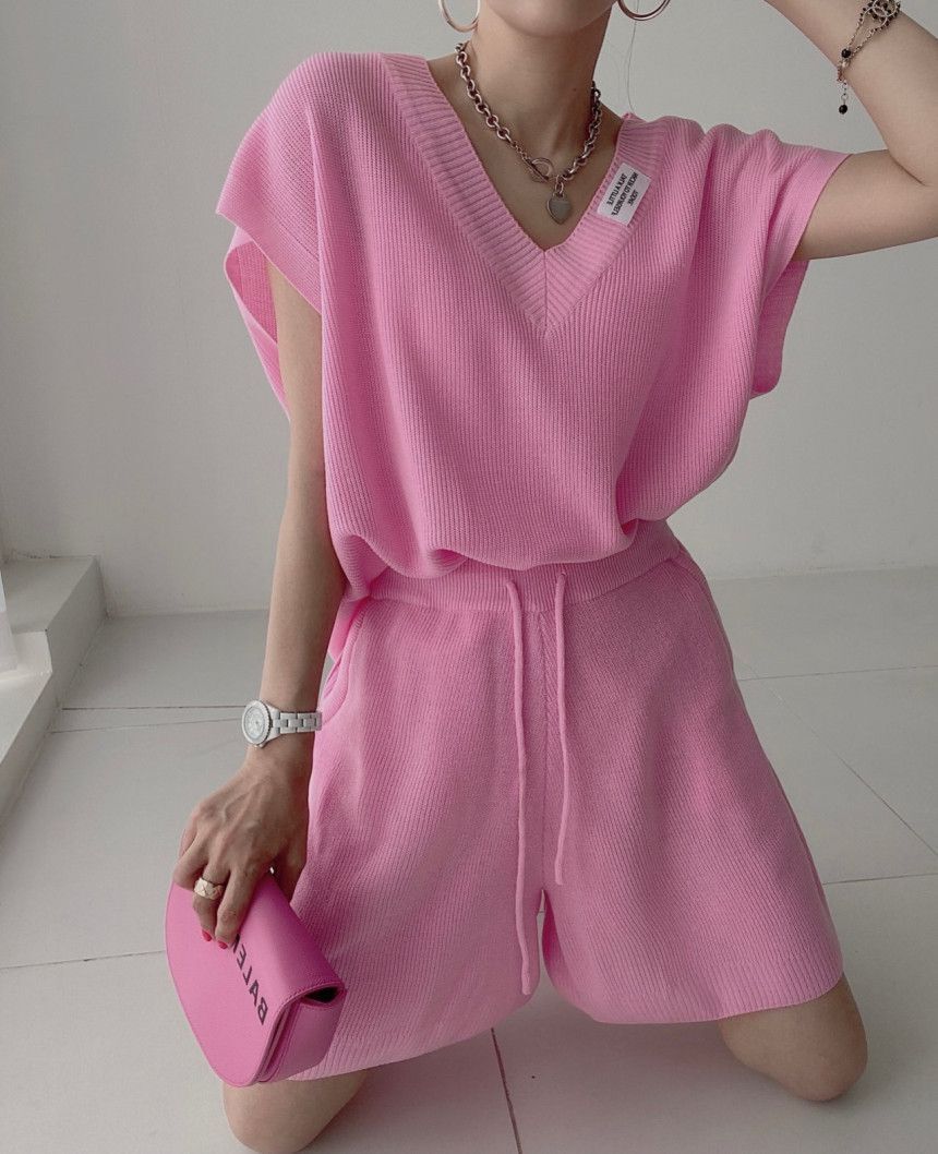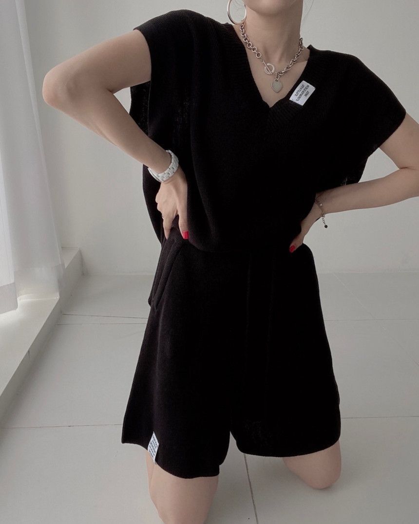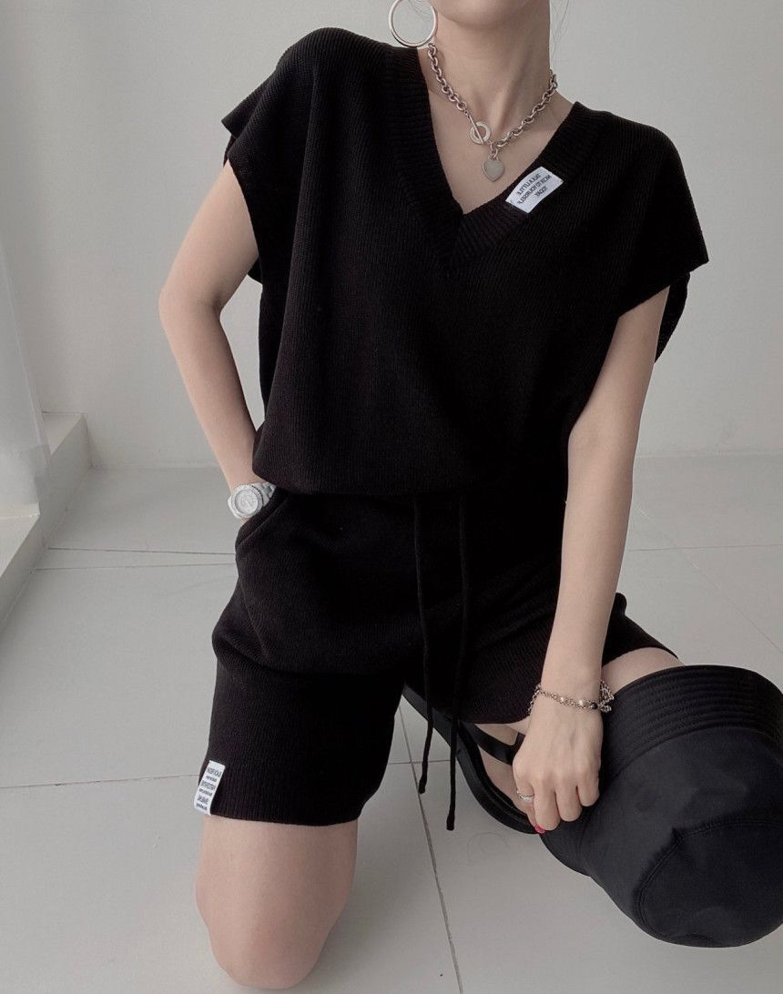 반팔 세트 브이넥 루즈한 레터 패치 반팔 스웨터 + 드로스트링 하이 웨이스트 캐주얼 와이드 레그 반바지 여성 신상품