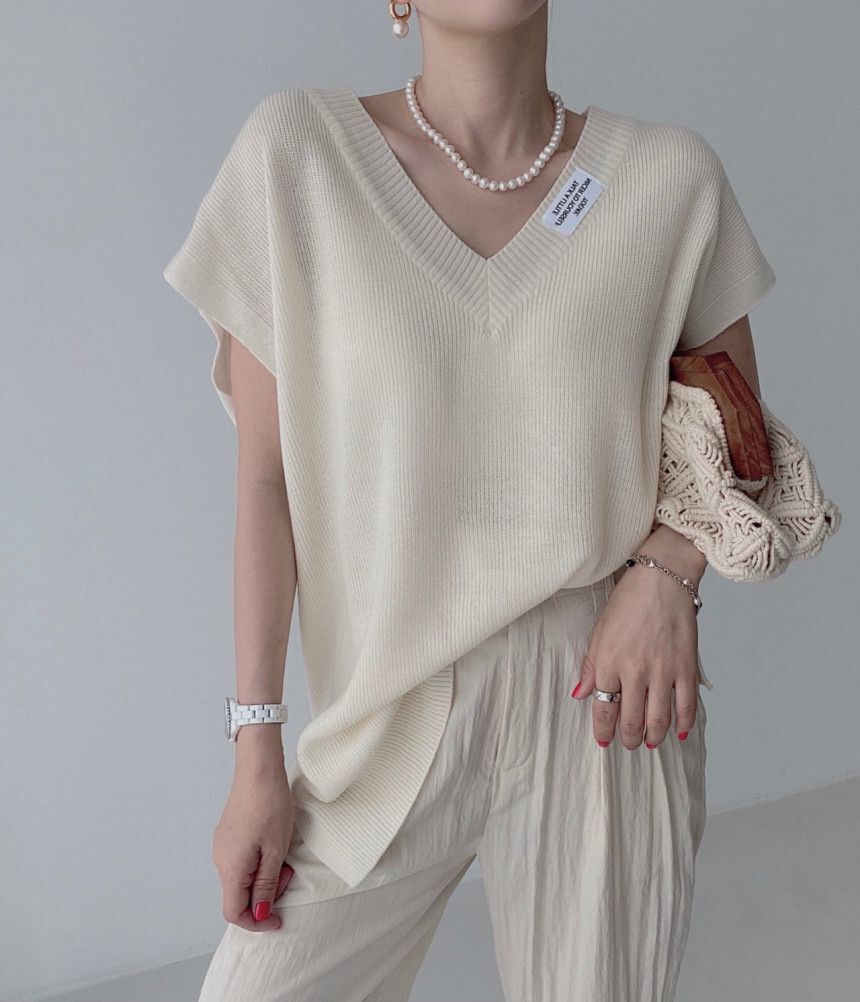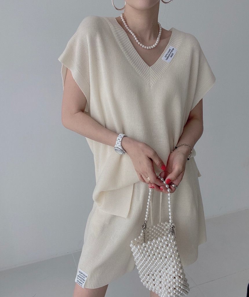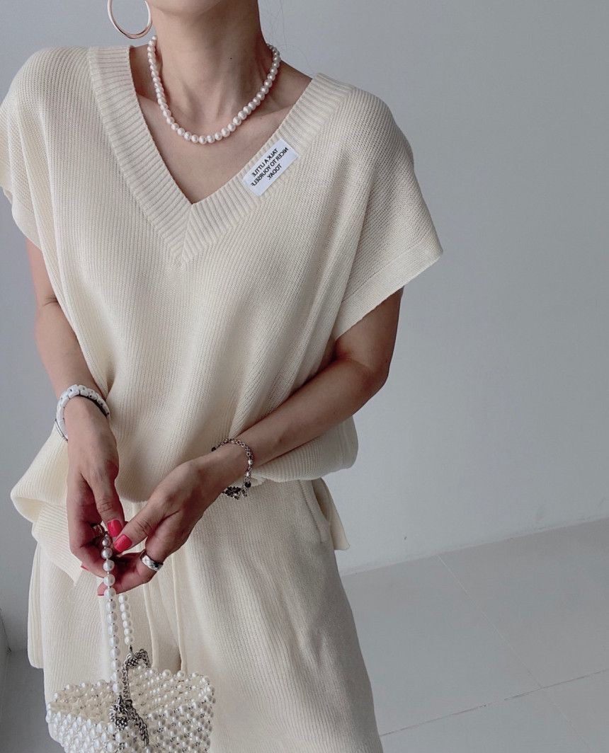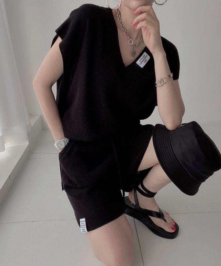 반팔 세트 브이넥 루즈한 레터 패치 반팔 스웨터 + 드로스트링 하이 웨이스트 캐주얼 와이드 레그 반바지 여성 신상품스토어 가기