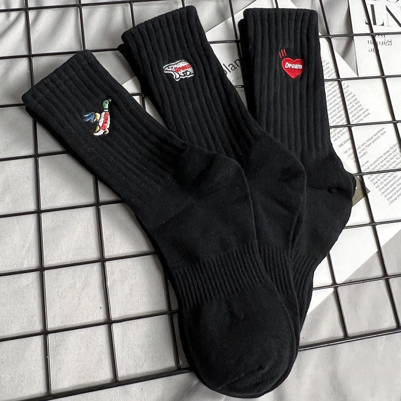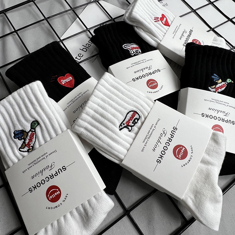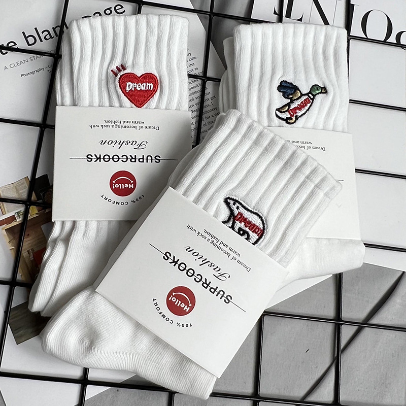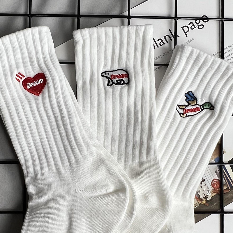 한 바늘 이중 실 유 웬레 같은 스타일 남성용 중간 높은 스타킹 북극곰 자수 스타킹 어린이를위한 흑백 단색 면 스타킹스토어 가기