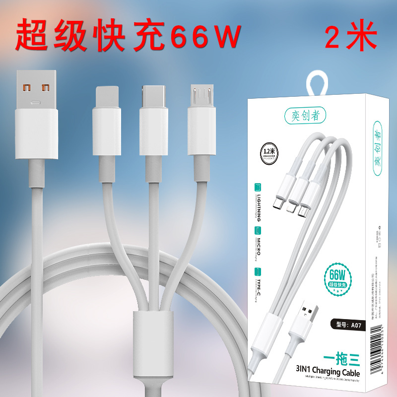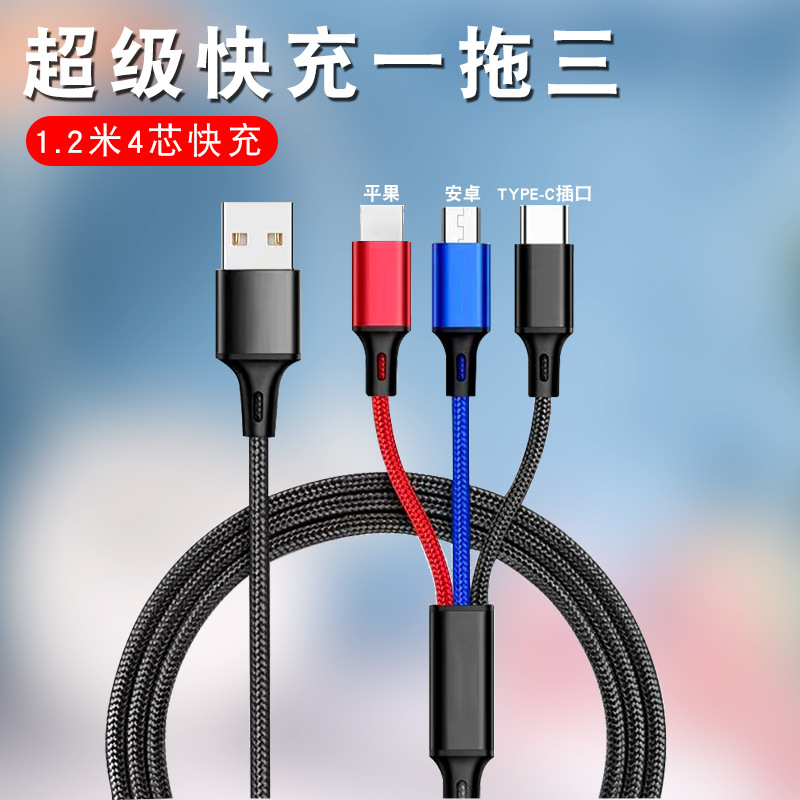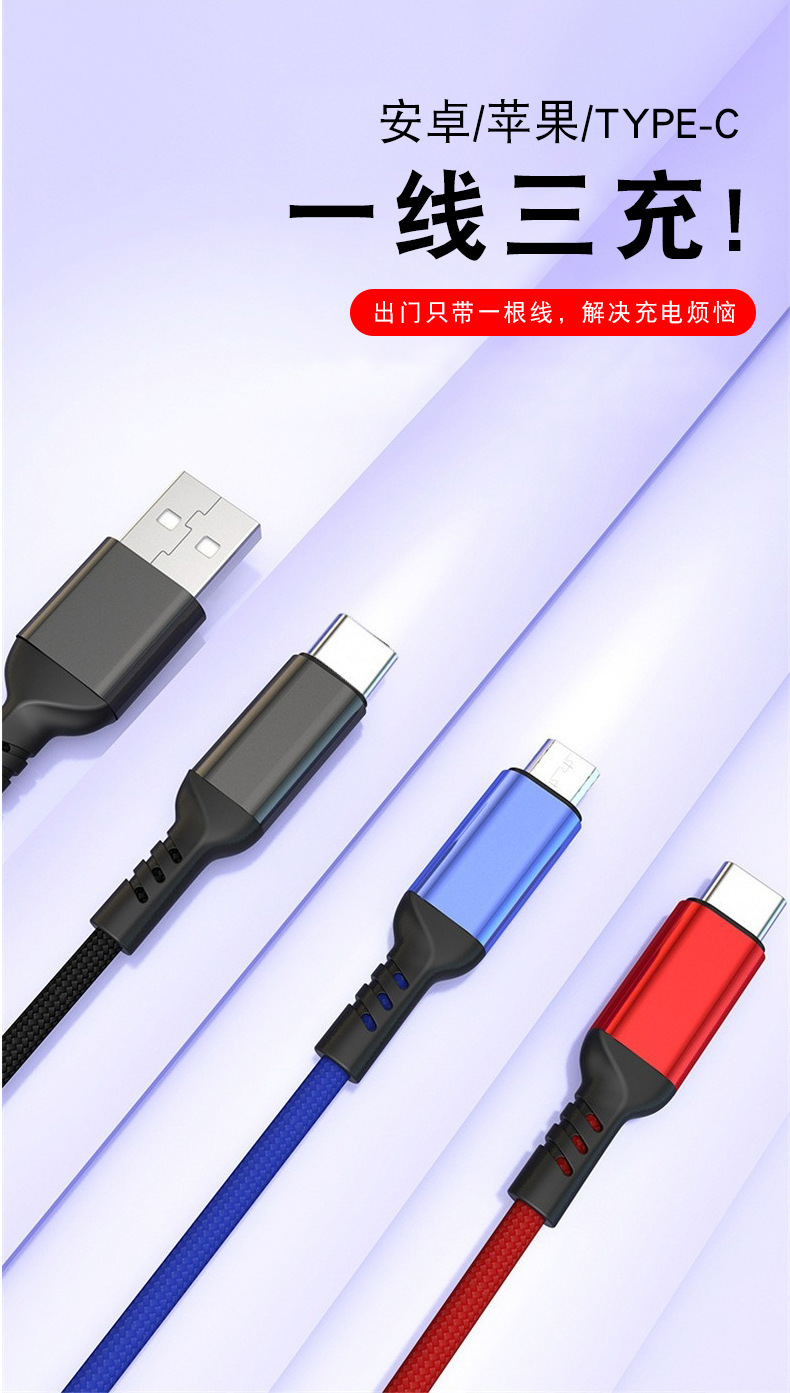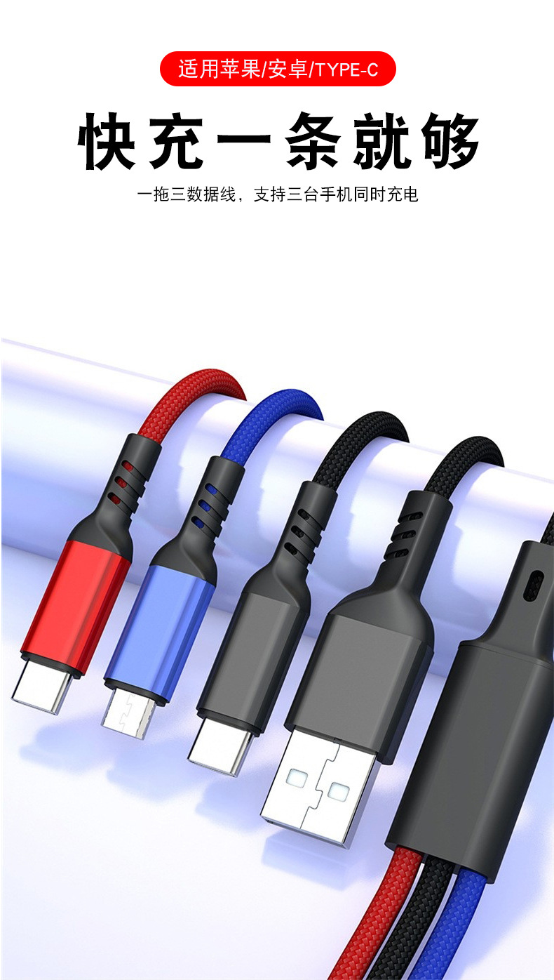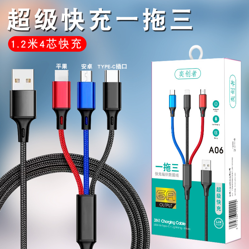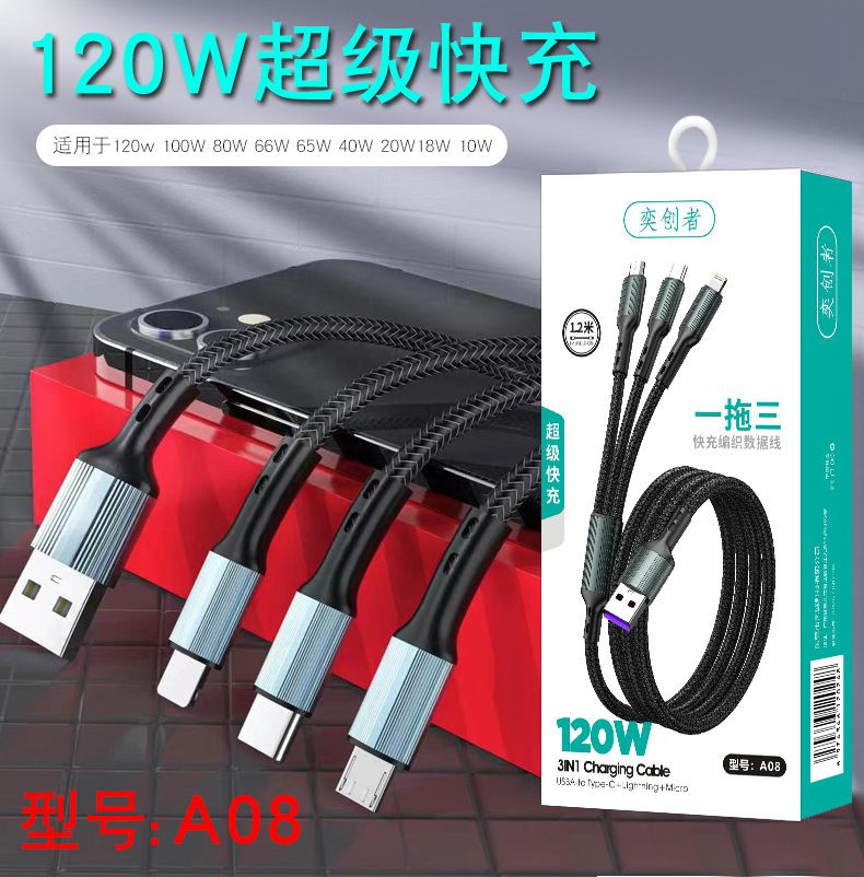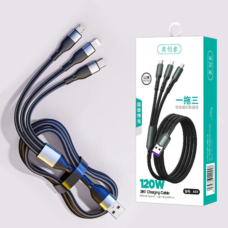 초고속 충전 120W 1 대 3 데이터 라인 원단 직조 3 대 1 충전 라인 6A 휴대 전화 데이터 라인 도매스토어 가기