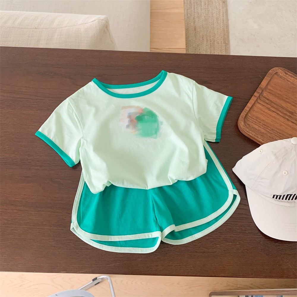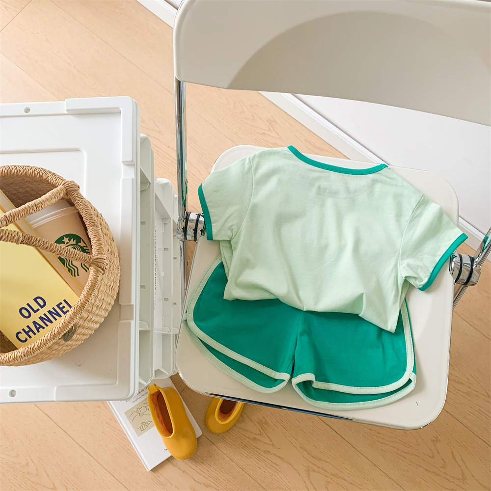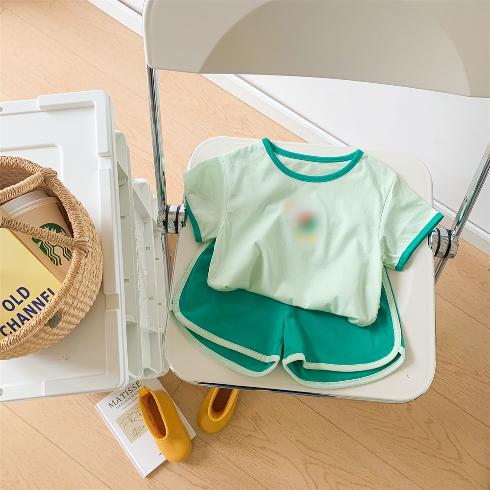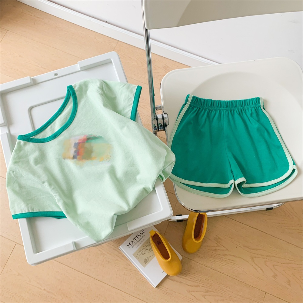 아동복 반팔 여름 아동복 신상품 남아 여아 면 투피스 세트 한국 스타일 배색 만화 반팔 반바지스토어 가기