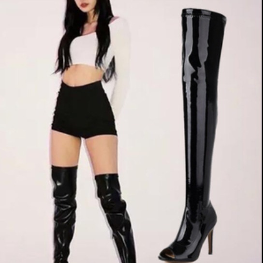리사와 같은 스타일의 롱부츠, 재즈댄스 하이힐, 오픈토 피쉬마우스 JAZZ 여성용 페이턴트 가죽 오버니부츠, 라지사이즈스토어 가기