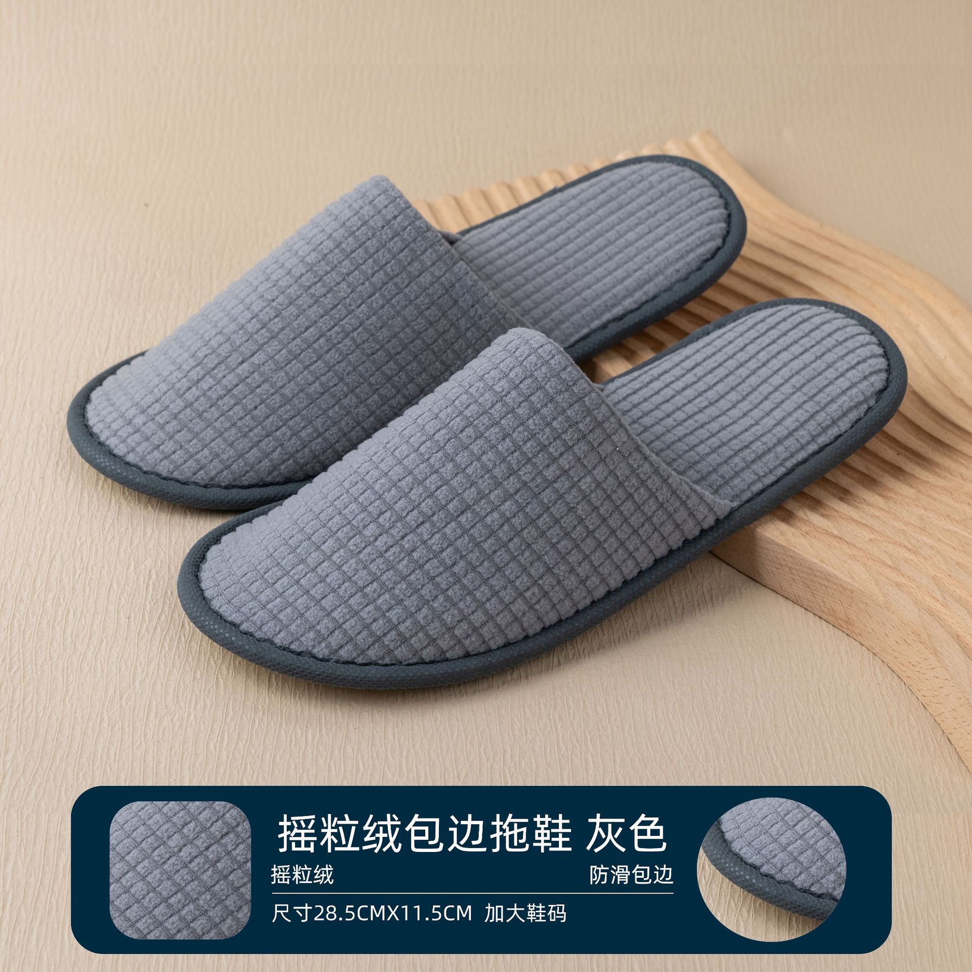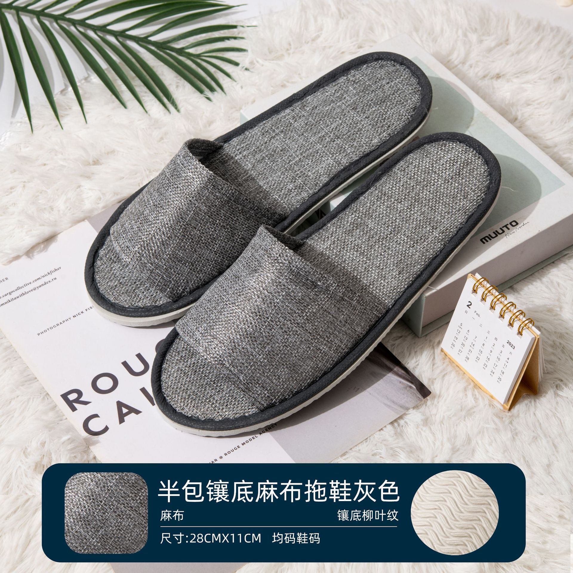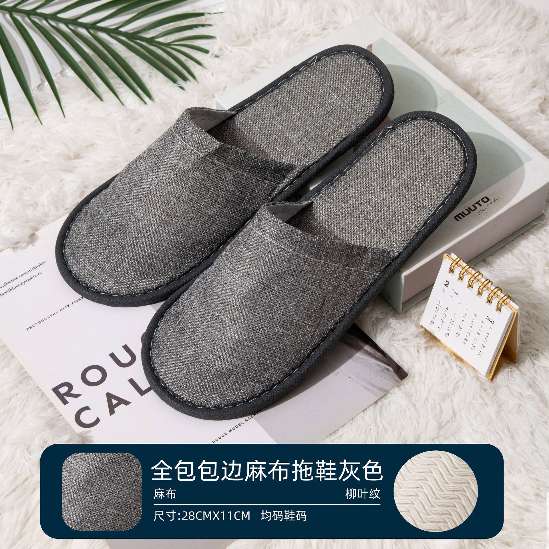 • 암호화된 회색 리넨 가장자리 미끄럼 방지 밑창 슬리퍼