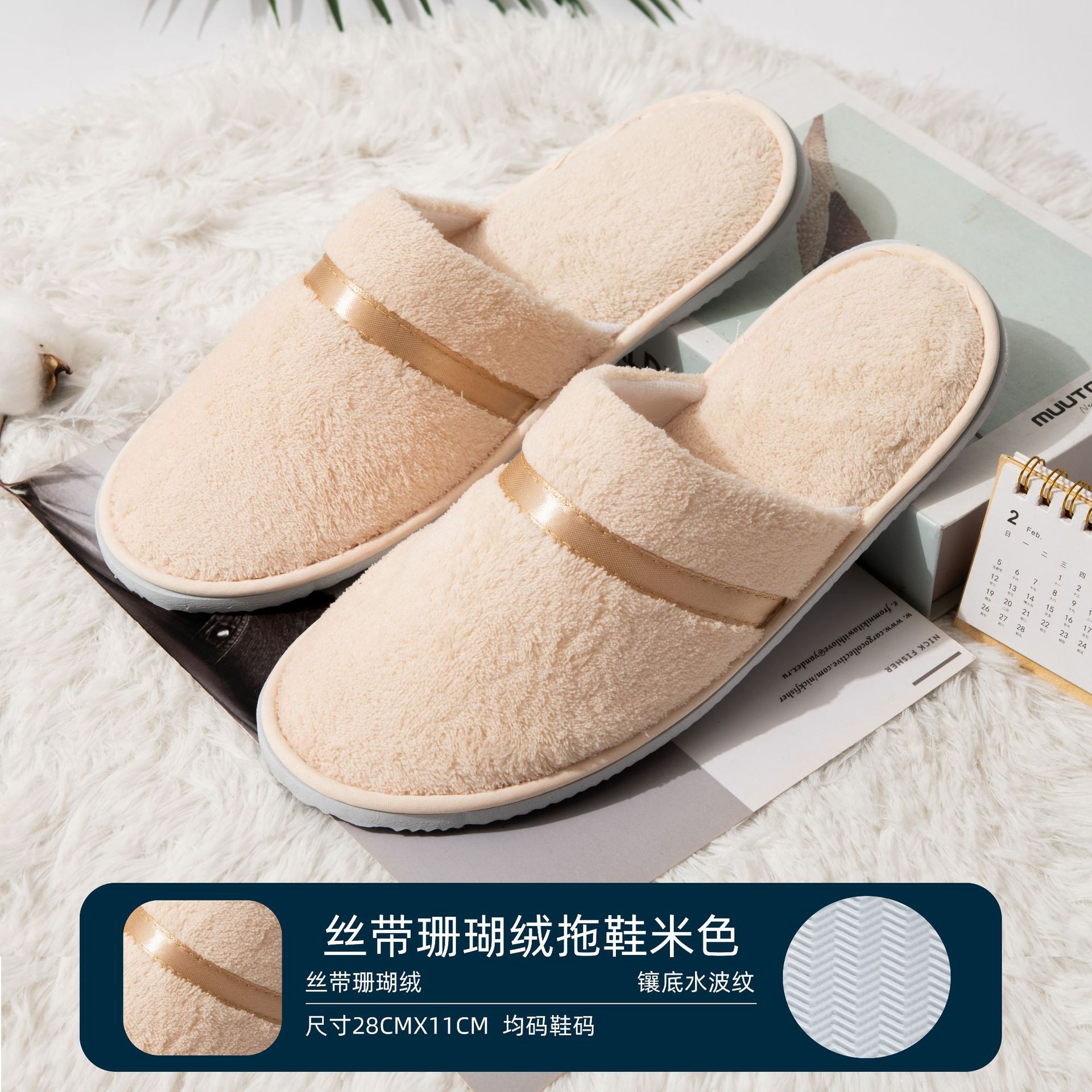• 리본 산호 양털 슬리퍼 (베이지)