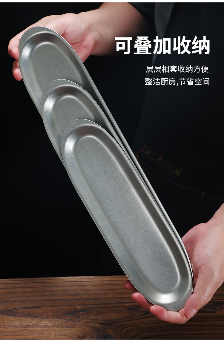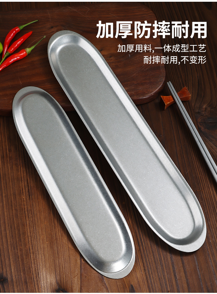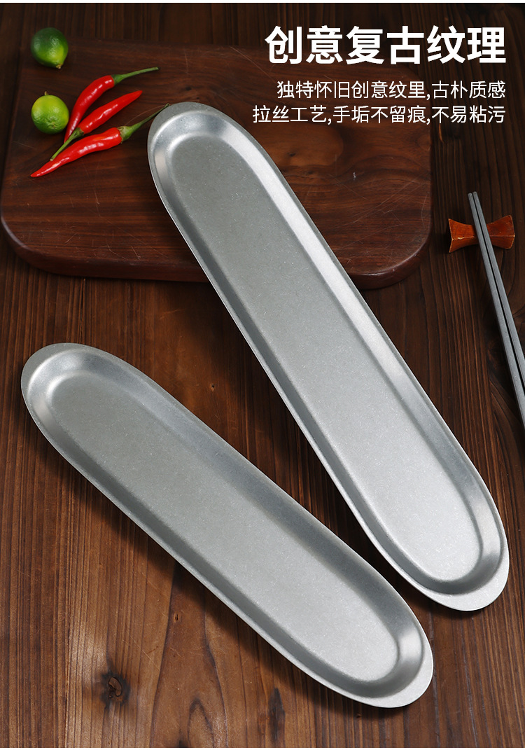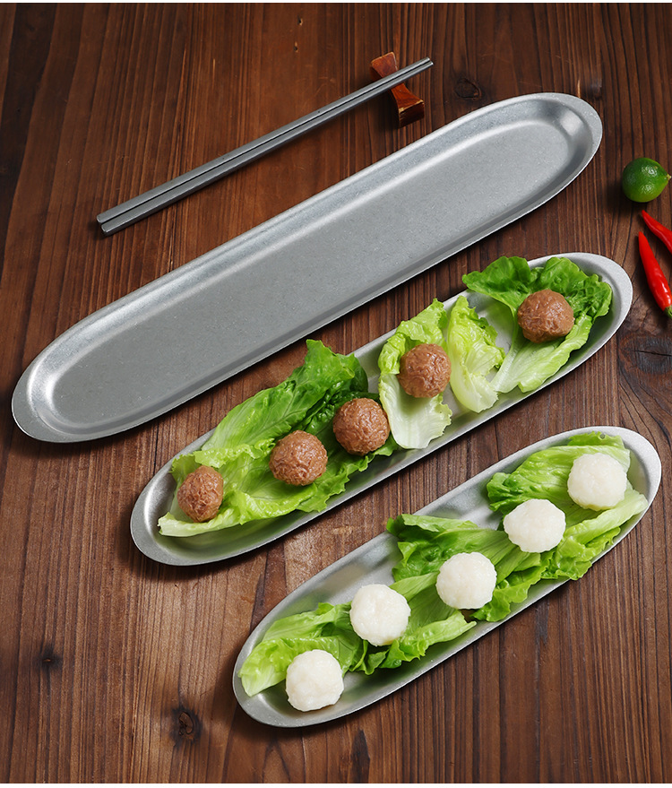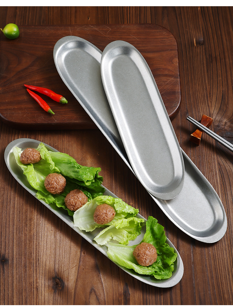 빈티지 한국식 스테인레스 스틸 새우 슬라이딩 플레이트 오래 된 바베큐 뱀 접시 쇠고기 공 접시 타원형 직사각형 접시 희미한 돼지 접시