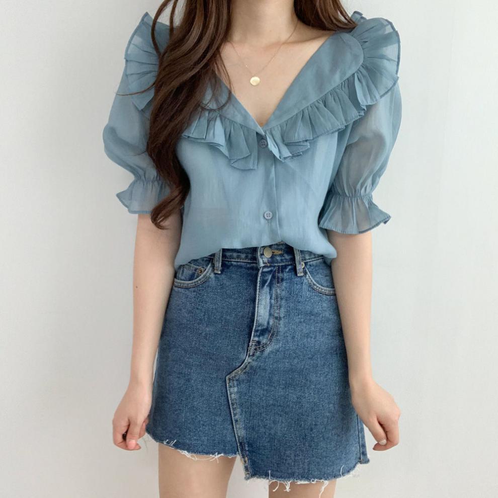 여름 디자인 센스 틈새 러플 나이 감소 스위트 퍼프 슬리브 쉬폰 셔츠 여성용 서양풍 탑스토어 가기