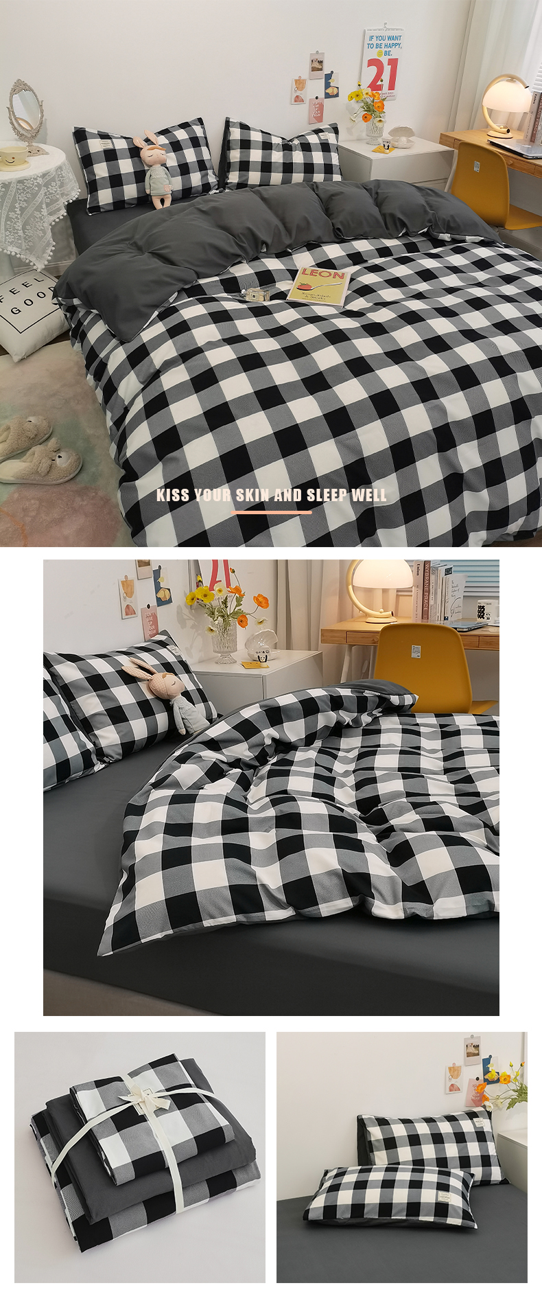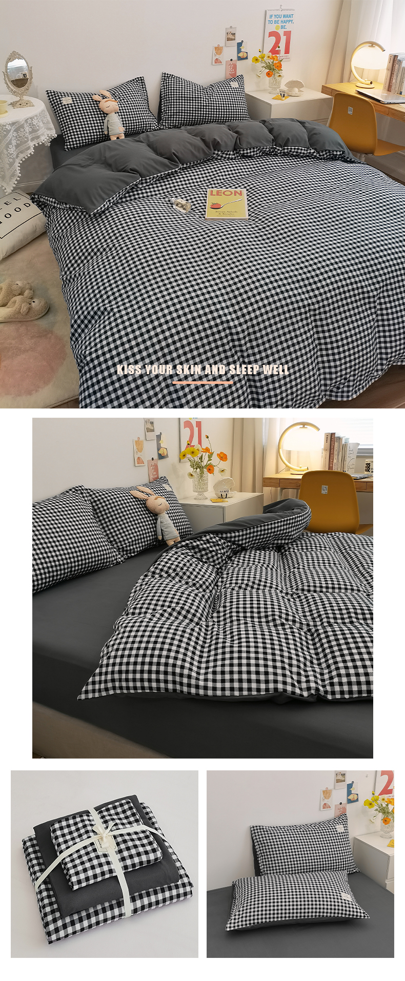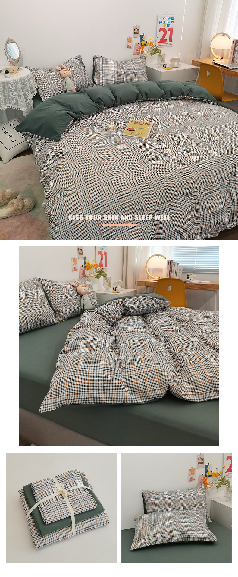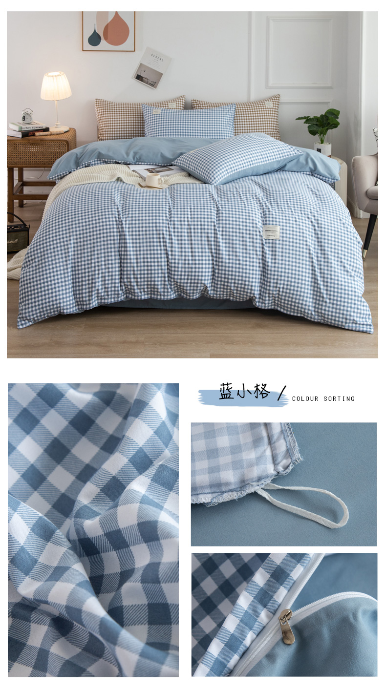 심플 체크 4 종 세트 침구 침대 시트 이불 커버 여름 학생 기숙사 봄과 가을 싱글 침대 3 종 세트