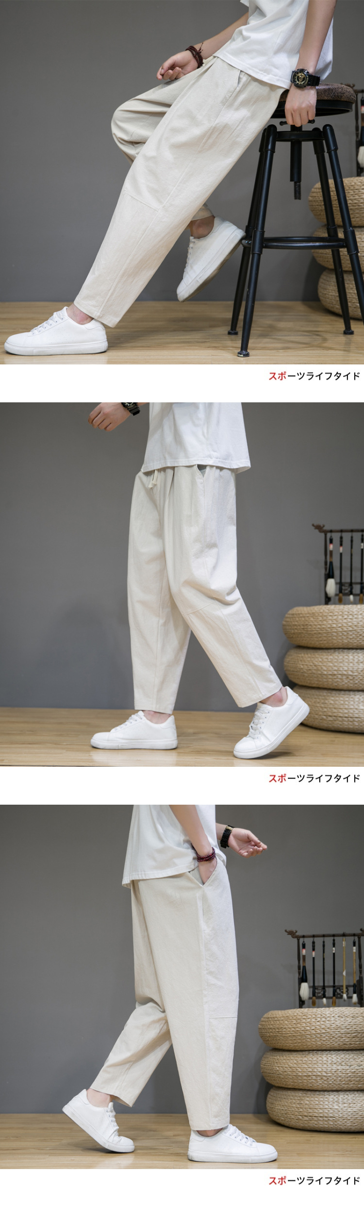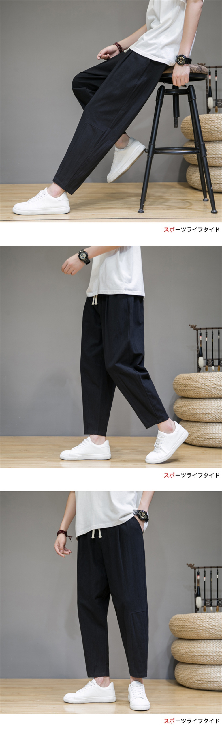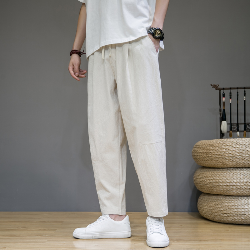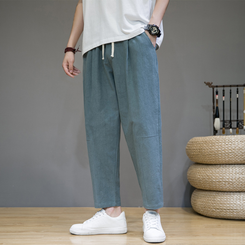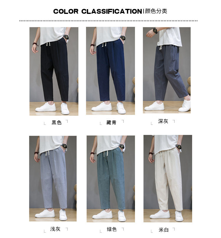 여름 새로운 중국 스타일 남자의 단색 면 린넨 느슨한 발목 길이 바지 청소년 패션 유행 캐주얼 스포츠 바지