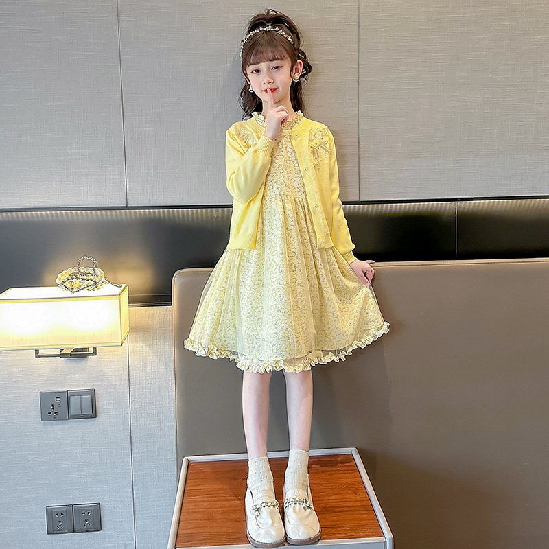 2023 새로운 아동복 소녀 패션 세트 봄 대형 아동 웨스턴 카디건 스웨터 플로럴 스커트 투피스 패션