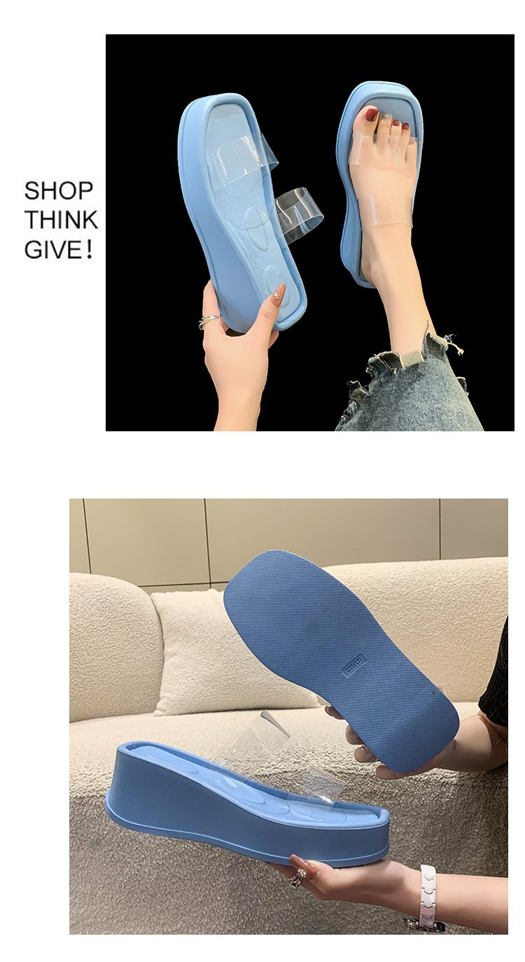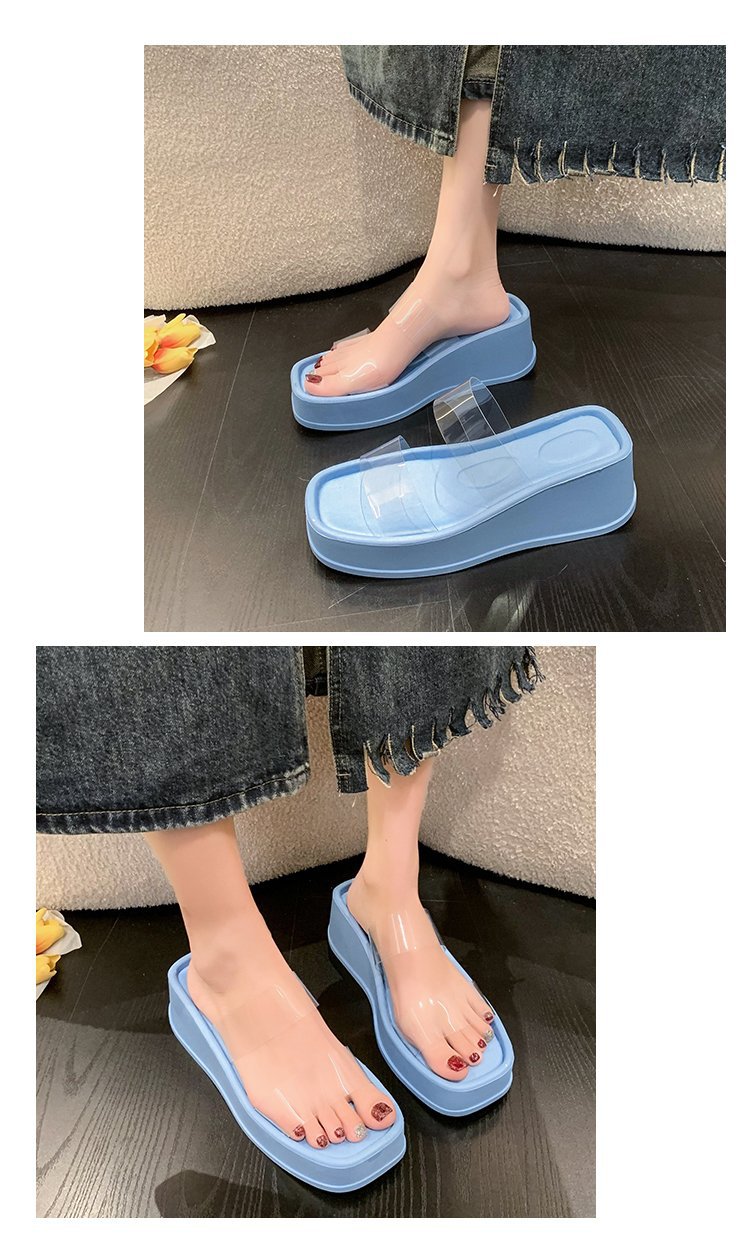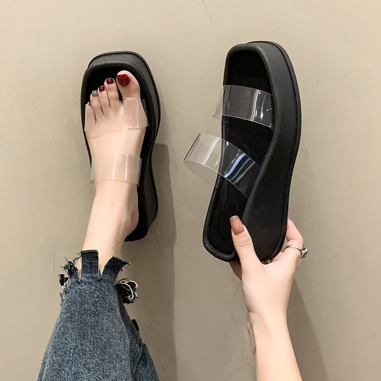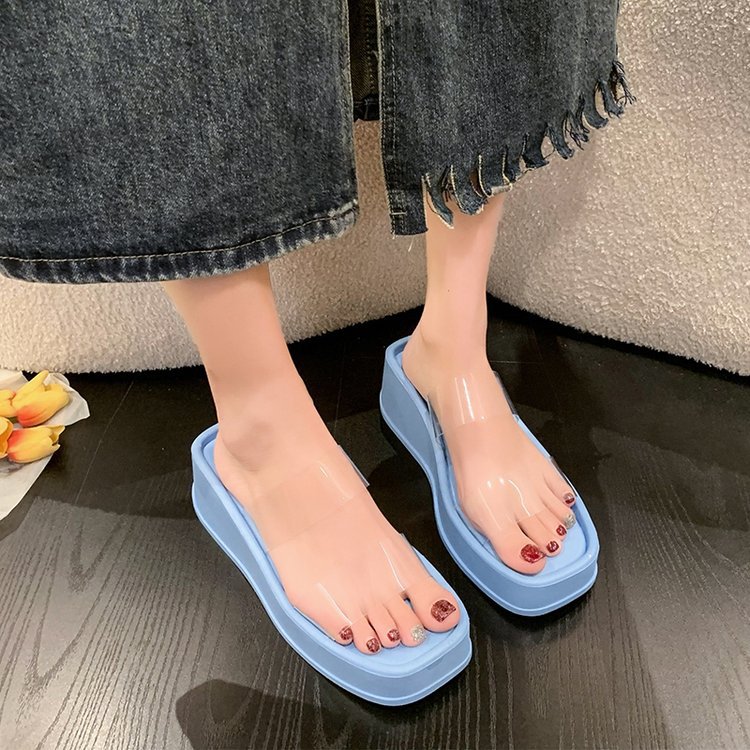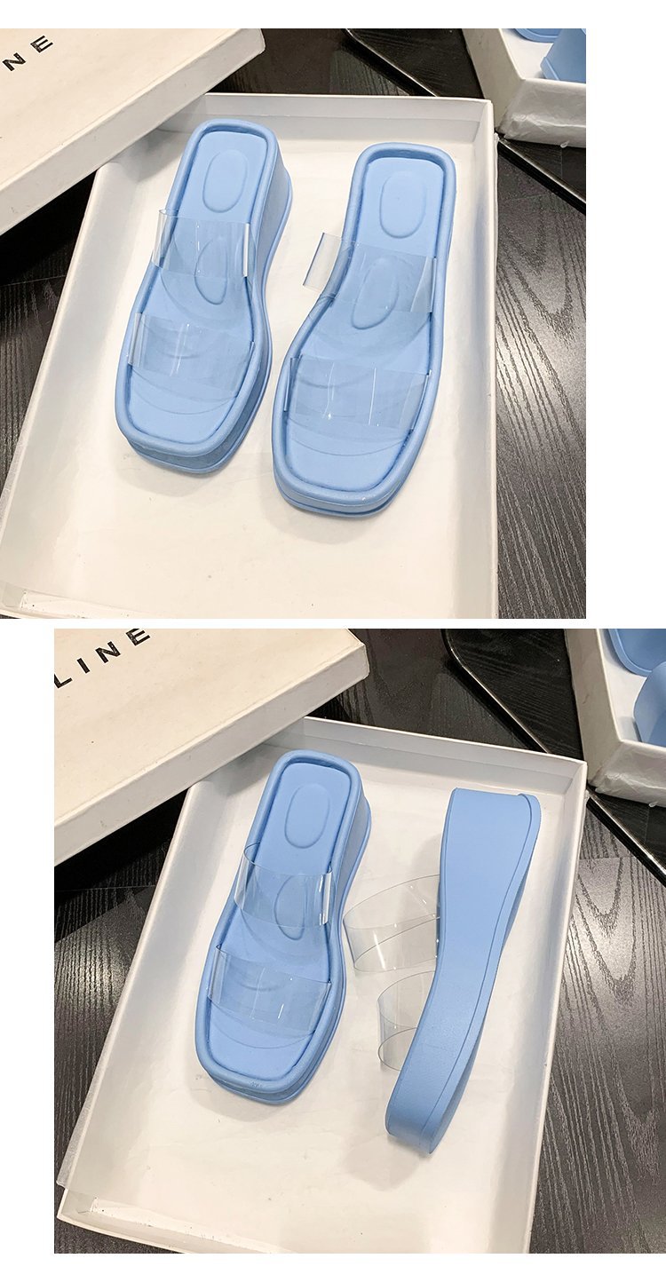 플랫 웨지 슬리퍼 여성용 2023 여름 새로운 스퀘어 토 오픈 토 투명 한 모양의 웨지 슬리퍼스토어 가기