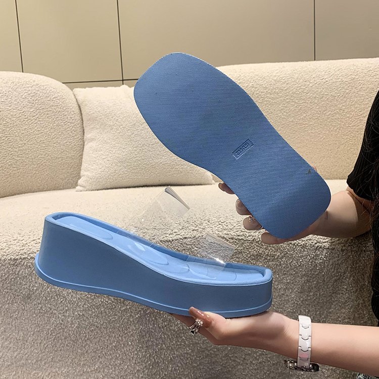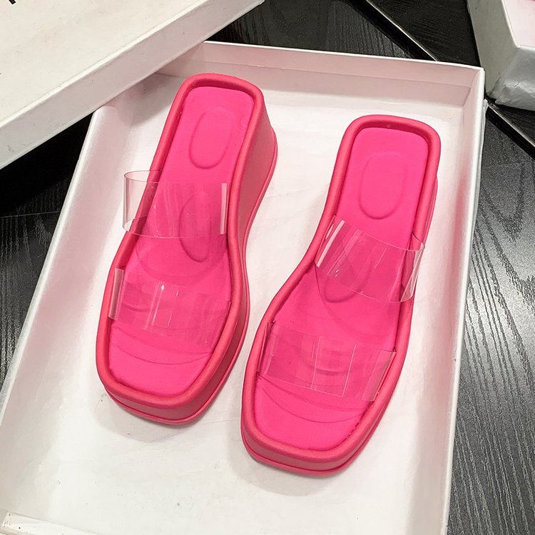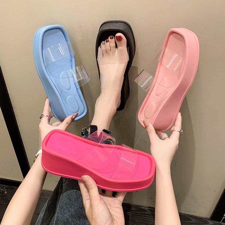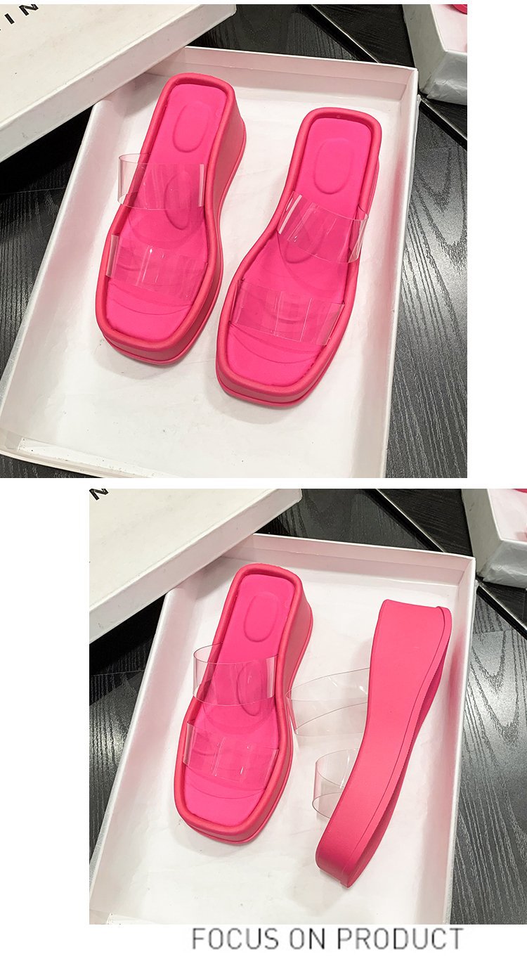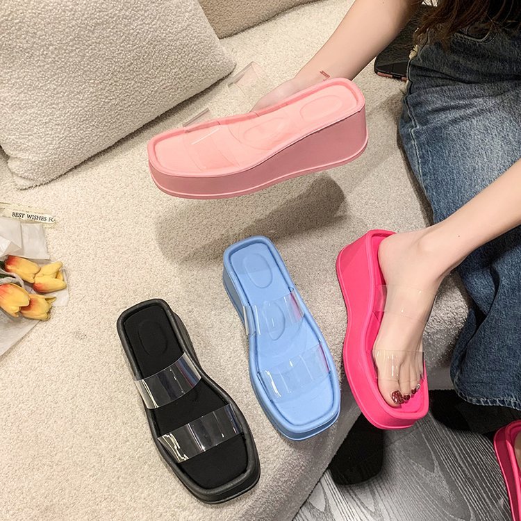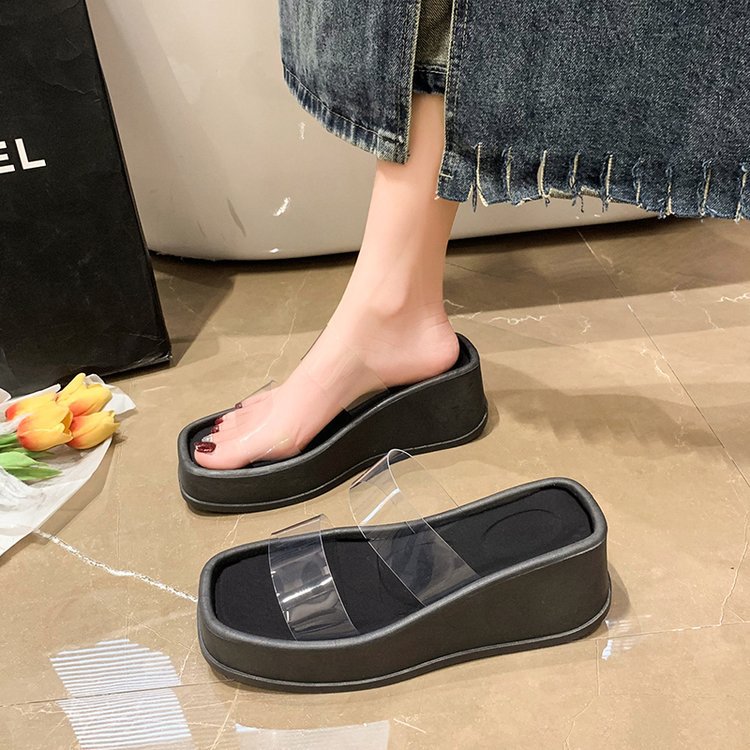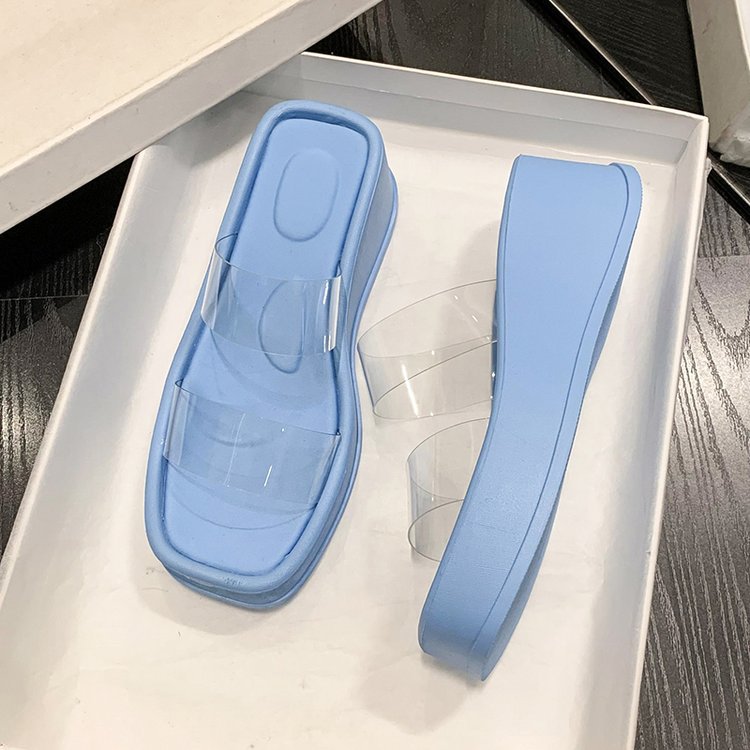 플랫 웨지 슬리퍼 여성용 2023 여름 새로운 스퀘어 토 오픈 토 투명 한 모양의 웨지 슬리퍼스토어 가기