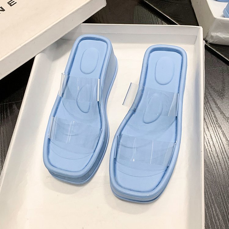 플랫 웨지 슬리퍼 여성용 2023 여름 새로운 스퀘어 토 오픈 토 투명 한 모양의 웨지 슬리퍼