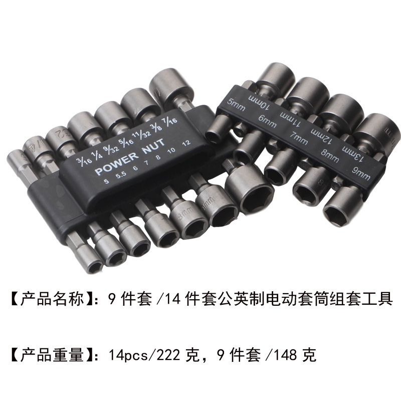 【产品名称】:9件套/14件套公英制电动套筒组套工具