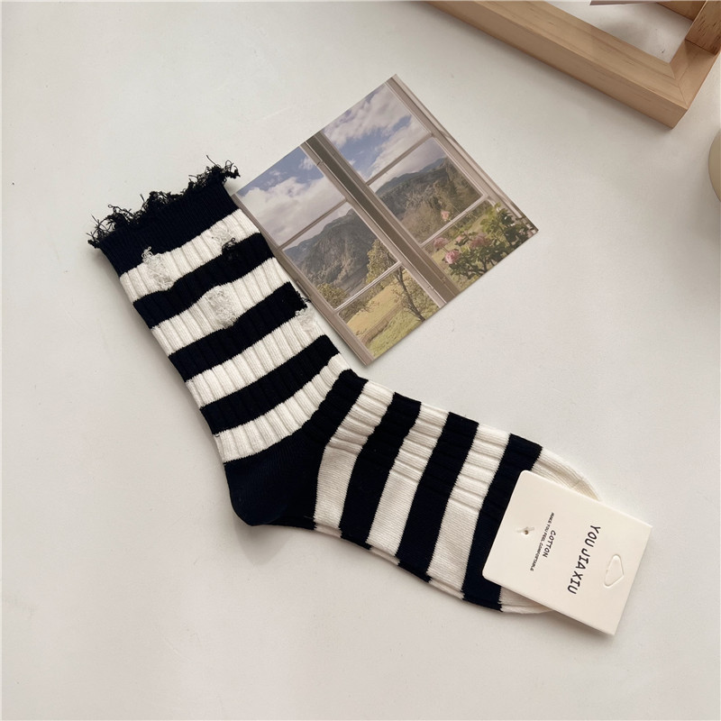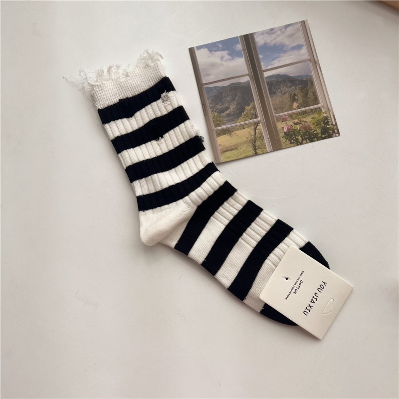 찢어진 거지 양말 여자의 작은 빨간 승마 책 같은 스타일 흑백 줄무늬 찢어진 양말 인스 타 그램 인기 온라인 여성 양말 유행 양말스토어 가기