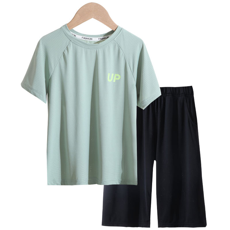 어린이 여름 얇은 반팔 세트 아이스 실크 메쉬 통기성 중소 어린이 여름 반팔 티셔츠 반바지 2 종 세트