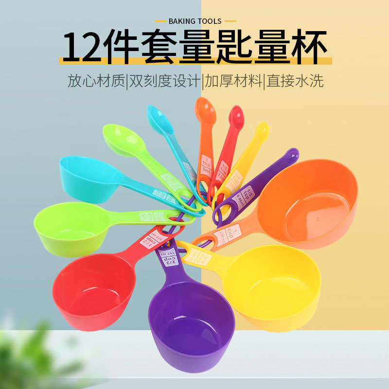 베이킹 도구 측정 컵 측정 숟가락 주방 가제트 12 조각 세트 컬러 플라스틱 측정 컵 측정 숟가락 세트 재고 도매