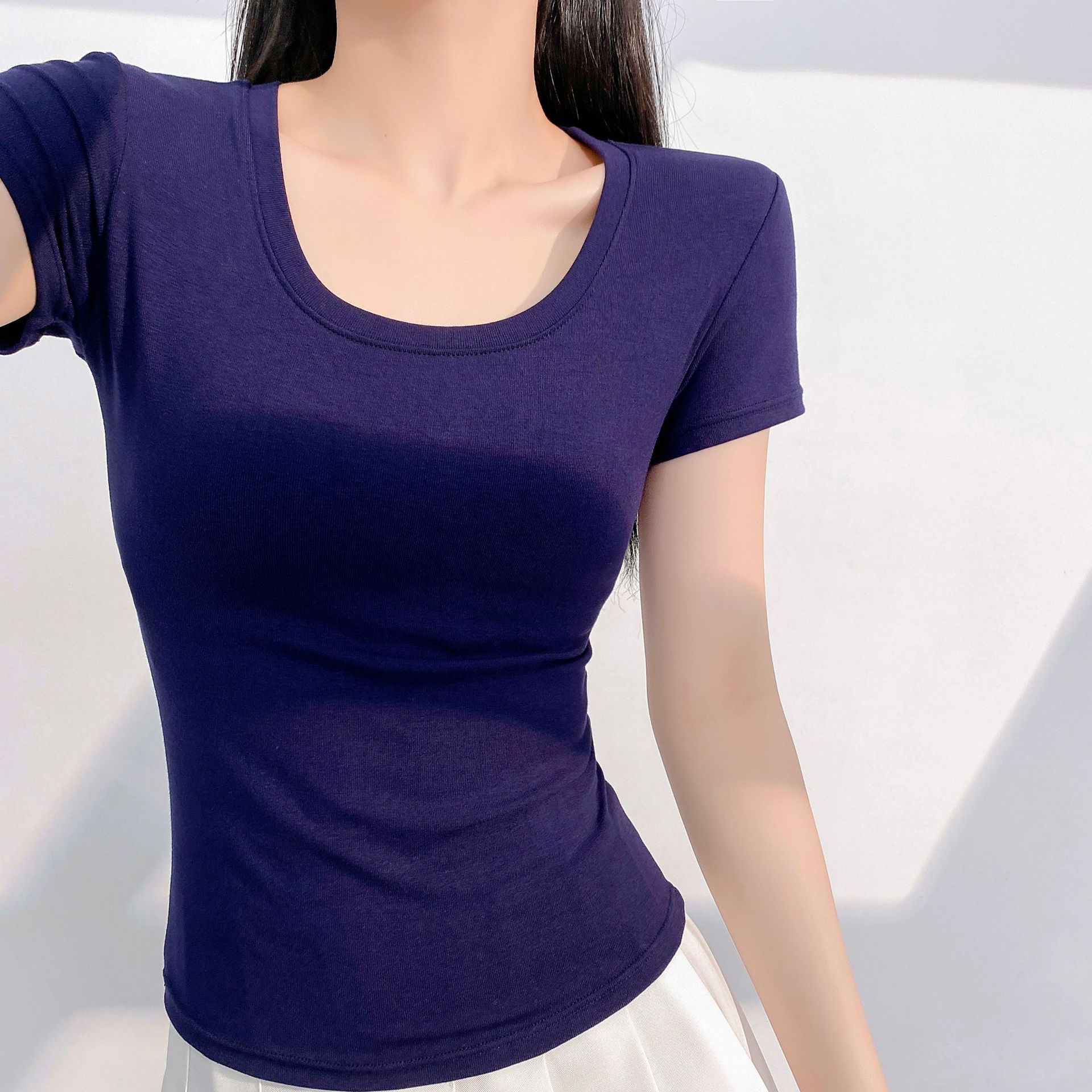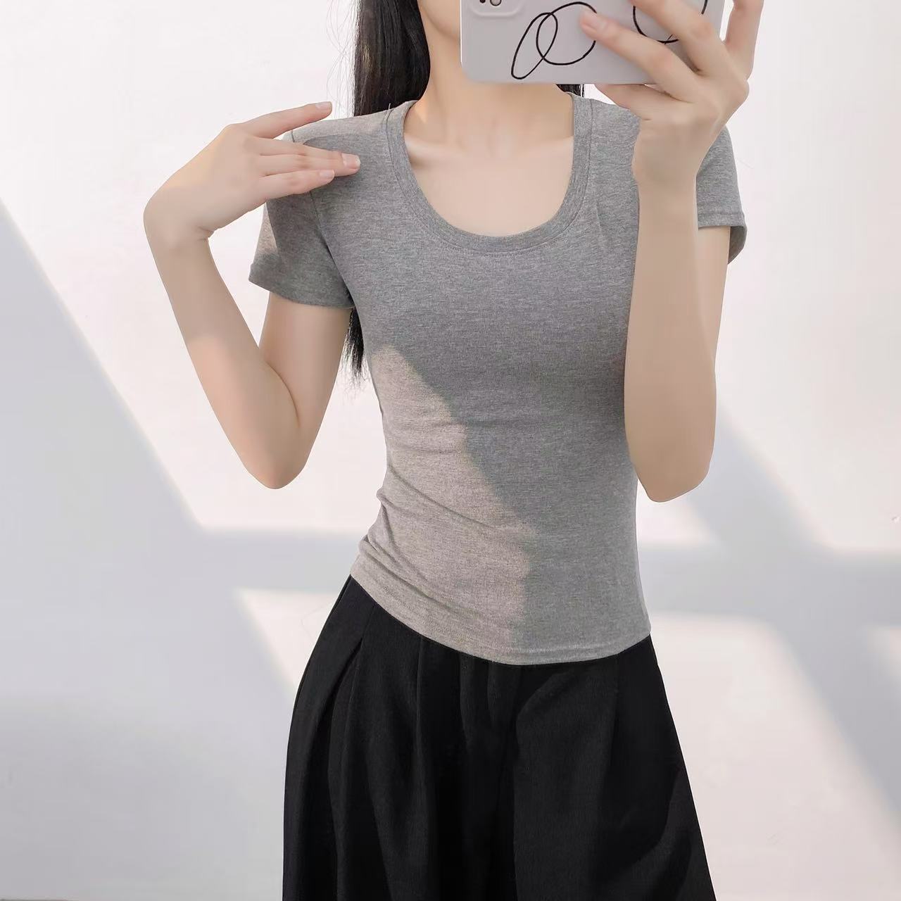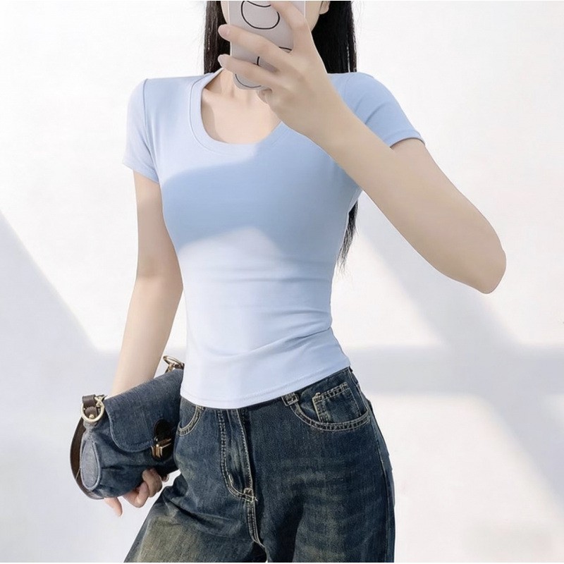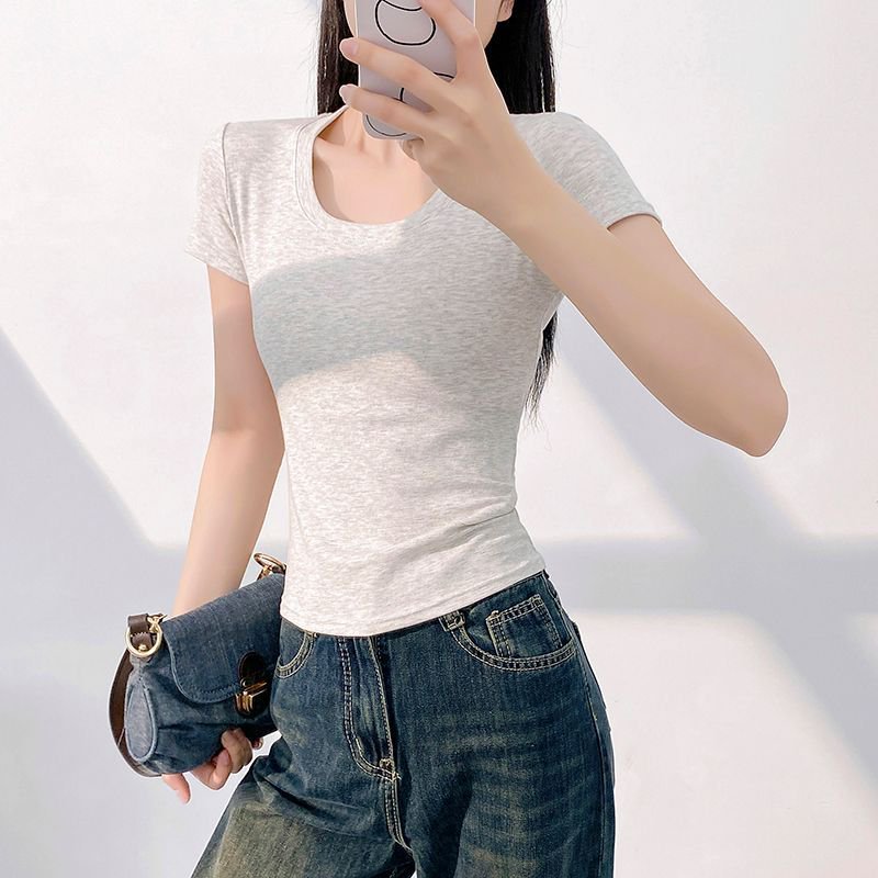 또 다른 짧은 소매 슬림 티셔츠 여성의 유럽 용품 여름 새로운 외국 스타일 연령 감소 물고기 뼈 짧은 셔츠 도매