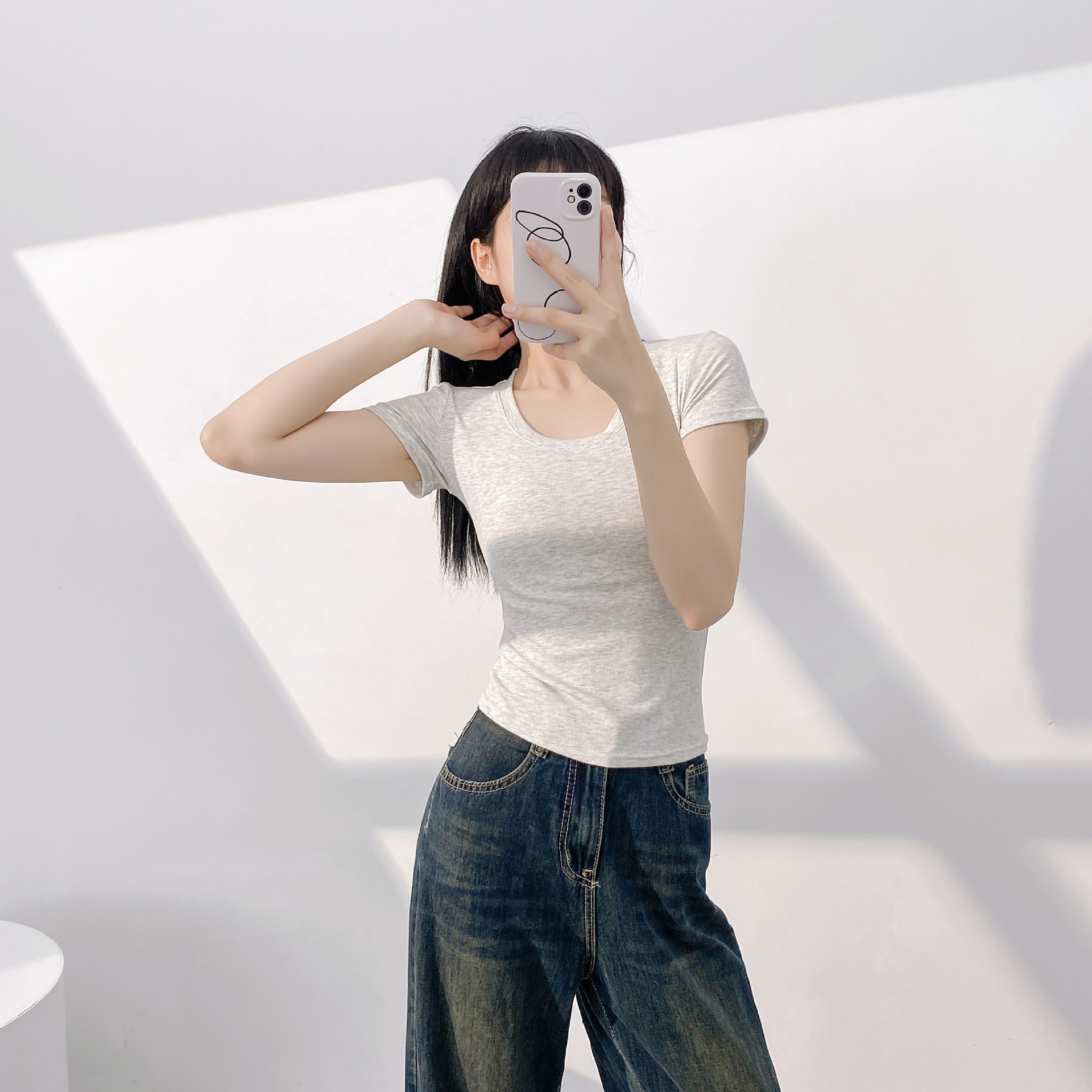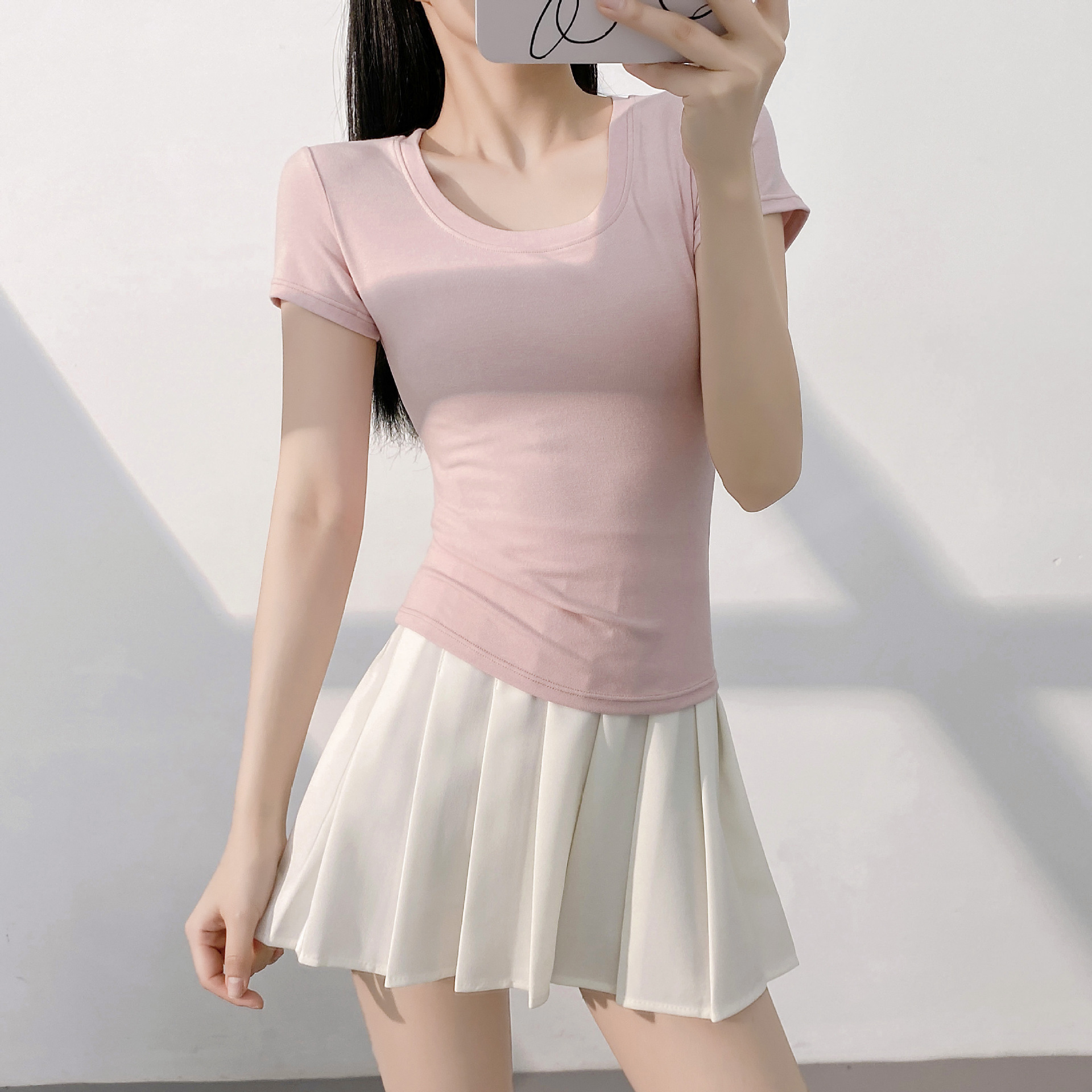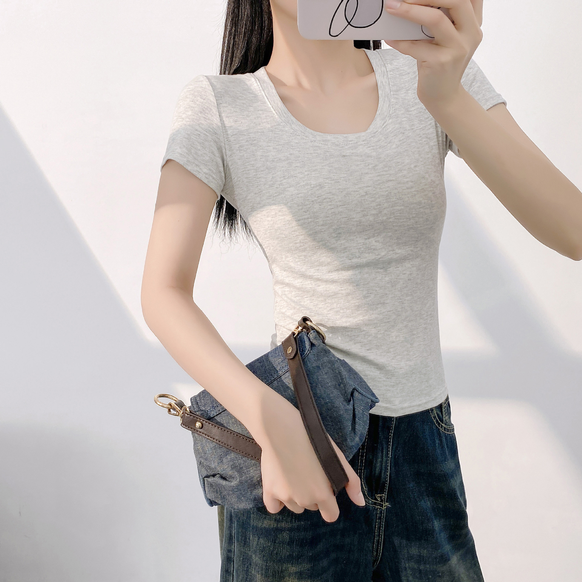 또 다른 짧은 소매 슬림 티셔츠 여성의 유럽 용품 여름 새로운 외국 스타일 연령 감소 물고기 뼈 짧은 셔츠 도매