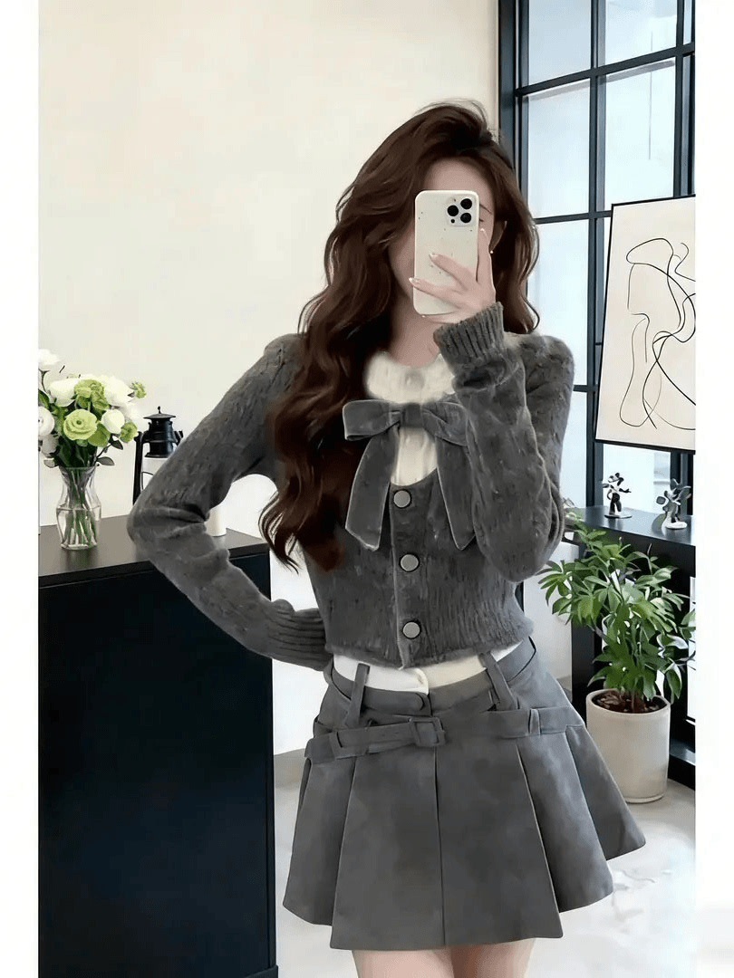 부드럽고 달콤한 스타일의 리본 니트 탑과 가을 겨울 신상 하이웨이스트 플리츠 스커트 투피스 여성 패션 세트