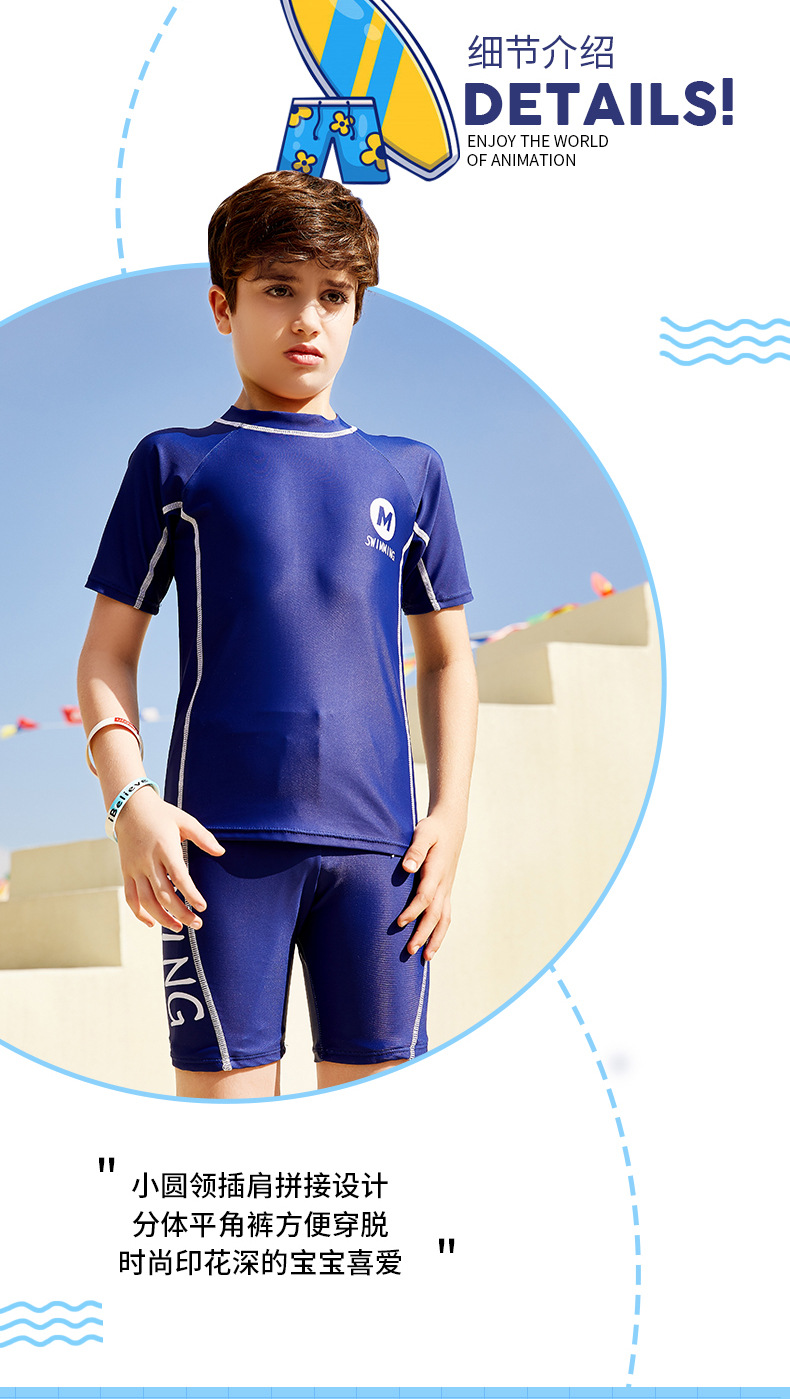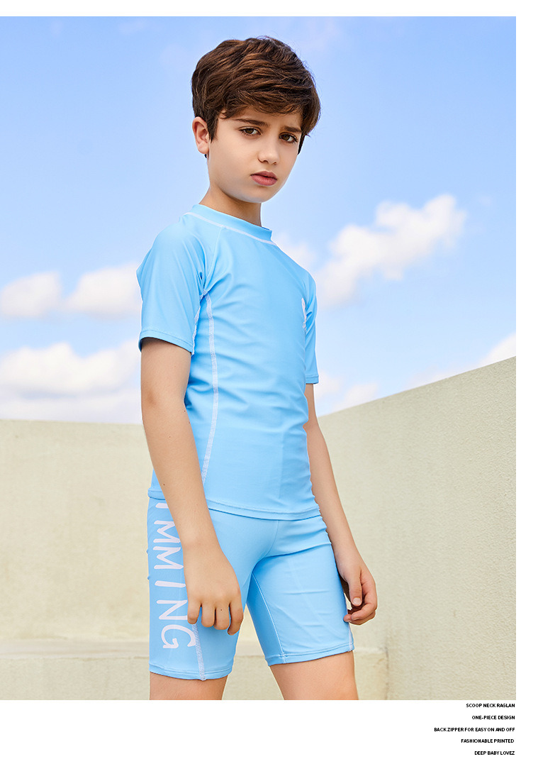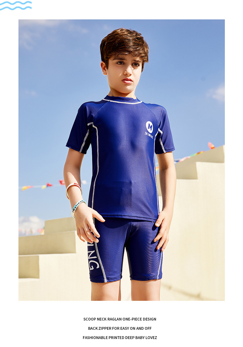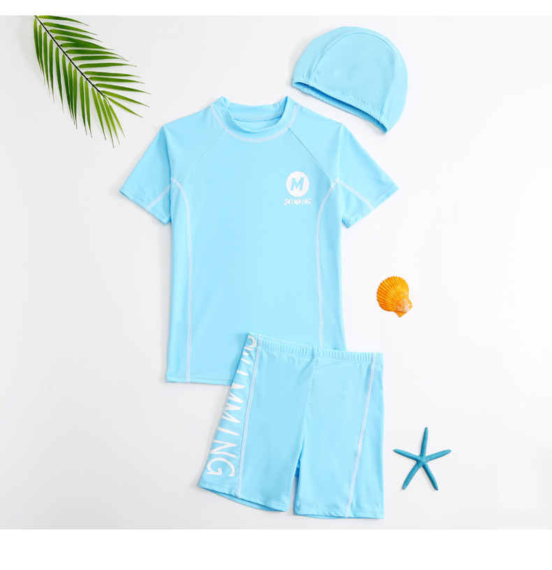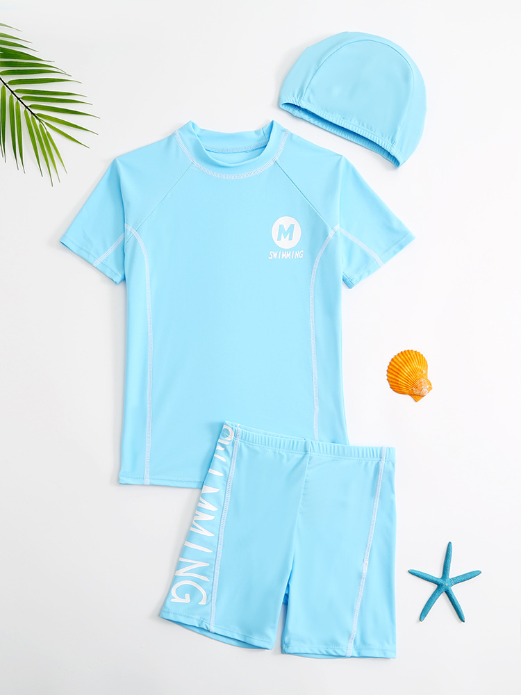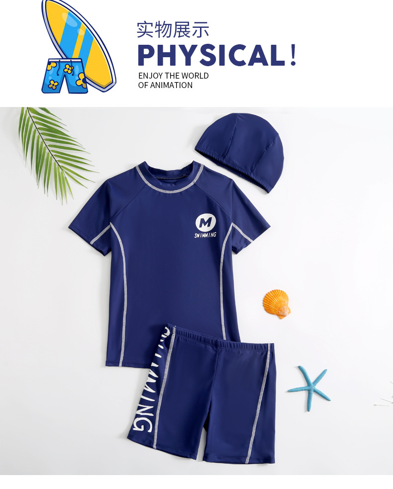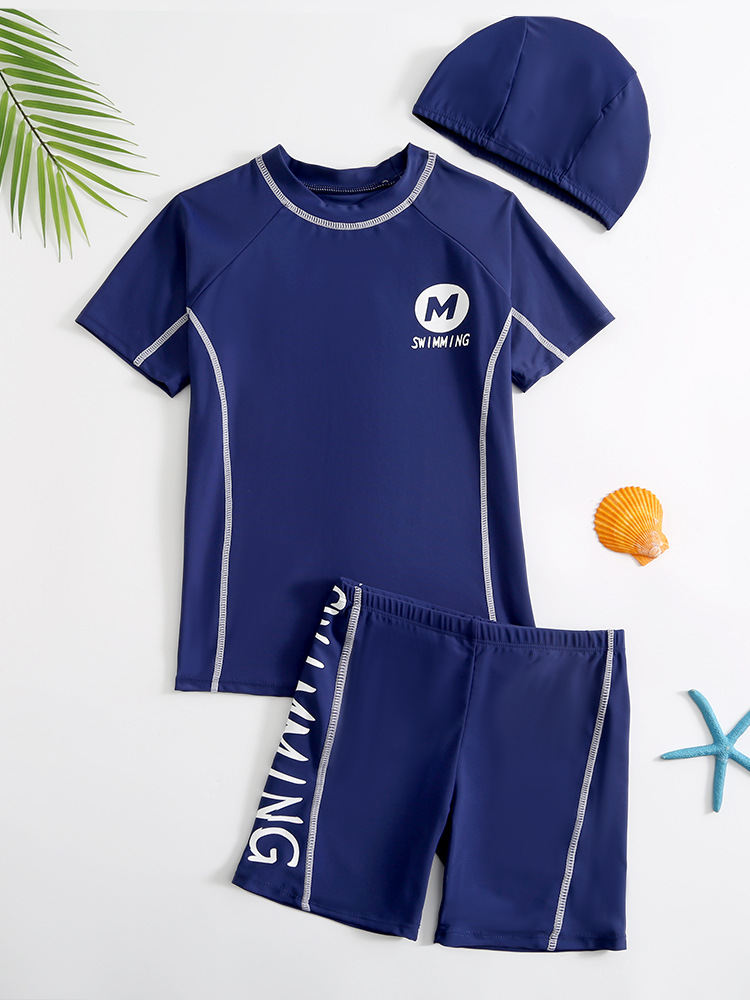 2023 학생 남자의 중간 및 큰 어린이 수영복 수영복 수영복 트렁크 수영 모자 3 피스 세트 어린 소년 수영복 분할