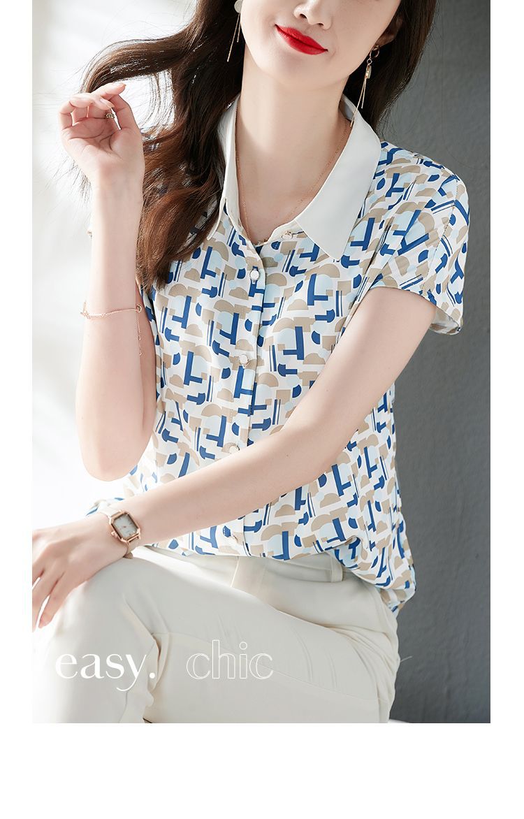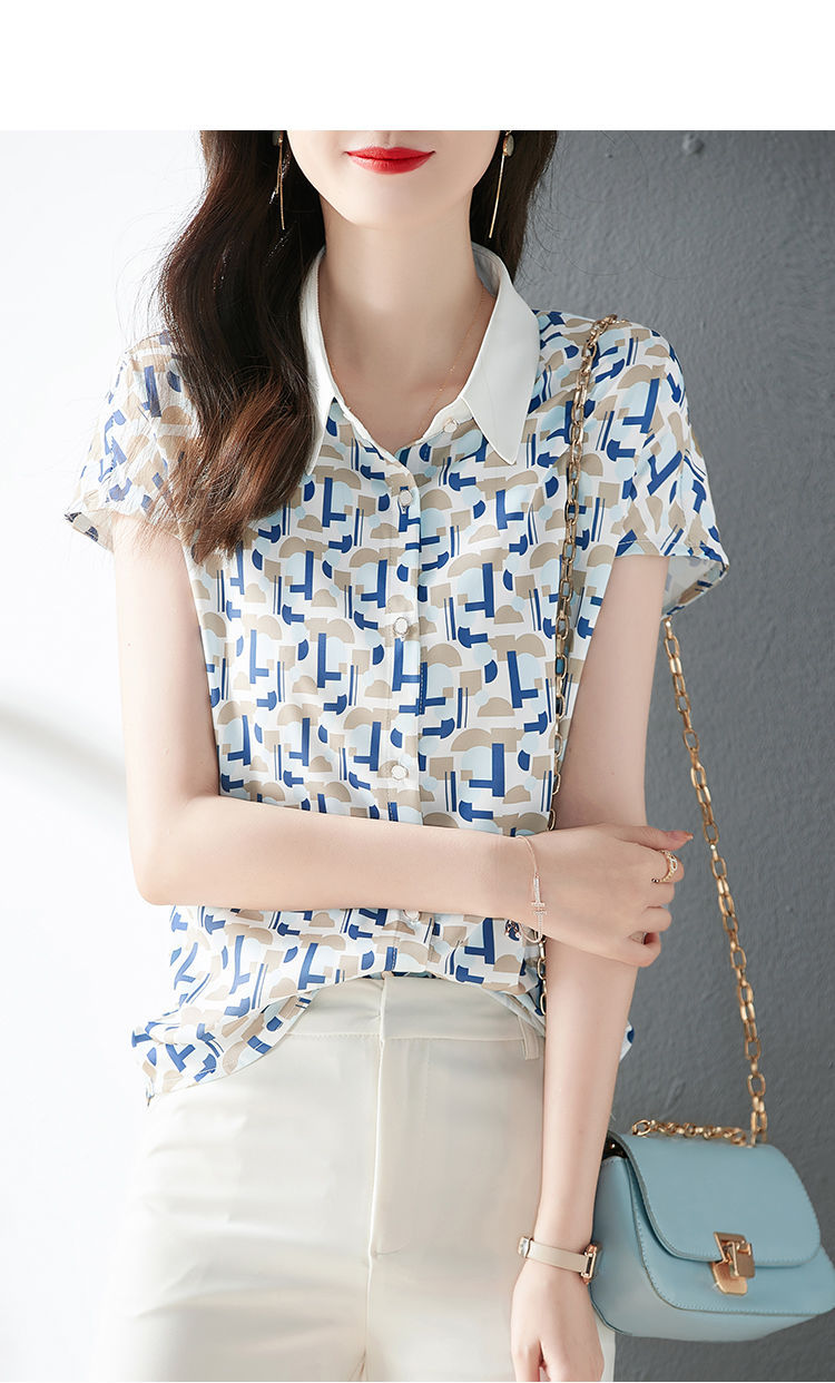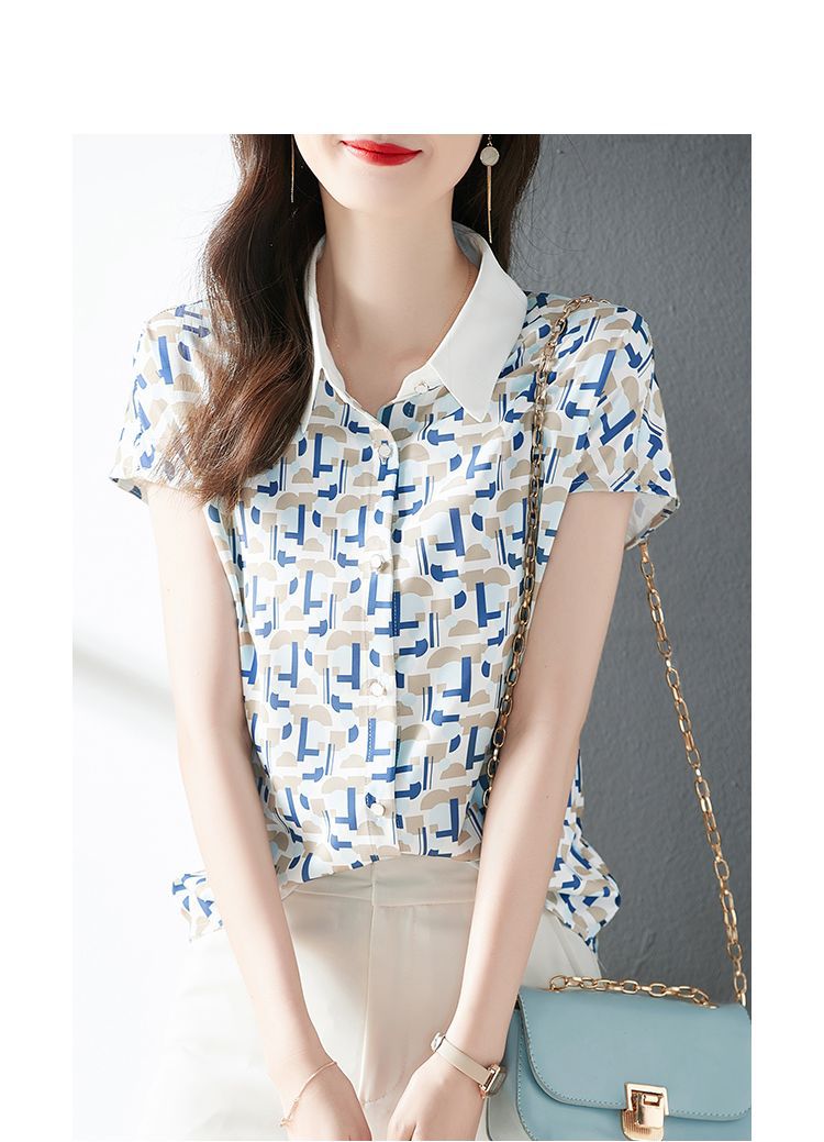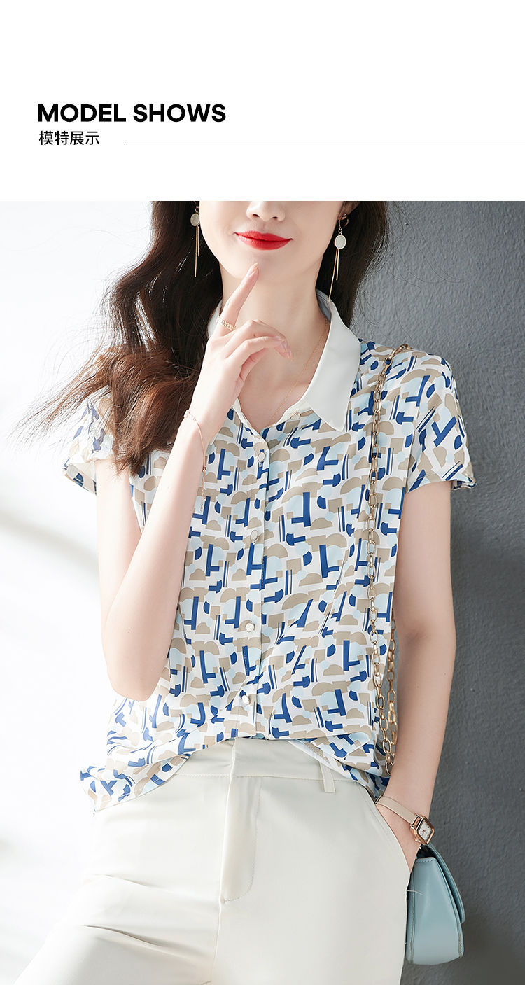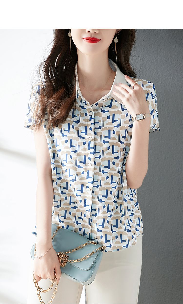 2023 여름 의류 새로운 간단한 모든 경기 기하학적 쉬폰 인쇄 소매 옷깃 패션 여성용 반소매 셔츠스토어 가기